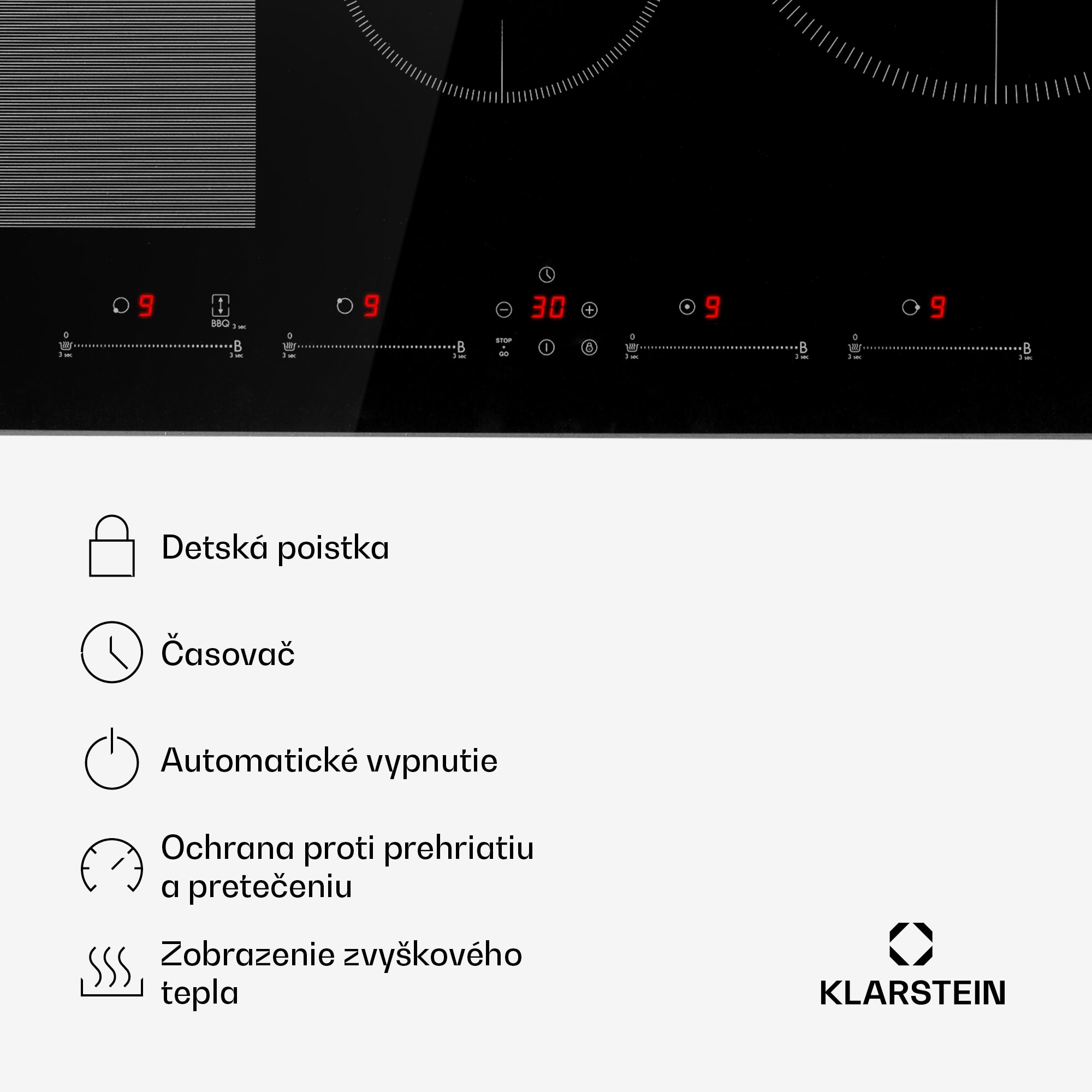 Jednoducho flexibilné varenie: Indukčná varná doska Klarstein Delicatessa 77 Hybrid umožňuje optimálne využitie priestoru s minimálnou spotrebou energie pri varení. Kombinuje pri tom technické inovácie s luxusným vzhľadom a prináša do kuchynskej linky so svojím sklokeramickým povrchom nový lesk. Vstavaná varná doska Klarstein Delicatessa 77 Hybrid ponúka štyri varné platne s celkovým výkonom až 7000 W (2 x 2000 W), ktoré sa rozdeľujú na 2 x 2000 W a 2 x 1500 W na jednotlivých varných plochách – vďaka čomu obsah hrncov a panvíc zovrie v špičkových časoch. Pritom sa zjednocujú obidve ľavé varné zóny do jednej flexi zóny pomocou funkcie VarioHeating: vďaka funkcii rozpoznania veľkosti hrnca sa s maximálnou flexibilitou prispôsobí veľkosti umiestnených hrncov, panvíc alebo kastrólov, a tak sa zohrieva aj veľký kuchynský riad, ktorý sa nezmestí na jednu varnú plochu. Na jednej strane zariadenie Delicatessa 77 Hybrid naozaj využíva len energiu, ktorá je vhodná pre daný hrniec, a na druhej strane umožňuje používať takmer akúkoľvek veľkosť hrnca alebo panvice. Zariadenie Delicatessa 77 Hybrid myslí aj na milovníkov veľkých panvicových jedál, ako napríklad paella. Pravá varná zóna má priemer 28 cm a poskytuje bez problémov dostatok potrebného miesta na veľké panvice. Výkon jednotlivých plôch a flexi plochy je možné ovládať samostatne a majú k dispozícii funkciu ThermoBoost, ktorá zvyšuje výkon s cieľom rýchleho zohriatia na 3000 W. Sklokeramická varná doska Klarstein Delicatessa 77 Hybrid sa jednoducho ovláda pomocou integrovaného dotykového panelu SenseControl s Touch-to-slide ovládaním výkonu posunutím prsta po ploche a pomocou digitálneho displeja. Takže ani gombíky a regulátory nenarúšajú povrch kuchynskej linky. Okrem výkonu sa dá naprogramovať aj časovač až na 99 minút pre každú varnú dosku. Časovač buď vypne varnú dosku po uplynutí nastaveného času, alebo vydá akustický signál. Aby počas varenia všetko prebiehalo hladko, vstavaný sporák Delicatessa 77 Hybrid má širokú škálu poistiek: Ochrana proti prehriatiu s automatickým vypnutím sa stane aktívnou, ak je varná platňa príliš horúca. Indikátor zvyškového tepla princípu EcoThermal Control vás informuje nielen o tom, či sú vypnuté varné plochy stále horúce. Umožňuje tiež varenie pomocou zvyškového tepla na úsporu energie. Funkcia ThermalRecall si pamätá nastavenú teplotu a použije sa, ak by bol proces varenia krátkodobo prerušený a neskôr by sa v ňom malo pokračovať. Okrem toho môže byť aktivovaný detský zámok, aby sa zabránilo náhodným zmenám nastavení varenia. Opticky indukčná varná doska Klarstein Delicatessa 77 Hybrid presviedča svojím ľahko udržiavateľným sklokeramickým povrchom, ktorý skúsene uvádza indukčný sporák na scénu. Týmto spôsobom sa varná doska hravo začlení do každej kuchyne – či už klasickej, alebo modernej. Materiál, potrebný na inštaláciu do pracovnej dosky, je priamo súčasťou balenia.