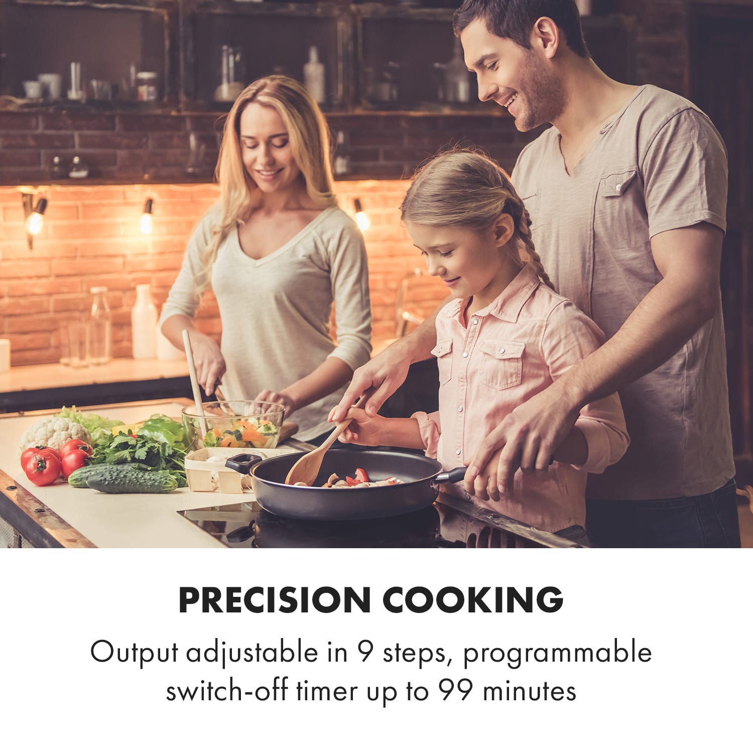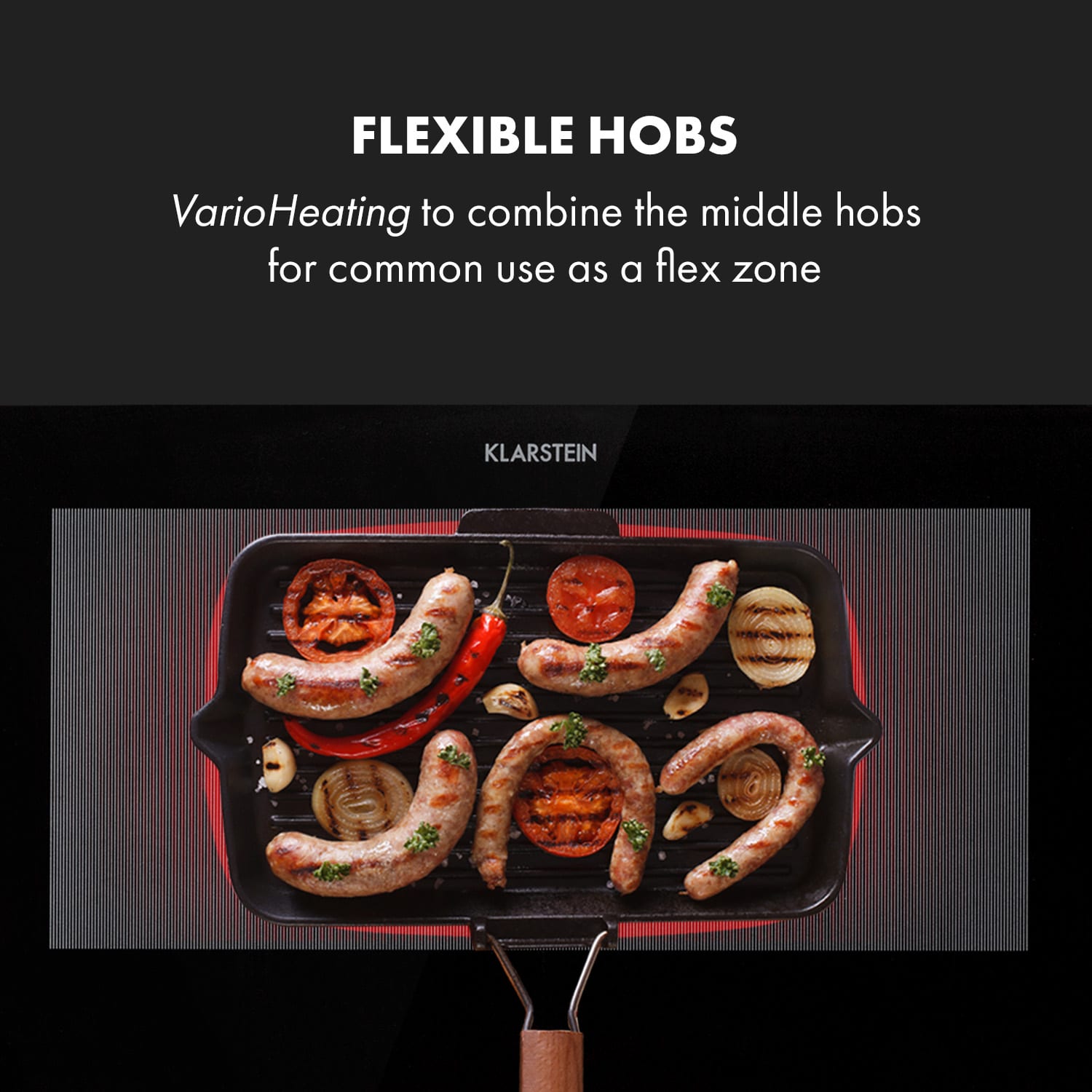 Jednoducho flexibilné varenie: Indukčná varná doska Klarstein Delicatessa 90 Slim umožňuje optimálne využitie priestoru s minimálnou spotrebou energie pri varení. Kombinuje pri tom technické inovácie s luxusným vzhľadom a prináša do kuchynskej linky so svojím sklokeramickým povrchom nový lesk.Vstavaná varná doska Klarstein Delicatessa 90 Slim ponúka štyri varné platne s celkovým výkonom až 7000 W, ktoré sa rozdeľujú na 2 x 2000 W a 2 x 1500 W na jednotlivých varných plochách a privádzajú obsah hrncov a panvíc do varu v špičkových časoch. Pritom sa zjednocujú obidve stredné varné zóny do jednej flexi zóny pomocou funkcie VarioHeating: vďaka funkcii rozpoznania veľkosti hrnca sa s maximálnou flexibilitou prispôsobí veľkosti hrncov, panvíc alebo kastrólov, a tak zohrieva aj veľký kuchynský riad, ktorý sa nezmestí na jednu varnú plochu. Výkon jednotlivých plôch a tiež flexi plochy je možné ovládať samostatne a majú k dispozícii funkciu ThermoBoost, ktorá zvyšuje výkon s cieľom rýchleho zohriatia až na 2800 W. Sklokeramická varná doska Klarstein Delicatessa 90 Slim sa jednoducho ovláda pomocou integrovaného dotykového panela SenseControl s ovládaním výkonu posunutím prsta po ploche a pomocou digitálneho displeja. Takže ani gombíky a regulátory nenarúšajú povrch kuchynskej linky. Okrem výkonu sa dá naprogramovať aj časovač až na 99 minút pre každú varnú dosku. Časovač buď vypne varnú dosku po uplynutí nastaveného času, alebo vydá akustický signál.Aby počas varenia všetko prebiehalo hladko, vstavaný sporák Delicatessa 90 Slim má širokú škálu poistiek a pomocných funkcií: Ochrana proti prehriatiu s automatickým vypnutím, indikátorom zvyškového tepla, funkciou udržania jedla v teple, s detskou poistkou a funkciou ThermalRecall na krátke prerušenie varenia.V kuchynskej linke zabudovaná varná doska Klarstein Delicatessa 90 Slim zaujme predovšetkým štíhlymi rozmermi s hĺbkou iba 35 cm. Vďaka tomu je perfektná na použitie s digestorom výsuvným z pracovnej dosky. Opticky zaujme indukčná varná doska svojím ľahko udržiavateľným sklokeramickým povrchom, ktorý skúsene uvádza indukčný sporák na scénu. Týmto spôsobom sa varná doska hravo začlení do každej kuchynskej linky – či už klasickej, alebo modernej.