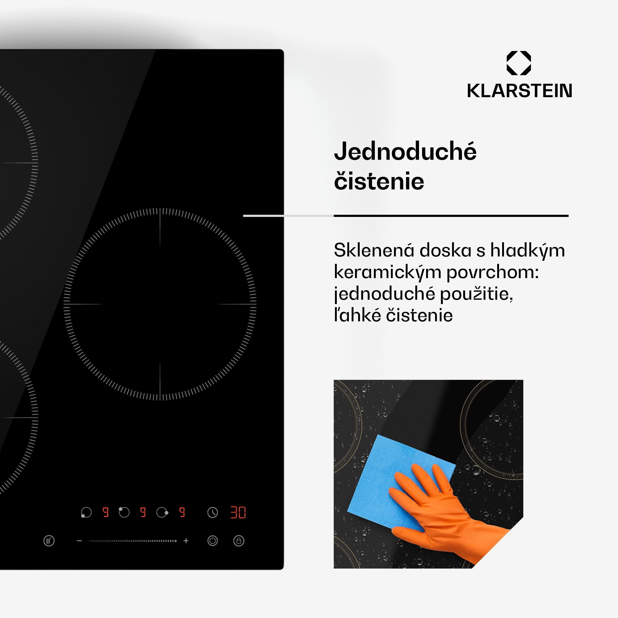 Objavte indukčnú varnú dosku Klarstein Delicatessa : Štíhla vstavaná indukčná varná doska so šírkou 45 cm a 3 varnými zónami pre kompaktné kuchynské linky. S celkovým výkonom 6600 W vrátane zosilňovačov v každej zóne ponúka rýchly ohrev a presné ovládanie vďaka posuvnému dotykovému ovládaniu a časovaču.Indukčná varná doska Klarstein Delicatessa ponúka užívateľsky prívetivé posuvné dotykové ovládanie, ktoré umožňuje presné ovládanie varných zón. Každá z 3 varných zón je vybavená výkonným posilňovačom, ktorý výrazne skracuje čas varenia. Indikátor zvyškového tepla varuje pred horúcimi povrchmi a poskytuje dodatočnú bezpečnosť po varení. Funkcia časovača umožňuje nastaviť čas varenia pre každý pokrm osobitne. Vďaka detskej poistke je varná doska obzvlášť bezpečná v domácnostiach s deťmi. Sklokeramický povrch je nielen elegantný, ale aj ľahko sa čistí a poskytuje maximálnu bezpečnosť pri varení.Čistenie keramického skleneného povrchu je rýchle a jednoduché. Pred použitím si prečítajte priložený návod na použitie, kde nájdete dôležité bezpečnostné pokyny.Premeňte svoju kuchyňu na skutočnú oázu varenia s indukčnou varnou doskou Klarstein Delicatessa .