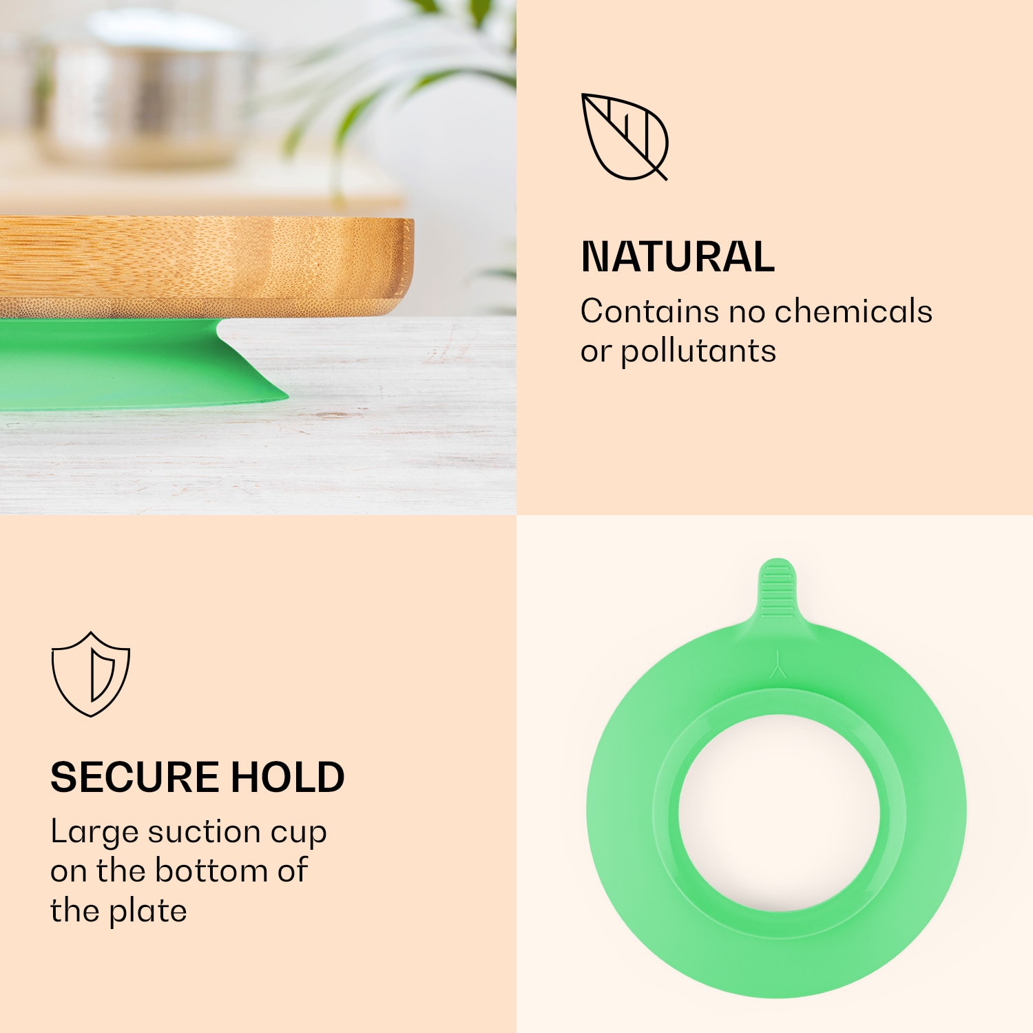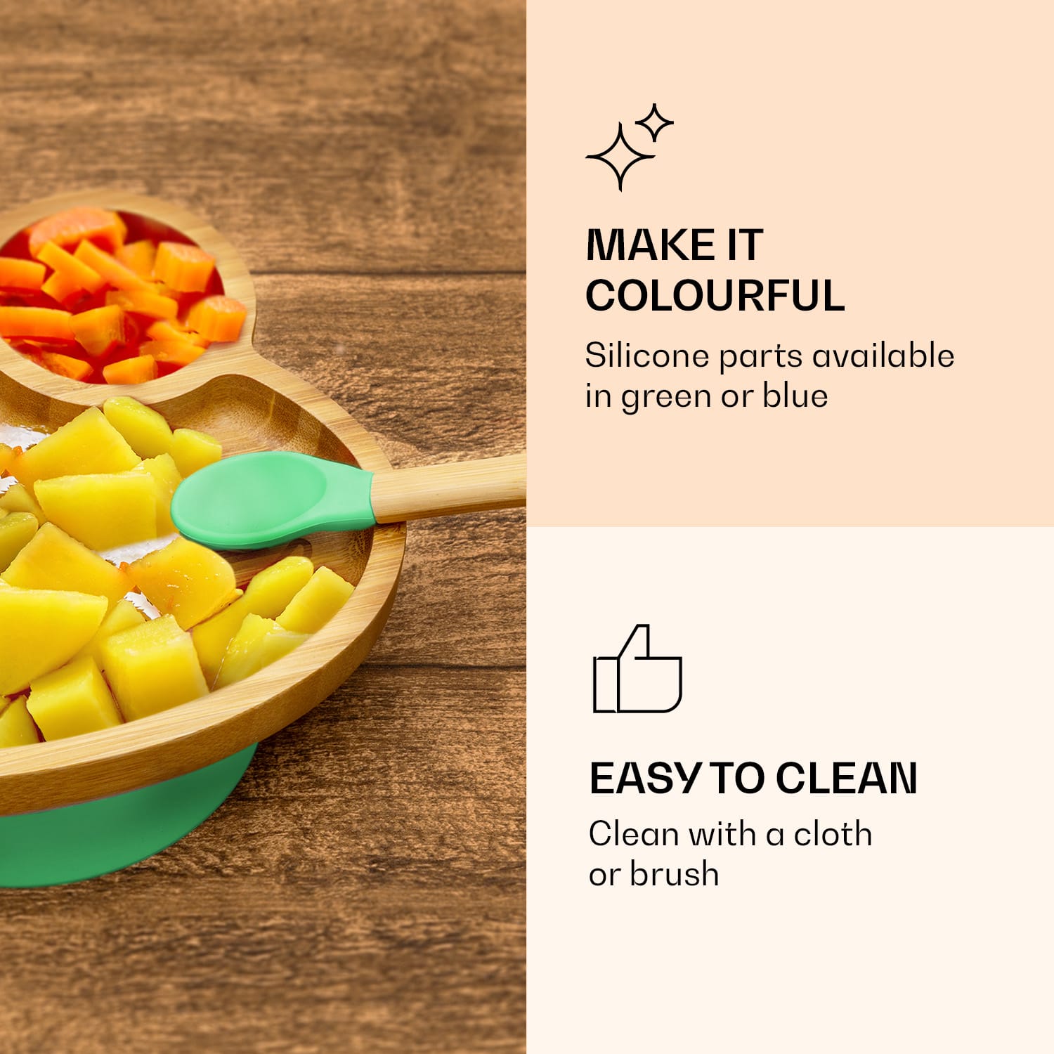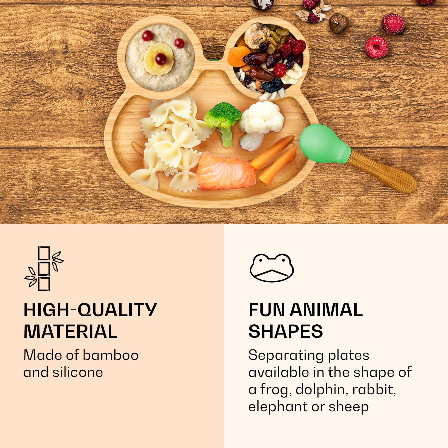 Hra a zábava pri jedle! Detský riad s bambusovým tanierom a lyžičkou od spoločnosti Klarstein bambuswald je takmer nezničiteľný! Postará sa o to robustný bambusový materiál a silikónová prísavka, ktorá pripevňuje plytký tanier k stolu. Malým gurmánom urobia radosť predovšetkým veselé zvieracie tvary taniera: so žabkou, zajacom, ovečkou, slonom alebo delfínom sa predsa je oveľa zaujímavejšie! Všetky delené taniere sú vyrobené z prírodného bambusového materiálu a neobsahujú žiadne chemikálie ani škodlivé látky. Kontroly kvality okrem toho zaručujú, že sa k potravinám nedostáva žiadny zápach ani chuť. Riad preto môžeš kedykoľvek naplniť teplými aj studenými, pevnými aj tekutými potravinami. Motivujúca učebná jedálenská súprava – pozostáva z taniera a farebne zladenej lyžičky – je skvelým tipom na darček pre novopečených rodičov a ich malých potomkov.