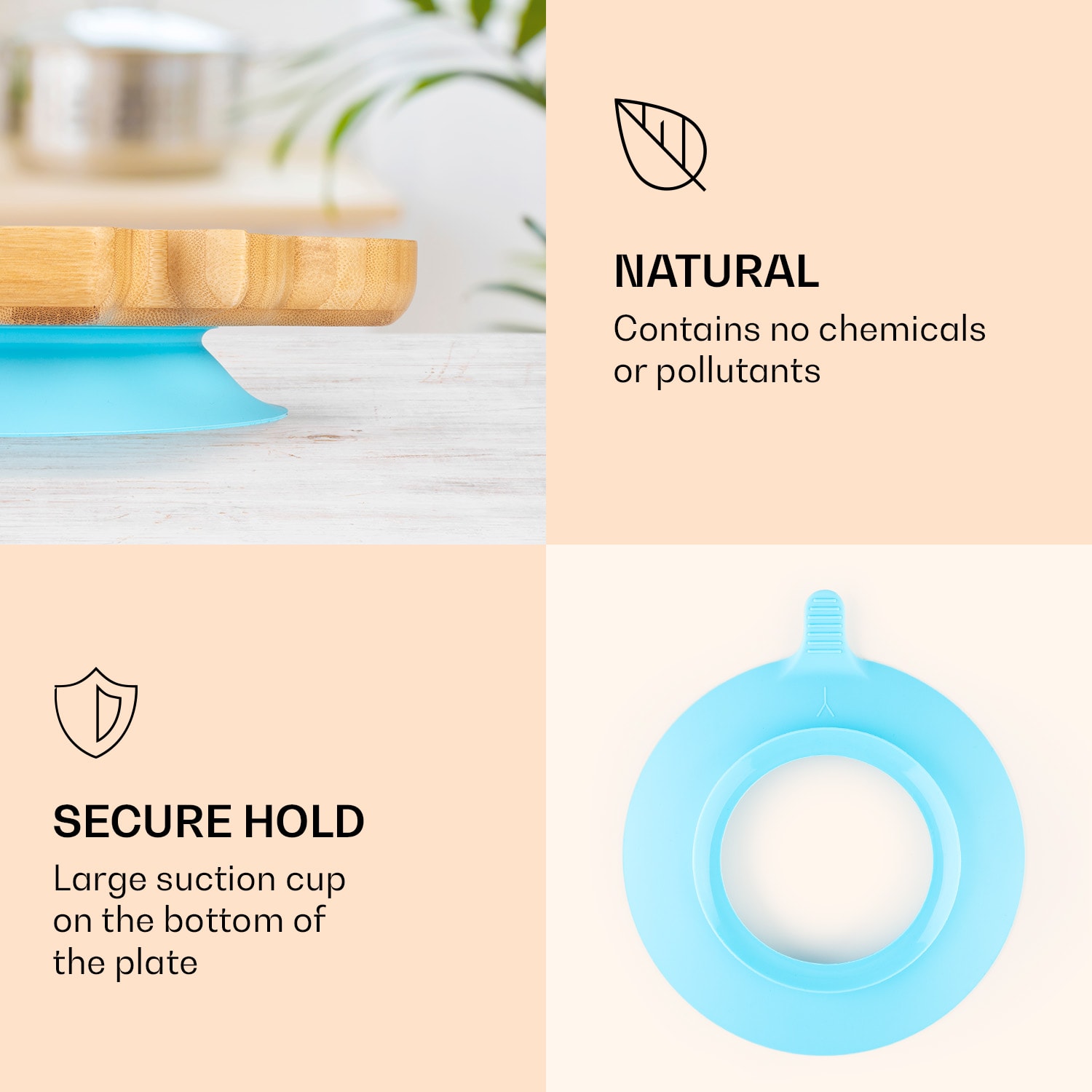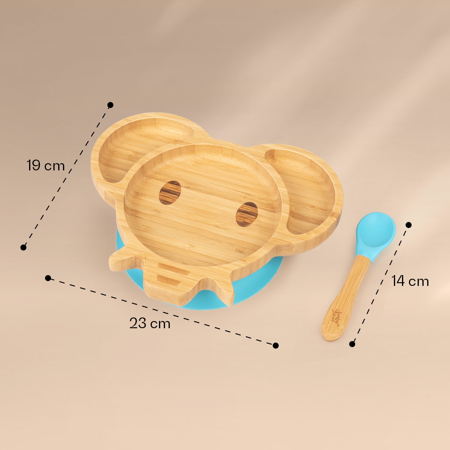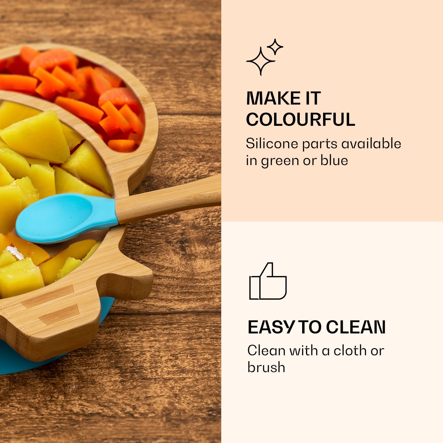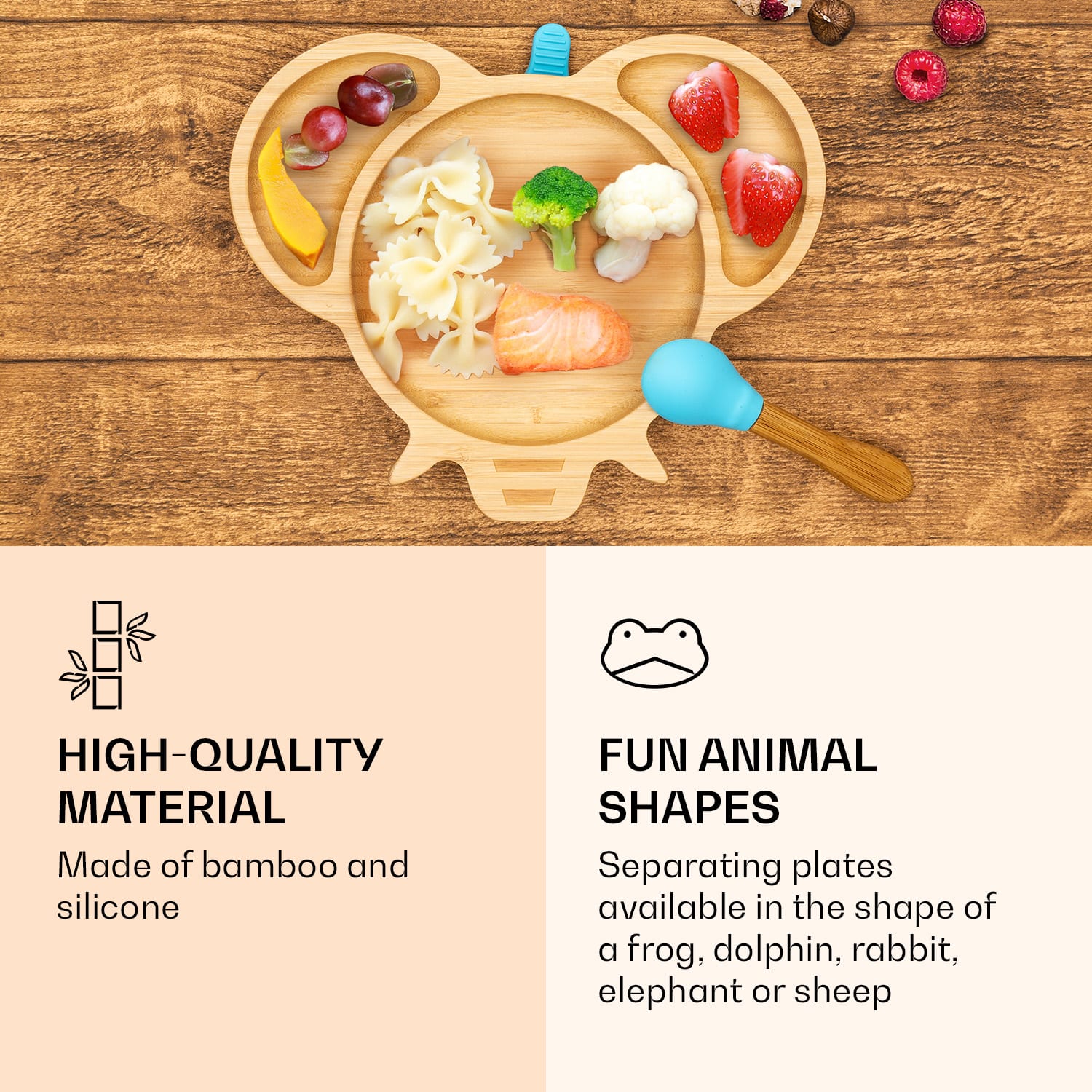 Hra a zábava pri jedle! Detský riad s bambusovým tanierom a lyžičkou od Klarstein bambuswaldu je takmer nezničiteľný! Postará sa o to robustný bambusový materiál a silikónová prísavka, ktorá pripevňuje plytký tanier k stolu. Malým gurmánom urobia radosť predovšetkým veselé zvieracie tvary taniera: so žabkou, zajacom, ovečkou, slonom alebo delfínom sa predsa je oveľa zaujímavejšie! Všetky delené taniere sú vyrobené z prírodného bambusového materiálu a neobsahujú žiadne chemikálie ani škodlivé látky. Kontroly kvality okrem toho zaručujú, že sa k potravinám nedostáva žiadny zápach ani chuť. Riad preto môžeš kedykoľvek naplniť teplými aj studenými, pevnými aj tekutými potravinami. Motivujúca učebná jedálenská súprava – pozostáva z taniera a farebne zladenej lyžičky – je skvelým tipom na darček pre novopečených rodičov a ich malých potomkov.