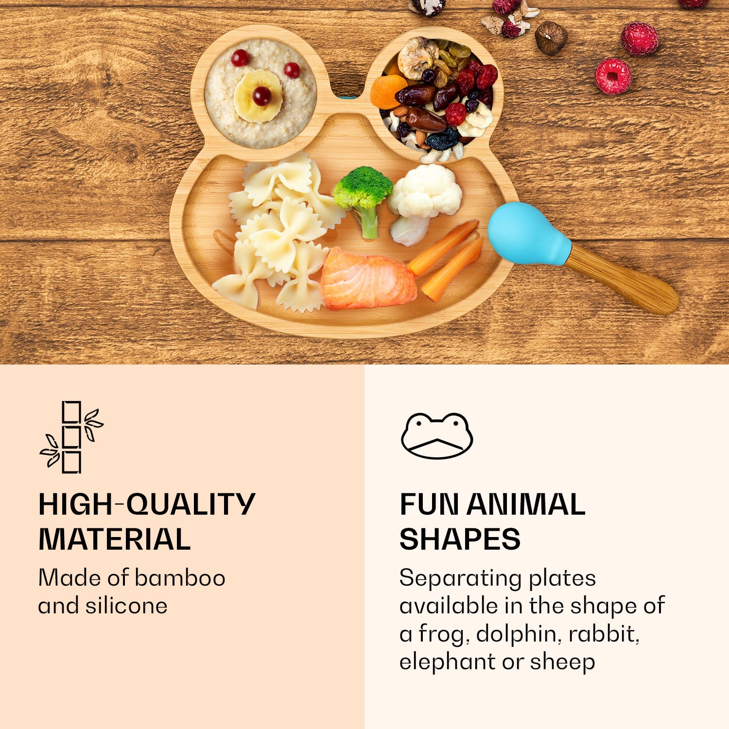 Hra a zábava pri jedle! Detský riad s bambusovým tanierom a lyžičkou od Klarstein bambuswaldu je takmer nezničiteľný! Postará sa o to robustný bambusový materiál a silikónová prísavka, ktorá pripevňuje plytký tanier k stolu. Malým gurmánom urobia radosť predovšetkým veselé zvieracie tvary taniera: so žabkou, zajacom, ovečkou, slonom alebo delfínom sa predsa je oveľa zaujímavejšie! Všetky delené taniere sú vyrobené z prírodného bambusového materiálu a neobsahujú žiadne chemikálie ani škodlivé látky. Kontroly kvality okrem toho zaručujú, že sa k potravinám nedostáva žiadny zápach ani chuť. Riad preto môžeš kedykoľvek naplniť teplými aj studenými, pevnými aj tekutými potravinami. Motivujúca učebná jedálenská súprava – pozostáva z taniera a farebne zladenej lyžičky – je skvelým tipom na darček pre novopečených rodičov a ich malých potomkov.