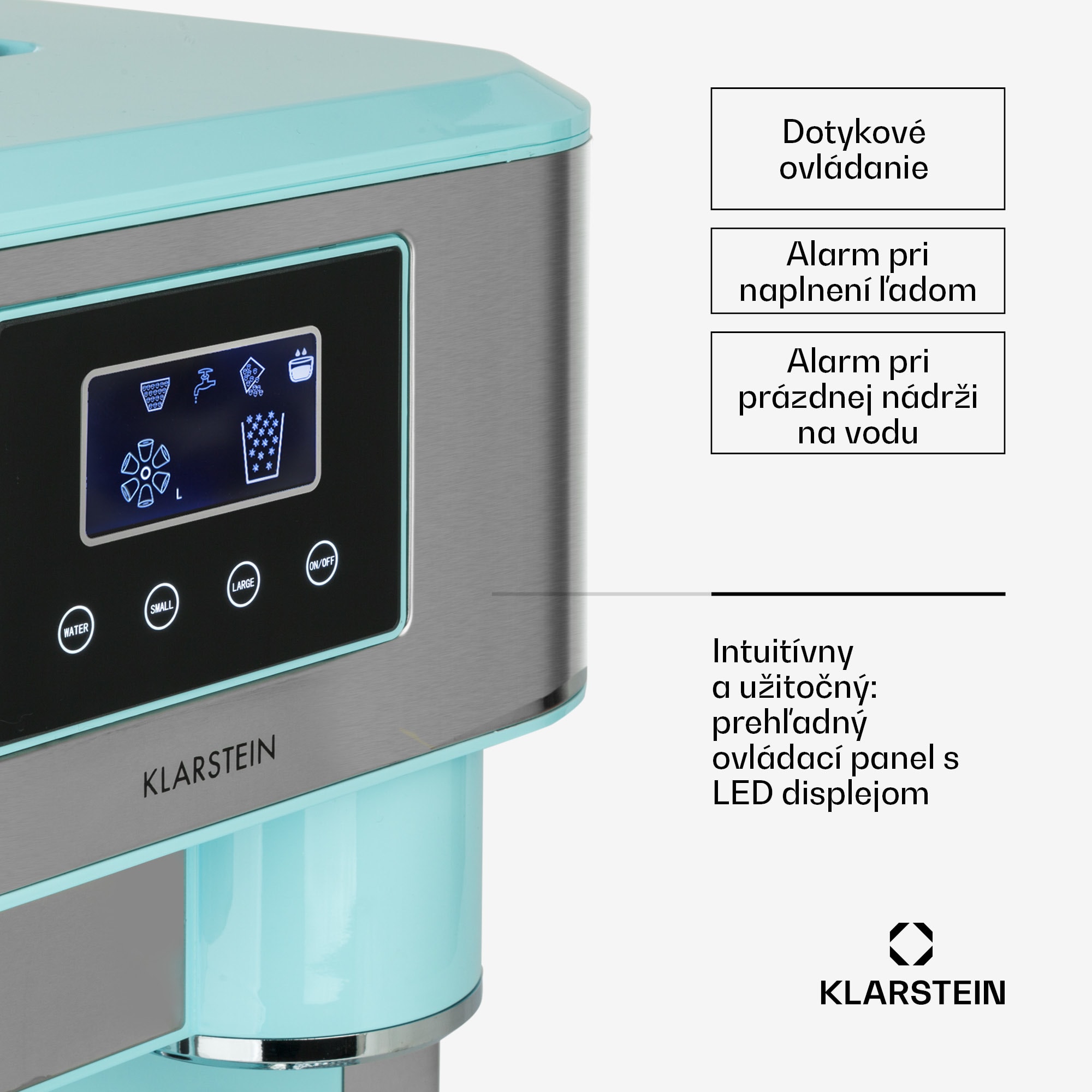 Vychutnávať si nonstop chutné a ľadovo vychladené nápoje: Klarstein Eiszeit Crusch s tromi funkciami a dvomi veľkosťami ľadových kociek, vám to umožní.Výkonný modrý výrobník ľadu Eiszeit Crush produkuje denne 15 – 18 kg kociek ľadu. Je teda vhodný na domáce použitie, ako aj na párty alebo záhradné oslavy. Ovládanie výrobníka ľadu prebieha jednoducho a pohodlne pomocou ovládacieho panela s tlačidlami pod prehľadným LCD displejom, pričom je možné vyrobiť malé aj veľké kocky ľadu vo veľkostiach small a large. Vďaka svojim trom rôznym funkciám vyrába zariadenie Eiszeit Crush nielen kocky ľadu, ale pripravuje – ako už názov napovedá – okrem ľadovej vody aj drvený ľad. Veľká nádrž na vodu s objemom 1,8 litra a zásobník na ľad s kapacitou 600 g kociek ľadu sú pripravené na prípravu akéhokoľvek množstva ľadových nápojov. Prívod vody prebieha ručne alebo pripojením k vodovodnému kohútiku pomocou dodávanej hadice. Keď je zásobník na ľad plný alebo hladina vody je príliš nízka, z výrobníka ľadu zaznie alarm, aby ste mohli rýchlo zareagovať. Po použití sa dá odolná konštrukcia s prednou časťou z ušľachtilej ocele ľahko vyčistiť, nadčasový dizajn sa pritom začlení do každého prostredia.Čas na ľadové osvieženie: vychutnajte si so zariadením Klarstein Ice Crush úžasné nápoje.