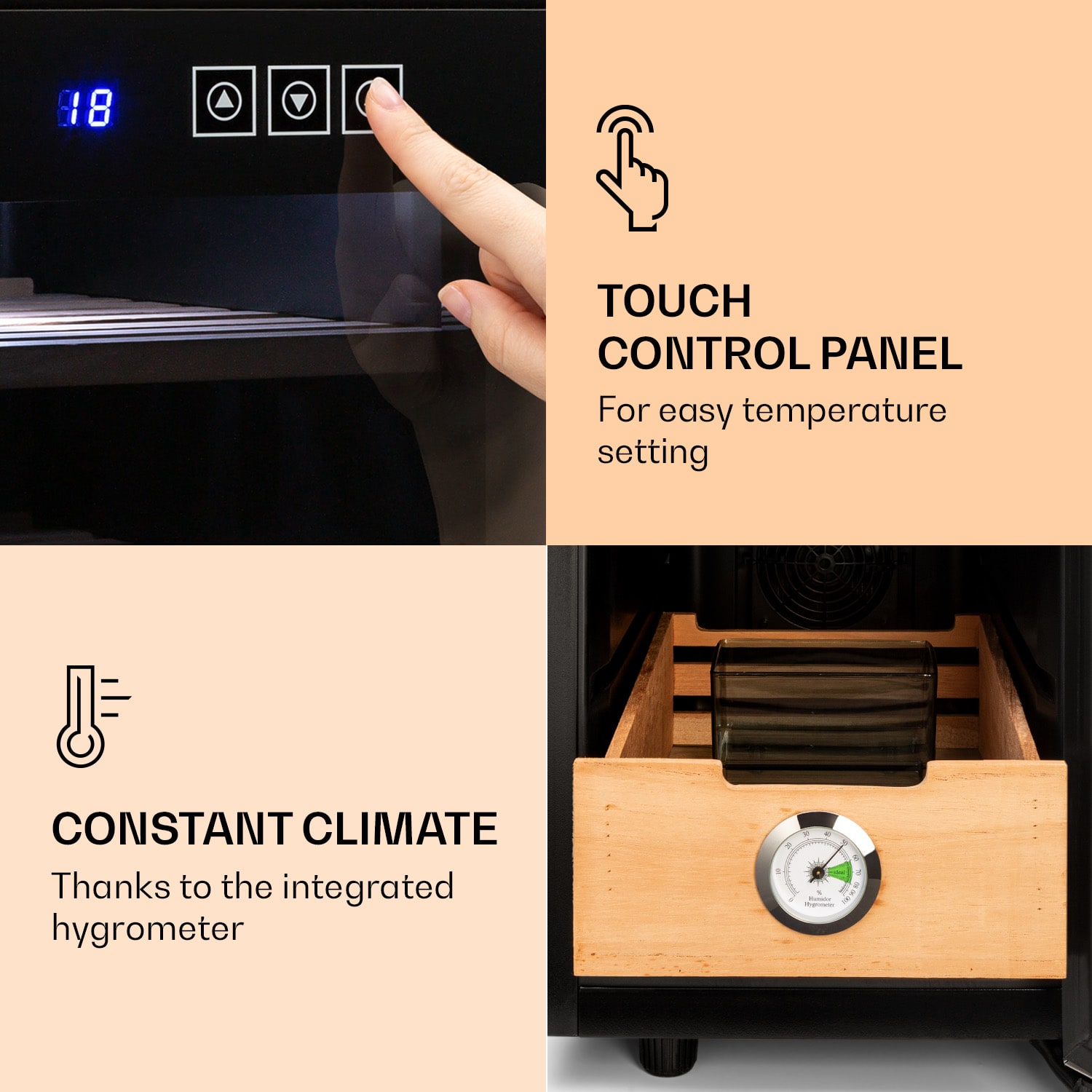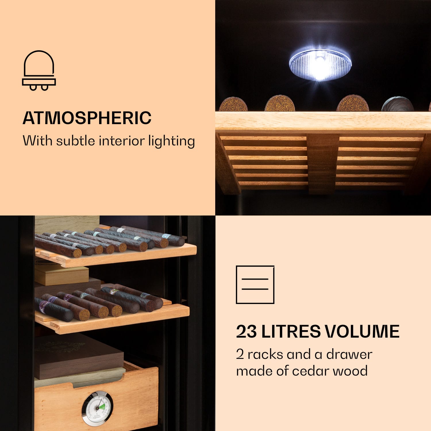 Špičkový produkt pre každého milovníka cigár: humidor Klarstein El Presidente 23 sa postará o ideálne skladovacie podmienky s konštantnou vlhkosťou a teplotou, aby luxusné cigary nestratili nič zo svojej chuti.Vo svojom veľkom 23 litrovom vnútornom priestore na 2 skladovacích plochách a s jednou zásuvkou z cédrového dreva si vaše cigary nájdu svoje miesto. Aj svojim zovňajškom presviedča El Presidente 23 s elegantným dizajnom, dvojitými presklenými dvierkami ako aj kompaktnými rozmermi. Vďaka vysokému prezentačnému faktoru sa zvlhčovač hodí na vystavenie do barov alebo klubov.