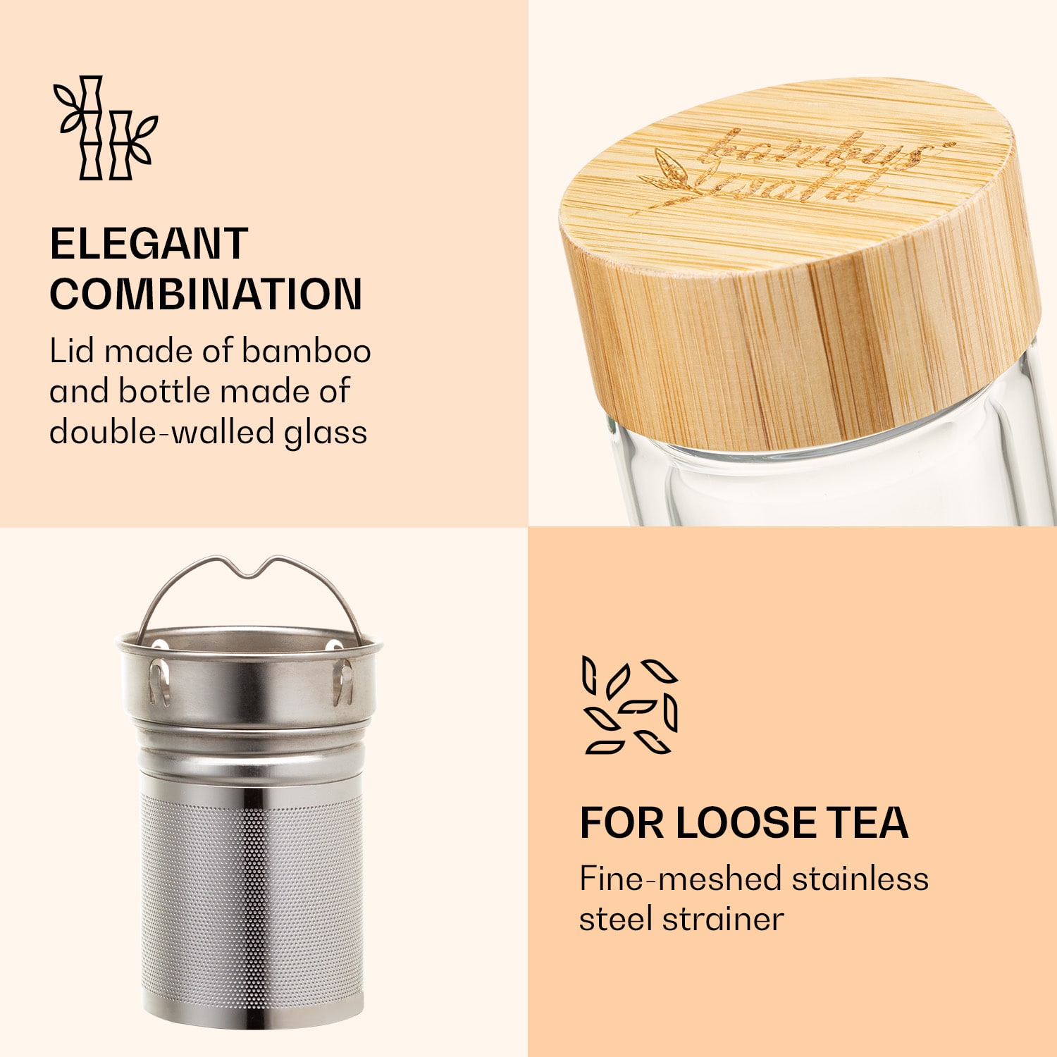Klarstein Fľaša na čaj, s uzáverom a sitom, 500 ml, dvojité sklo, bambusový kryt