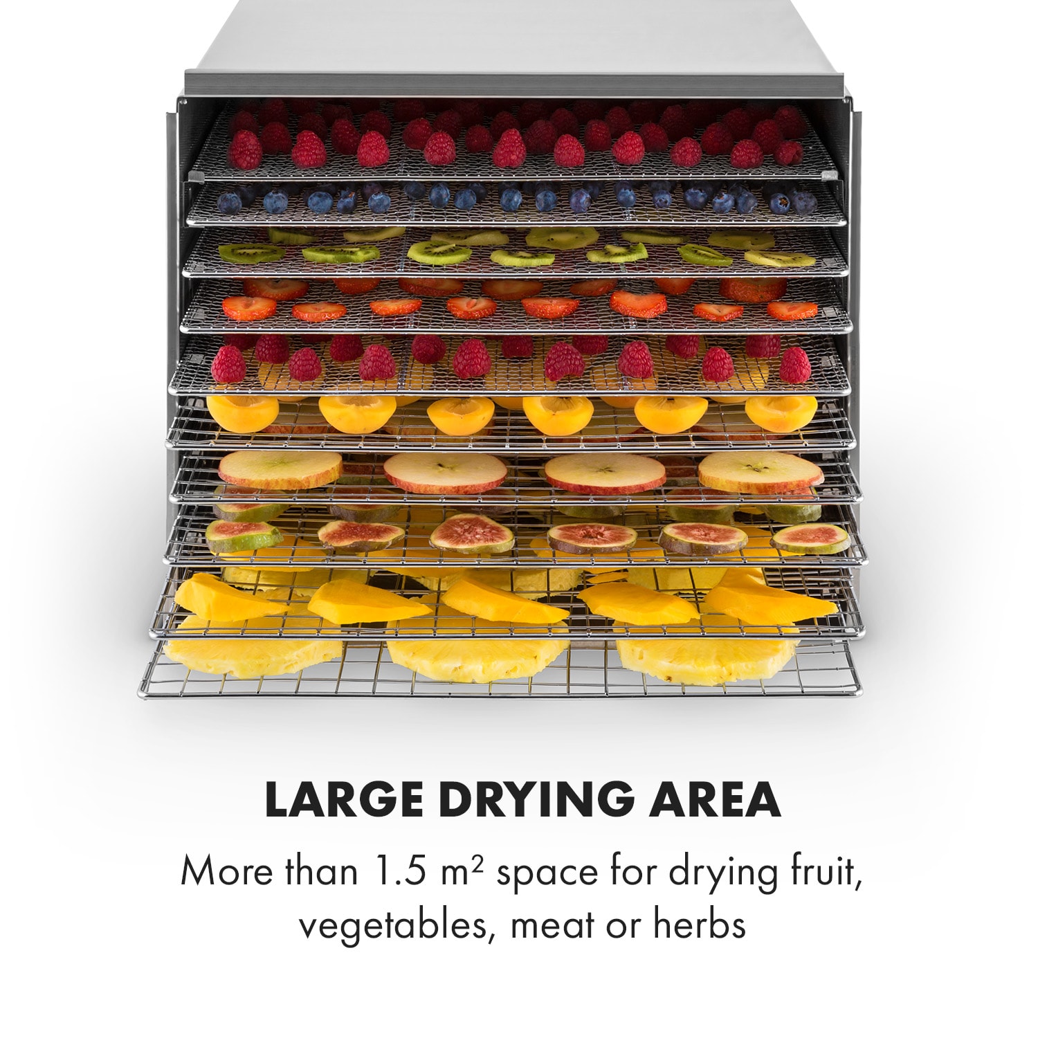 Zdravé, chutné a plné energie: Klarstein Fruit Jerky Steel 6 sušička potravín prináša do jedálneho lístka rozmanité občerstvenie – vyrobené vo vlastnej réžii. Výkon 1000 W umožňuje rovnomernú cirkuláciu horúceho vzduchu medzi 6 úrovňami pomocou tichého ventilátora. Teplotu možno plynule nastaviť až do 68 °C pomocou ovládacieho kolieska. S celkovou plochou 0,65 m² nie je príprava väčších množstiev žiadnym problémom. Je vyrobená výlučne z brúsenej nehrdzavejúcej ocele, takže nielen dobre vyzerá, ale sa aj veľmi ľahko čistí. Či už pripravujete sušené ovocie, mäso alebo ryby, sušička potravín Klarstein Fruit Jerky Steel 6 premení čerstvé potraviny na trvanlivé pochúťky bez straty vitamínov, minerálov a ďalších cenných zložiek.