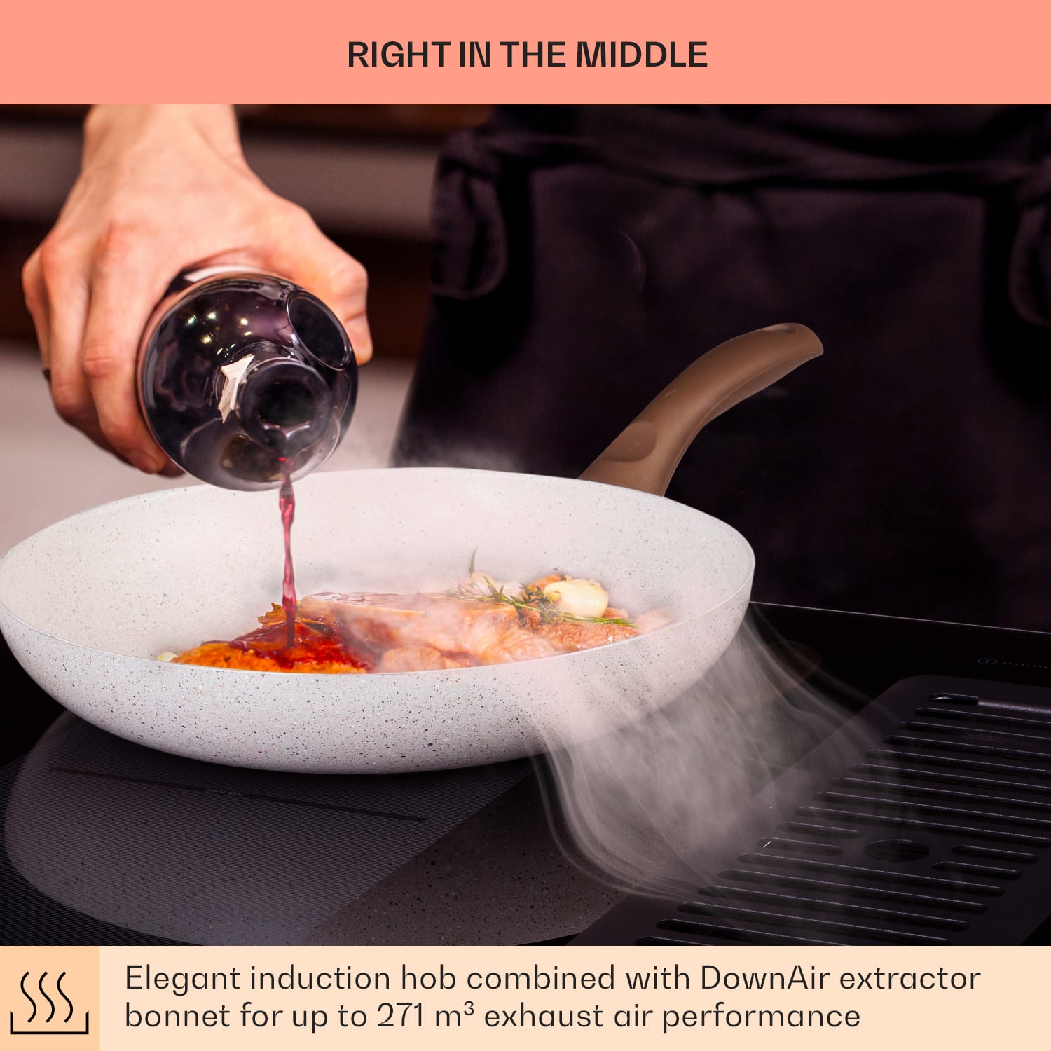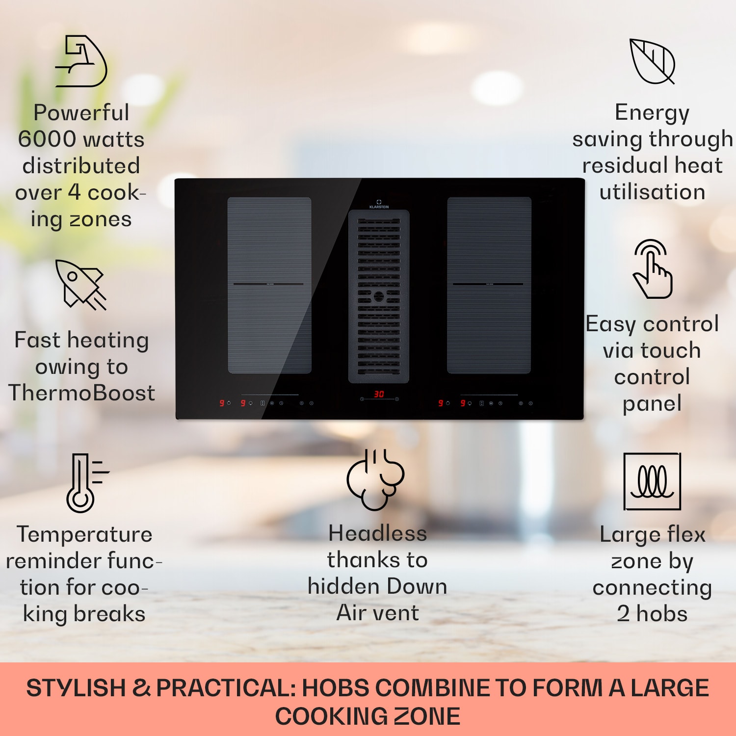 Uprostred a nie len pri tom: Klarstein Full House DownAir System spôsobí revolúciu vo vašej kuchyni! Kombinuje svoju indukčnú varnú dosku priamo s DownAir digestorom. Para a zápach v kuchyni tak zmiznú priamo tam, kde vznikajú. Indukčná varná doska Full House od Klarstein sa prezentuje štyrmi varnými platňami, vľavo a vpravo od integrovaného DownAir digestora. Dve varné platne možno spojiť do flexi zóny, ktorá poskytne potrebný priestor aj pre veľké hrnce a panvice. Každú varnú dosku možno nastaviť na 9 úrovní a disponujú funkciou ThermoBoost na zvýšenie výkonu pre veľmi rýchle varenie. Rozpoznanie hrnca, funkcia Stop and Go s ThermalRecall funkciou, rozpoznanie zvyškového tepla, detská poistka a funkcia udržiavania teploty dokonale dopĺňajú možnosti využitia varnej dosky.Odsávací systém DownAir s výkonom 477 m³/h je priamo súčasťou varnej plochy a odsáva paru a kuchynské výpary priamo smerom nadol. Prístupu k hrncom a panviciam nebráni žiadny digestor, takže systém je ideálny najmä do kuchynských ostrovčekov. Varná doska ako aj odsávač pár sa ovládajú pomocou dotykového ovládacieho panela SenseControl s osvetlenými posuvníkmi. Bezchybný sklokeramický povrch kompletného systému Full House od Klarstein nenarušia žiadne tlačidlá.Enjoy your new kitchen!Upozornenie: Odporúčame, aby montáž systému Klarstein Full House Down Air System vykonával kvalifikovaný personál v súlade s návodom na obsluhu.
