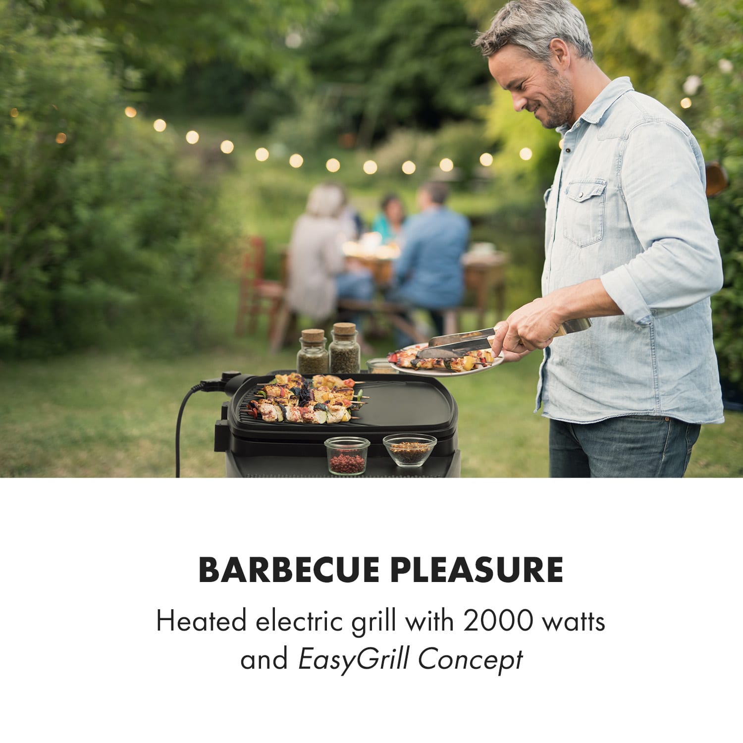 Elektrický gril Klarstein Gatsby je ideálnym riešením pre tých, ktorí chcú usporadúvať na balkóne grilovacie párty so steakami alebo zeleninou. S elektrickým grilom nie je grilovanie na balkóne vôbec žiaden problém vďaka koncepcii EasyGrill Concept, pretože pri grilovaní nevzniká žiaden nepríjemný dym!Plynule regulovateľný elektrický gril s vykurovacím výkonom 2000 W presvedčí ako stolový alebo stojanový gril vo vnútri aj vonku. Pre vonkajšie použitie sa jednoducho namontuje stojan so štyrmi robustnými nohami z ušľachtilej ocele a grilovanie v exteriéri môže začať. A aby sa nič nepripálilo a tiež aby sa elektrický gril Gatsby ľahko čistil, má grilovacia doska s rozmerom 40 x 36 cm kvalitný povrch z tlakovo liateho hliníka s nelepivou vrstvou. Vytekajúci tuk tečie cez otvory na grilovacej ploche a kvapká do vaničky pod ňou. Aby sa podarilo aj bravčové mäso „Pulled Pork“ a iné BBQ špeciality, zariadenie Gatsby má aj kryt grilu z ušľachtilej ocele s nelepivým povrchom a tiež tepelne izolované držadlo. Dva praktické bočné stolíky, každý s rozmerom 20 x 32 cm, umožňujú pohodlné grilovanie. Ľahko sa tu dajú uložiť koreniny, omáčky, grilované jedlo, grilovacie náradie alebo nápoje. Chňapky, uterák alebo kliešte na grilovanie sa, samozrejme, dajú zavesiť na tri háčiky. Ak niekomu tento priestor nestačí, pomôže aj polica s rozmerom 55 x 47 cm v stojane zariadenia, napríklad na viac nápojov alebo ďalšie jedlo. Vďaka dvom kolesám sa dá gril jednoducho presúvať. Elektrický gril Gatsby od spoločnosti Klarstein je skvelý spoločník na grilovacie párty vnútri aj vonku.