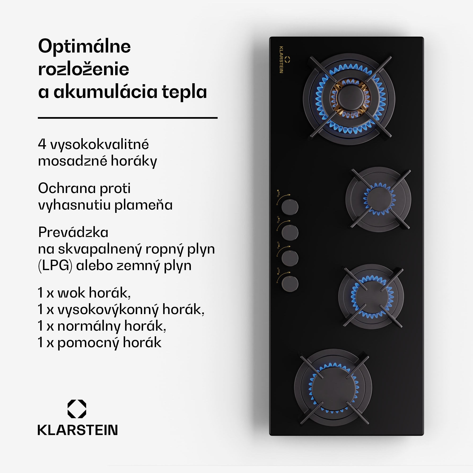 Pre náročných kuchárov Klarstein predstavuje plynovú varnú dosku Goldflame 4 Slim, ktorá spája výhody varenia na plyne s účinnosťou, ovládateľnosťou a šetrnosťou k životnému prostrediu. Vďaka štyrom vysokokvalitným mosadzným horákom (3,4 kW, 2 x 1,8 kW, 1,0 kW) poskytuje priestorovo úsporná varná doska optimálny ohrev. Štíhly dizajn optimalizuje priestor v zadnej časti kuchynskej linky umiestnením horákov vedľa seba. Toto usporiadanie poskytuje pohodlie pri prenášaní hrncov a panvíc a znižuje riziko popálenia. Odolnosť a rovnomerná distribúcia tepla horákov podčiarkujú kvalitné spracovanie. Robustné liatinové rošty zaisťujú stabilné uchytenie rôznych typov kuchynského riadu.Vďaka intuitívnemu ovládaniu pomocou veľkých otočných gombíkov so zrozumiteľnými symbolmi sa obsluhuje bez námahy. Jednou z výhod varenia na plyne je presné nastavenie veľkosti plameňa, ktoré má priamy vplyv na teplotu varenia. Zapaľovanie SnapJet umožňuje elektrické zapaľovanie bez zapaľovača alebo zápaliek. Ochrana proti zlyhaniu plameňa zaisťuje bezpečnosť tým, že automaticky vypne plyn, keď plameň zhasne.Plynová varná doska Klarstein sa po varení ľahko čistí vďaka 8 mm hrubému tvrdenému sklokeramickému povrchu v čiernej farbe – elegantná a ľahko sa čistí.