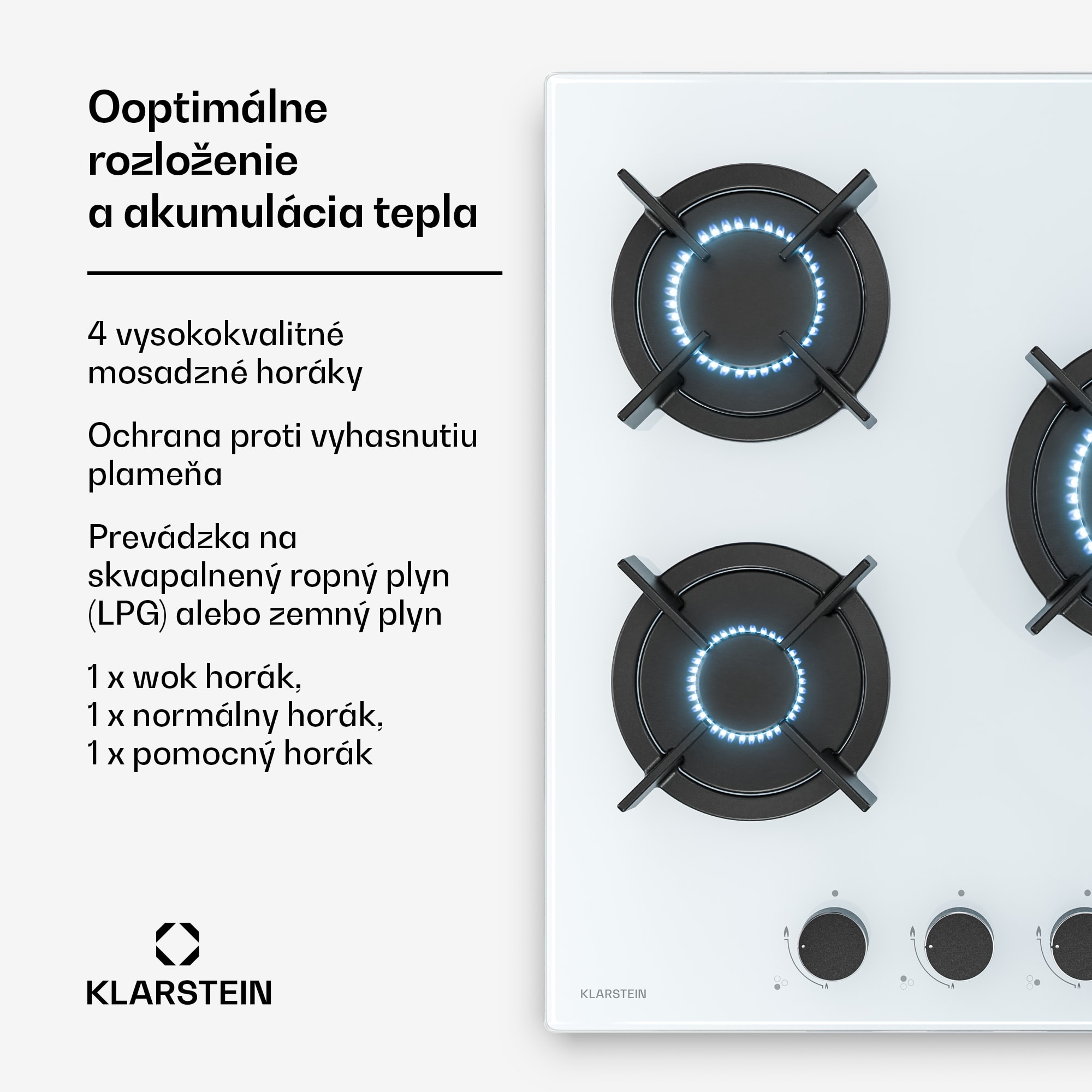 Plynová varná doska Klarstein Goldflame kombinuje atraktívny dizajn s vysokým výkonom a intuitívnym ovládaním.Plynová varná doska so skleneným povrchom a mosadznými horákmi kombinuje vysoko kvalitné a odolné materiály s ľahko čistiteľným povrchom.Tri výkonné, vysokokvalitné horáky s celkovým výkonom 5800 W zaručujú plynulé varenie.Vďaka otočným gombíkom sa táto priestorov šetrná plynová varná doska ľahko ovláda a automatické zapaľovanie robí zápalky alebo zapaľovač zbytočným.Varnú dosku je možné prevádzkovať na LPG aj zemný plyn. Je tiež vybavený ochranou proti zhasnutiu plameňa, ktorá zaisťuje bezpečné prevádzku.