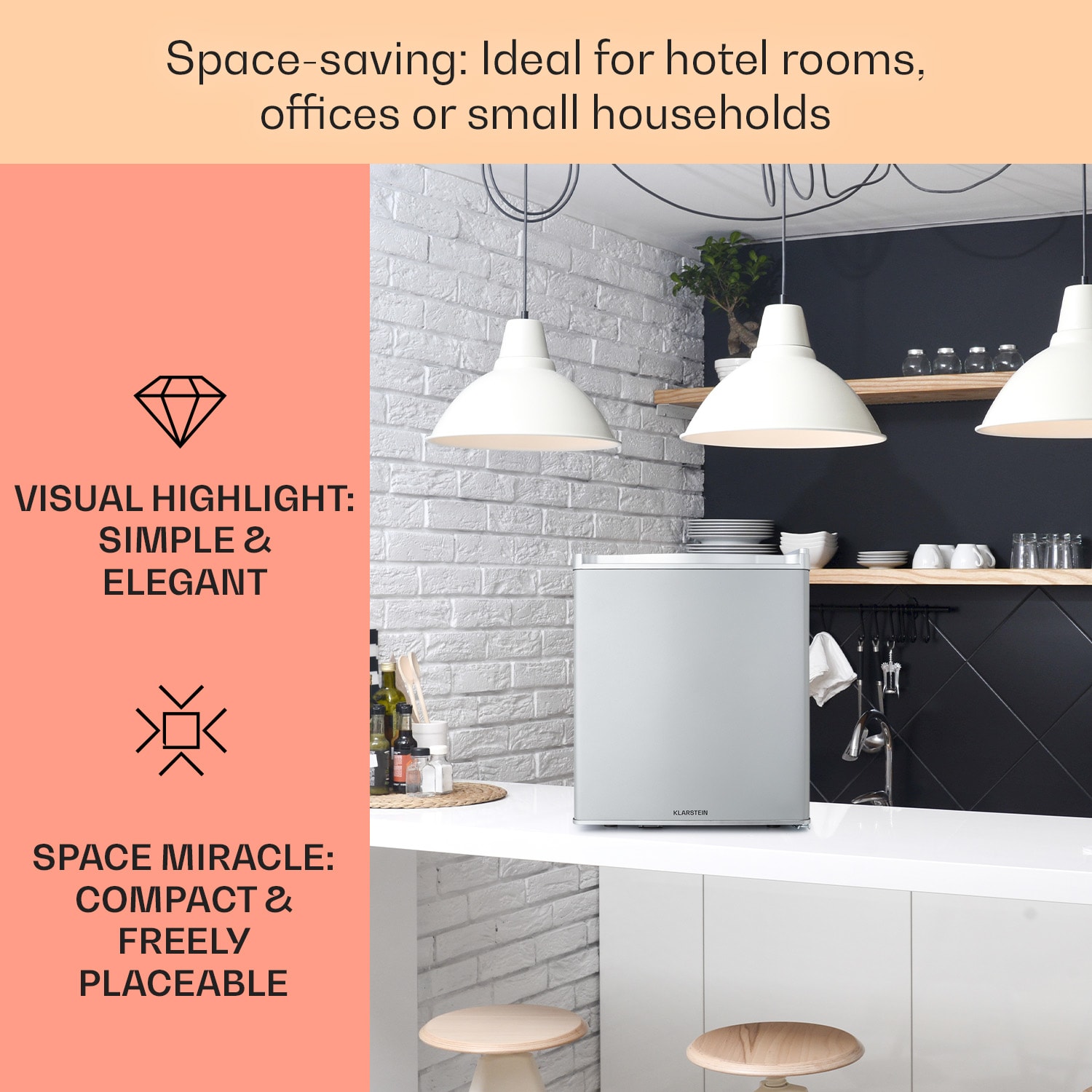 Uchovávajte chladené občerstvenie a nápoje priestorovo úsporným spôsobom: chladnička Happy Hour 38 od Klarstein je ideálna pre malé domácnosti, pre spoločné izby alebo kancelárie ale najmä pre spálne a hosťovské izby vďaka svojej mimoriadne tichej prevádzke s hlučnosťou len 26 dB a kompaktným rozmerom. Táto Mini chladnička s 38-litrovým interiérom má na 3 policiach priestor na všetky druhy jedál, nápojov a potravín. Dve mriežkové police možno použiť na troch zásuvkách podľa potrieb obsahu chladničky, zatiaľ čo vajcia, maslo a tiež veľké fľaše s nápojmi do 2 litrov možno uložiť do dverových priehradiek.Vždy dokonale vychladené: chladnička Happy Hour 38 od Klarstein je priestorovo úsporný dizajnový zázrak, ideálna na skladovanie potravín.
