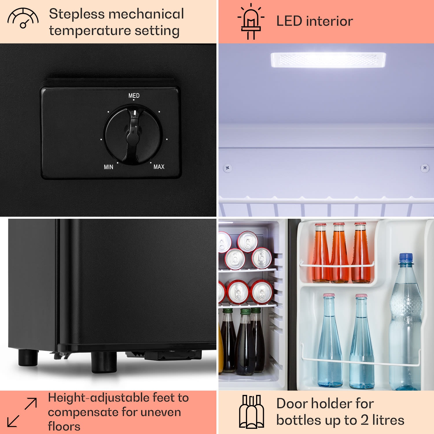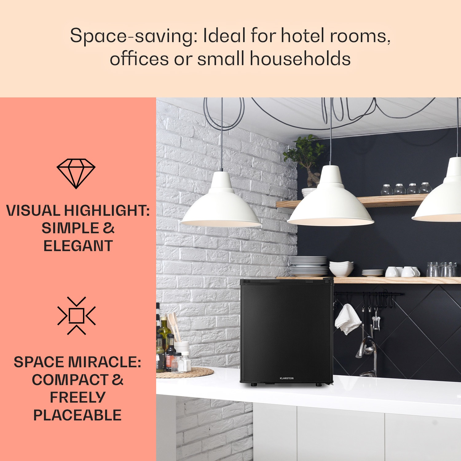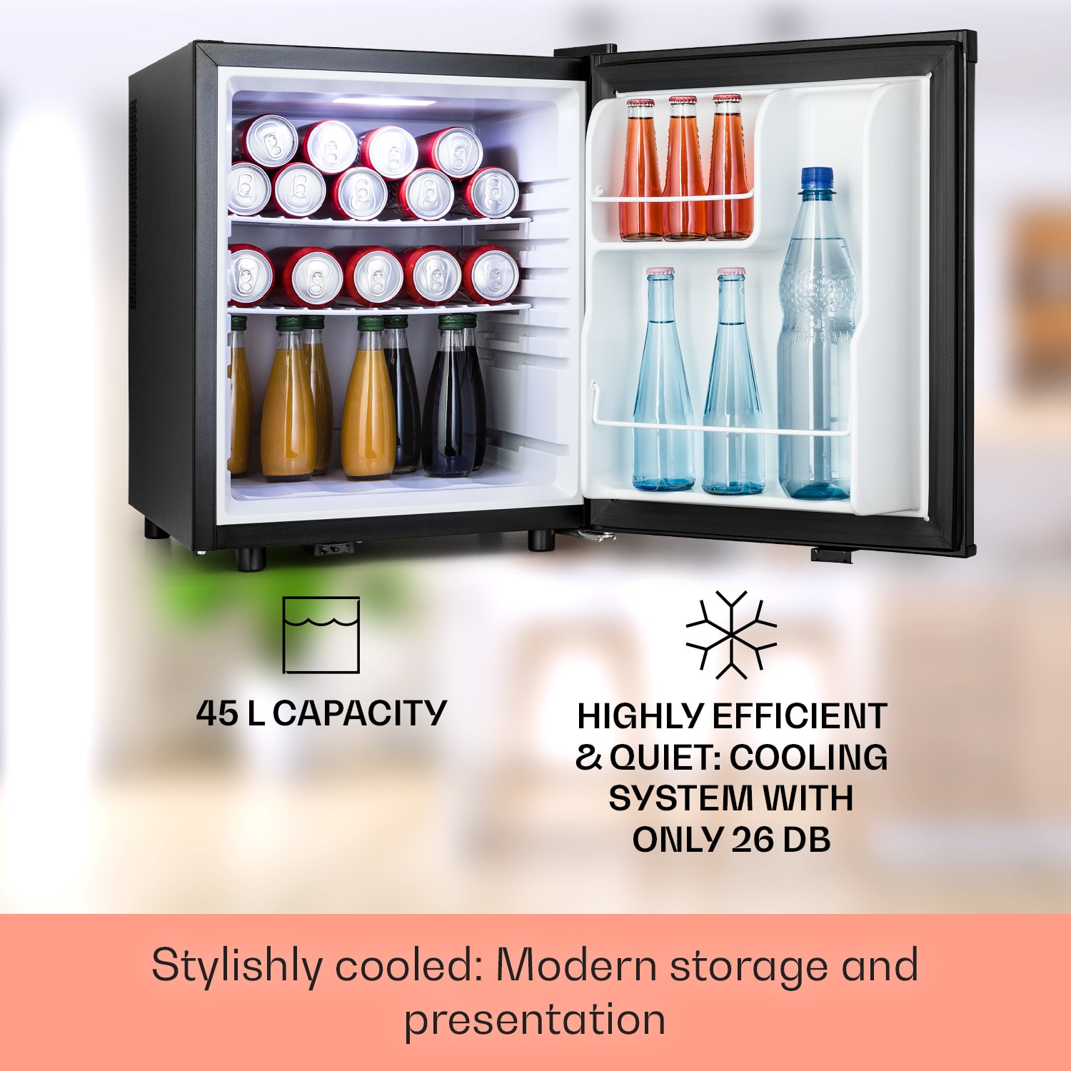 Uchovávajte chladené občerstvenie a nápoje priestorovo úsporným spôsobom: chladnička Happy Hour 45 od Klarstein je ideálna pre malé domácnosti, pre spoločné izby alebo kancelárie, ale najmä pre spálne a hosťovské izby vďaka svojej mimoriadne tichej prevádzke s hlučnosťou len 26 dB a kompaktným rozmerom. Táto Mini chladnička s 45-litrovým interiérom má na 3 policiach priestor na všetky druhy jedál, nápojov a potravín. Dve mriežkové police možno použiť na ôsmych zásuvkách podľa potrieb obsahu chladničky, zatiaľ čo vajcia, maslo a tiež veľké fľaše s nápojmi do 2 litrov možno uložiť do dverových priehradiek.Vždy dokonale vychladená: chladnička Happy Hour 45 od Klarstein je priestorovo úsporný dizajnový zázrak, ideálna na skladovanie potravín.