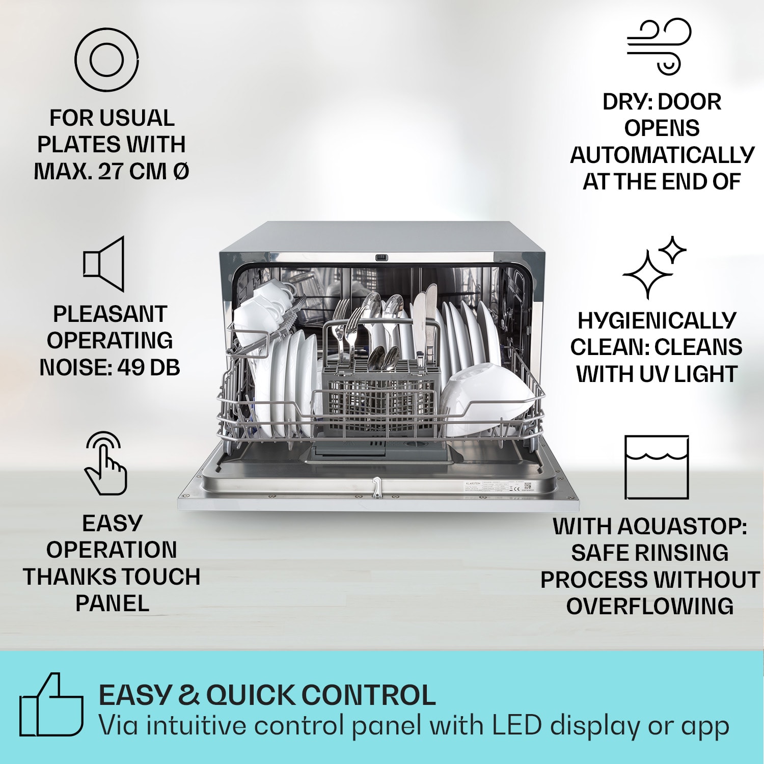 Klarstein Havasia UV 6 Luminance, umývačka riadu, UV svetlo, 1380 W, sklenená predná časť, voľne stojaca –Kúpiť