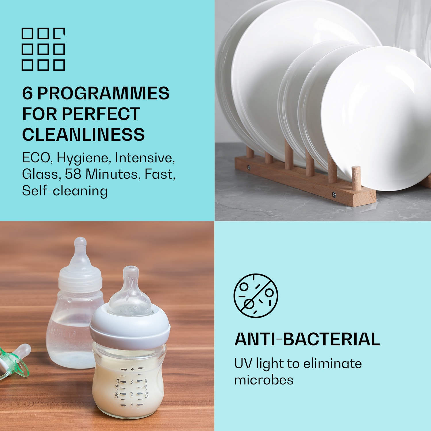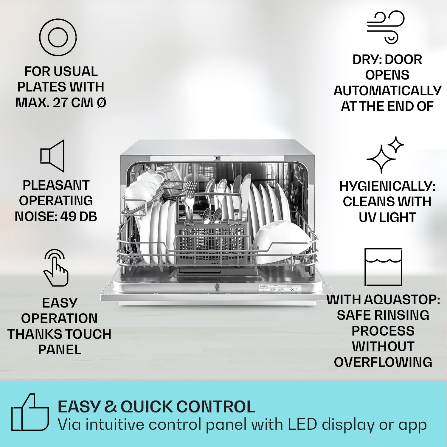 Umývačka riadu Havasia UV 6 od Klarstein je presvedčivý pomocník pri umývaní riadu s mnohými užitočnými funkciami! Vo vnútri je miesto až na 6 súprav riadu. S výkonom 1380 W a šiestimi rôznymi programami sa umývačka Havasia UV 6 postará o to, aby špinavý riad opäť žiaril. Všetky programy sa dajú rýchlo a jednoducho nastaviť pomocou prehľadného dotykového ovládacieho panela. S automatickým otváraním dverí a integrovaným UV svetlom na mimoriadne účinné umývanie vám spoľahlivo uľahčí každodenný život. Zabudovaný držiak uľahčuje aj čistenie pohárov na víno alebo šampanské. Umývačku riadu Havasia UV 6 možno používať ako vstavaný spotrebič alebo ako stolnú umývačku.