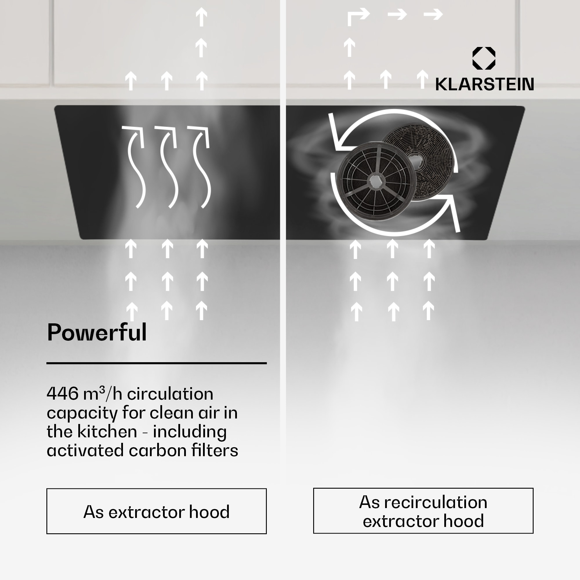 Ten najlepší vzduch v kuchyni: Digestor Klarstein Hektor 52 Eco sa síce nemusí skrývať, ale do vašej kuchynskej linky plynulo zapadne vďaka svojmu dizajnu bez okrajov. Odtiaľ rýchlo a účinne odstraňuje paru a výpary pri varení.Digestor Klarstein Hektor 52 Eco sa postará o čistý vzduch bez výparov vo vašej kuchyni s prietokom odsávania 466 m³/h. S tromi úrovňami výkonu sa intenzitou odsávania prispôsobí aktuálnemu priebehu varenia. Prepínateľné 2 x 1,5 W LED pásy dokonale osvetlia varnú dosku bez toho, aby namáhali vaše oči. Zvláštnou prednosťou digestora Hektor Eco s rozmermi 52 x 32 cm (ŠxH) je jeho schopnosť stať sa prakticky neviditeľným v kuchynskej linke. Plynule sa stratí v kuchynskej skrinke nad varnou doskou a je viditeľný len vďaka elegantnej spodnej časti z bezpečnostného skla. Tu sa nachádza aj nekomplikovaný dotykový ovládací panel. Časovač vypnutia v prípade potreby ešte vetrá 1 až 9 minút a potom spotrebič vypne. Digestor je vhodný na prevádzku s recirkuláciou alebo odsávaním vzduchu – všetky potrebné filtre sú súčasťou dodávky.