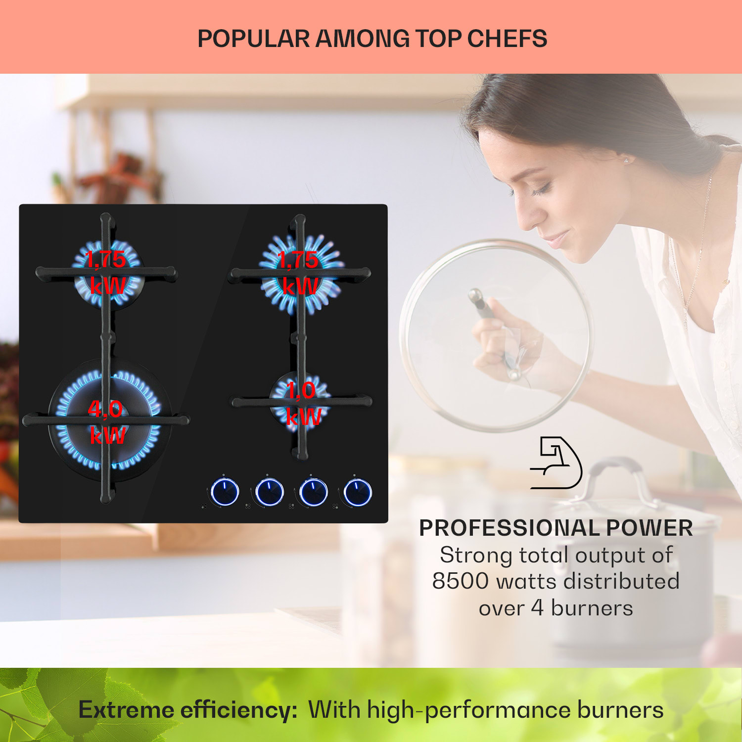 Na chvíľu takmer zabudnutý, no teraz je späť: plynový sporák, ktorý má so svojimi neprekonateľnými výhodami svoje miesto aj v modernej kuchyni. Plyn je nielen efektívnejší a šetrnejší k životnému prostrediu, ale je tiež oveľa viac kontrolovateľný, a teda praktickejší ako varenie na elektrine. Plynová varná doska Klarstein Illuminosa 4 prináša teraz túto možnosť do tvojej kuchyne.Na priestorovo úspornej varnej doske Klarstein Illuminosa 4 sa nachádzajú štyri kvalitné Sabaf horáky, ktoré hrejú poriadne s výkonom 4 kW, 2 x 1,75 kW a 1,0 kW. Všetky horáky distribuujú teplo rovnomerne v strede a na okrajoch hrncov alebo panvíc, všetko sa perfektne a optimálne uvarí. Obidve odnímateľné mriežky z masívnej liatiny sú vhodné pre takmer všetky typy kuchynského riadu, na plameni sú umiestnené presne a bez rizika prevrátenia hrncov. Ovládanie je úplne intuitívne vďaka zrozumiteľným symbolom na veľkých otočných gombíkoch. Integrované LED diódy, ktoré rozsvietia regulátory, sa postarajú o optimálnu viditeľnosť nastavení. V jednoduchej regulácii spočíva veľká výhoda plynových sporákov. Počas procesu varenia je možné neustále upravovať prívod tepla. zmeny veľkosti plameňa sa bezprostredne prejavia na zmene teploty hrnca alebo panvice. Samozrejme sme venovali pozornosť aj bezpečnosti pri sporáku: dodatočný oheň na zapálenie nie je potrebný. Plynový plameň sa zapáli jednoducho pomocou elektrického zapaľovania. Ochrana pred výpadkom plameňa uzatvorí prívod plynu do horáka, ak by plameň z akéhokoľvek dôvodu zhasol.Po varení je možné v prípade potreby plynovú varnú dosku jednoducho očistiť: kvôli tomu má povrch z ľahko umývateľného, 6 mm hrubého, tvrdeného keramického skla. Nielen že vyzerá neuveriteľne elegantne, úžasne ľahko sa tiež čistí.Efektívne varenie pri nižších nákladoch so všetkými výhodami plynového sporáka: plynová varná doska Illuminosa 4 od spoločnosti Klarstein presvedčí nielen amatérskych kuchárov.