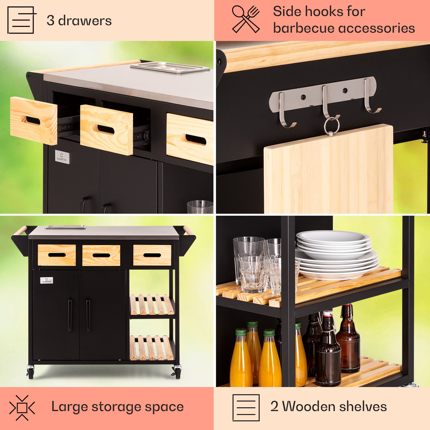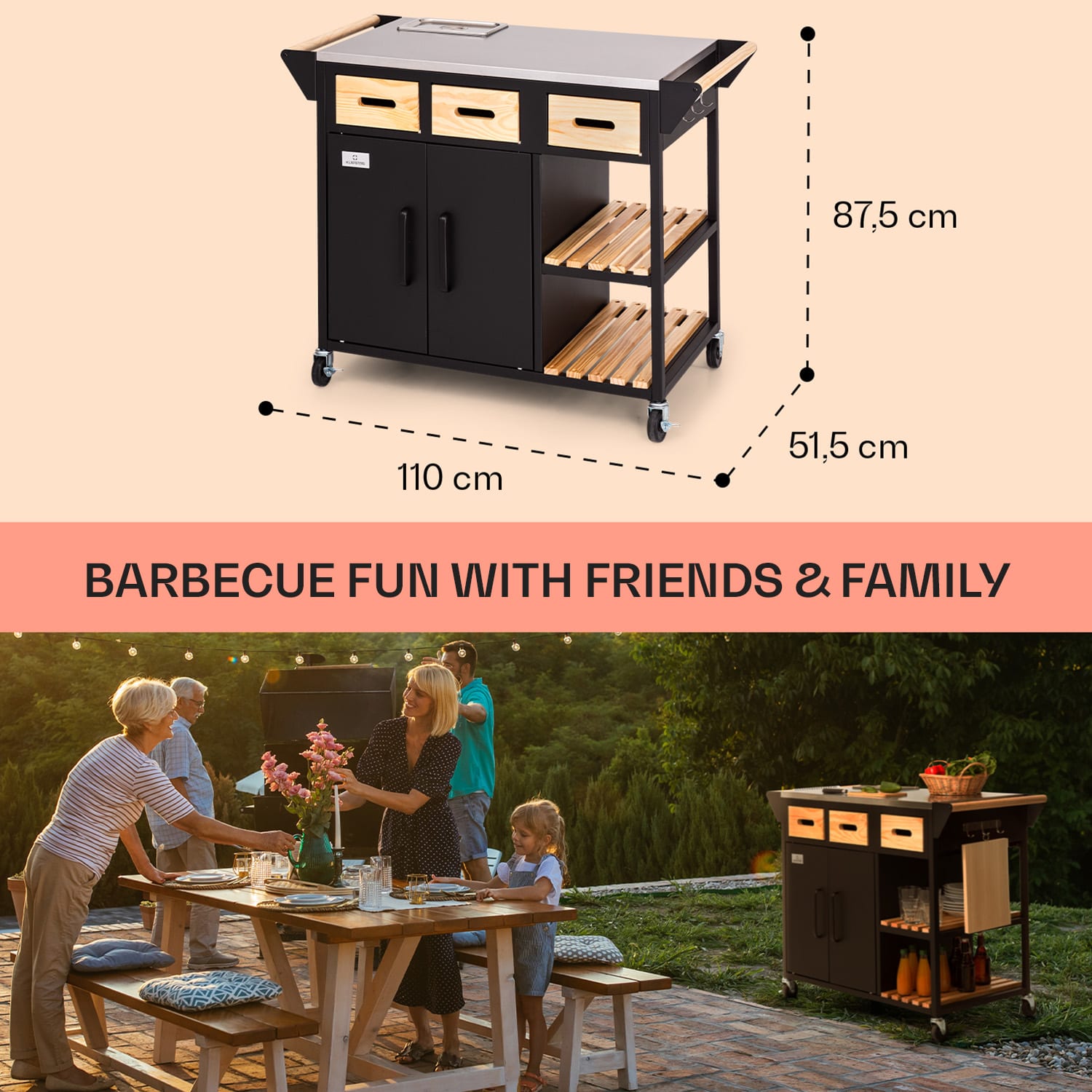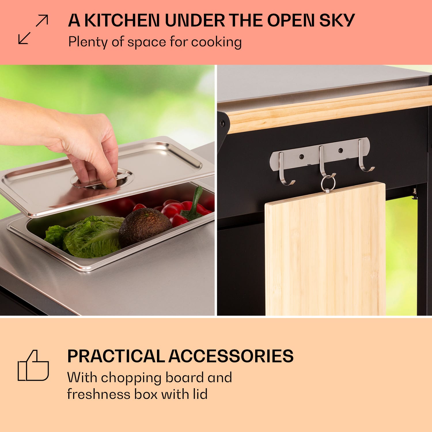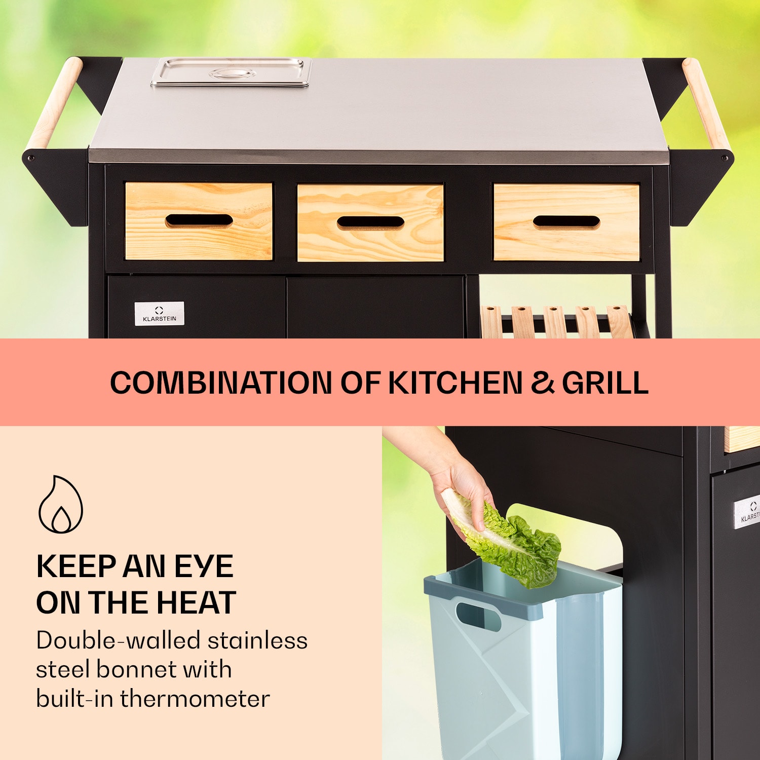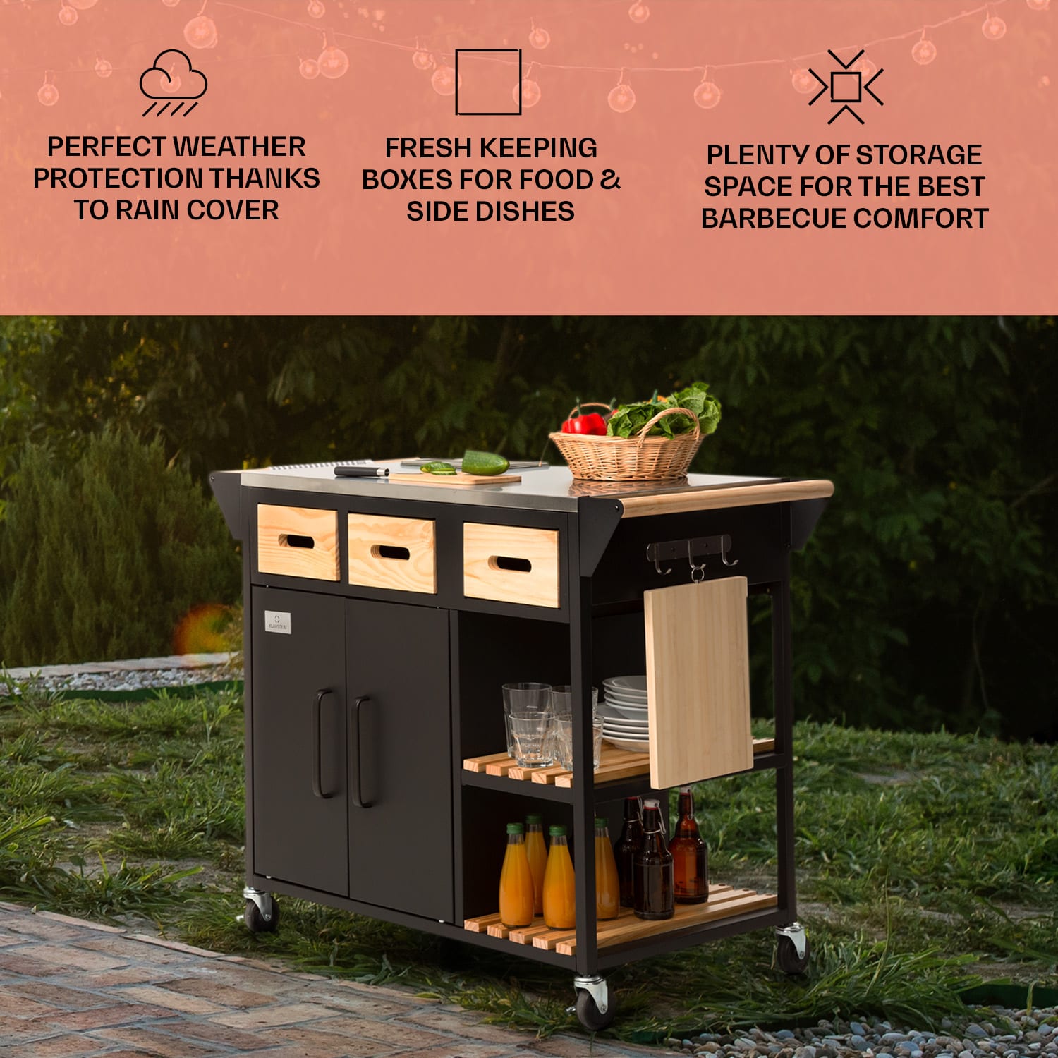 Doma v záhrade! So sériou Jersey od spoločnosti Klarstein si zostavíš v záhrade plnohodnotnú vonkajšiu kuchyňu!Pracovná stanicaJersey poskytuje perfektné miesto na všetky kuchynské práce vo vonkajšom prostredí. Na veľkej pracovnej ploche z ušľachtilej ocele môžeš celkom pokojne pripravovať a servírovať jedlo. Súčasťou balenia je aj doska na krájanie a rezanie. Integrovanú nádobu na zachovanie čerstvosti potravín s vekom môžeš naplniť ľadom alebo surovinami – napríklad na prípravu chutných hamburgerov. Priestor na riad, nože a ostatné pomôcky ponúkajú tri zásuvky, dve police pod pracovnou doskou a tiež tri háčiky. Ďalší úložný priestor s integrovaným odpadkovým košom sa nachádza za dvoma dvierkami v základni pracovnej stanice.Aby si mohol svoju novú pracovnú stanicu Jersey od spoločnosti Klarstein postaviť kamkoľvek potrebuješ, disponuje štyrmi kolieskami s parkovacími brzdami a drevenou rukoväťou na ľavej aj pravej strane na jednoduché tlačenie alebo ťahanie – alebo na zavesenie uterákov. Celá súprava je doplnená ochranným krytom proti dažďu, ktorý chráni pred vetrom, dažďom a prachom.Vitaj doma v záhrade! Zapôsob na priateľov a rodinu s outdoorovou kuchyňou Jersey od spoločnosti Klarstein!