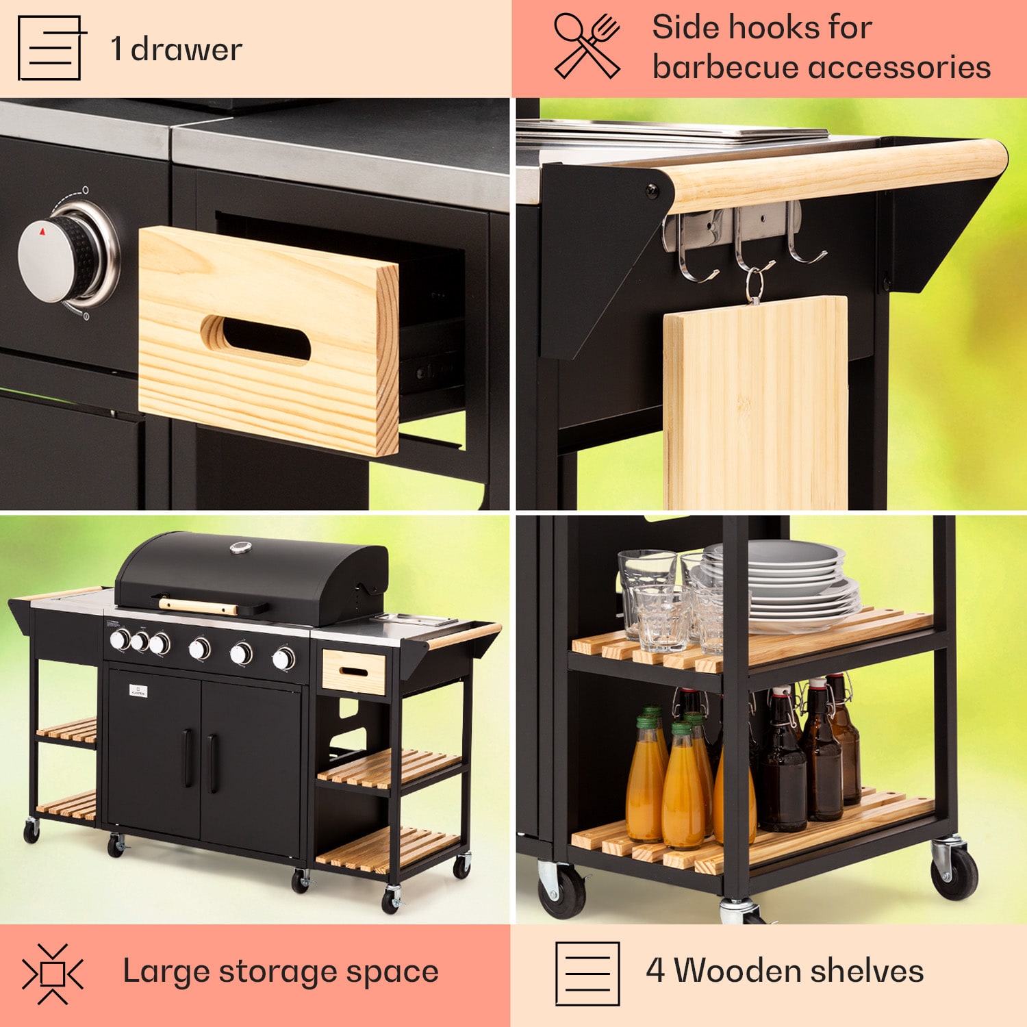 Doma v záhrade! So sériou Jersey od spoločnosti Klarstein si zostavíte na záhrade plnohodnotnú vonkajšiu kuchyňu! Centrom vašej novej vonkajšej kuchyne Jersey je mohutný plynový gril s 5 horákmi z nehrdzavejúcej ocele. Tu môžete grilovať, piecť a variť, pričom dvojstenný poklop umožňuje pasívne grilovanie a pečenie. Plynové fľaše, hrnce a panvice jednoducho zmiznú bez povšimnutia vo veľkom úložnom priestore. Pracovná plocha na ľavej strane vám ponúka nielen veľkú pracovnú dosku, ale aj prídavný bočný horák na omáčky či zeleninu. Na dvoch policiach pod pracovnou doskou a troch háčikoch je miesto na riad, nože a iné predmety, ďalej je tu nádoba na čerstvé potraviny s vekom, doska na krájanie, zásuvka a dve police.Vitaj doma v záhrade! Prekvapte svojich priateľov a rodinu s vonkajšou kuchyňou Jersey od Klarstein!