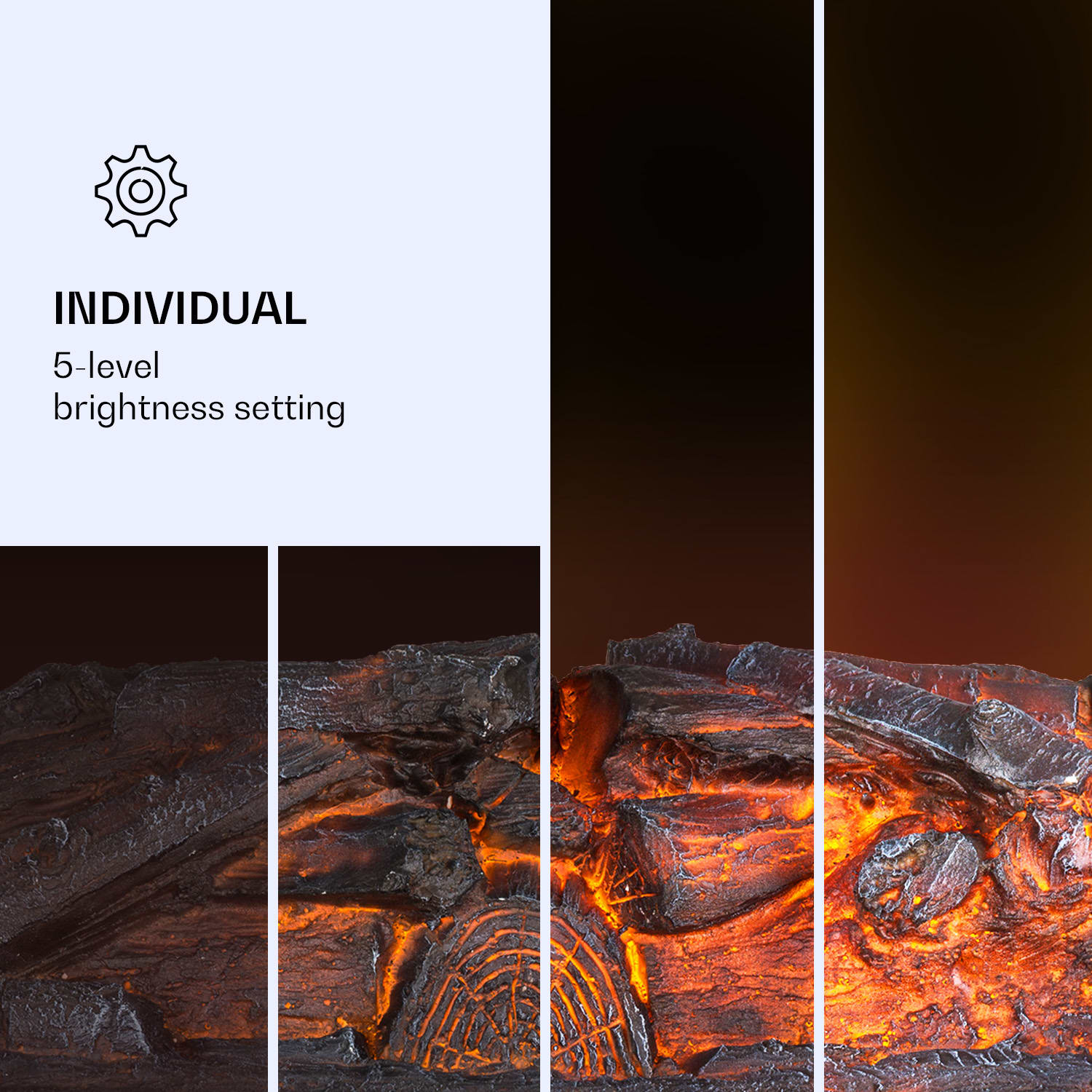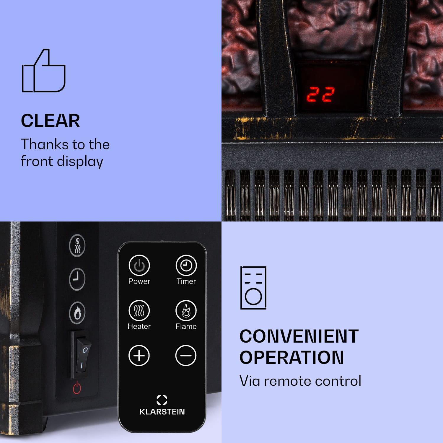 S elektrickým krbom Klarstein Kamini FXL 2G si môžete po celý rok vychutnávať útulnú atmosféru krbu so žiariacimi polenami a realistickou 3D LED ilúziou plameňa. Vďaka prepínateľnej funkcii dvojstupňového ohrevu je ilúzia dokonalá. Kamini FXL 2G sa obsluhuje pomocou dotykového ovládacieho panela alebo pohodlne z pohovky pomocou praktického diaľkového ovládania. Päť stupňov nastavenia jasu a funkcia časovača robia z krbovej vložky Klarstein Kamini FXL ideálny celoročný krb.