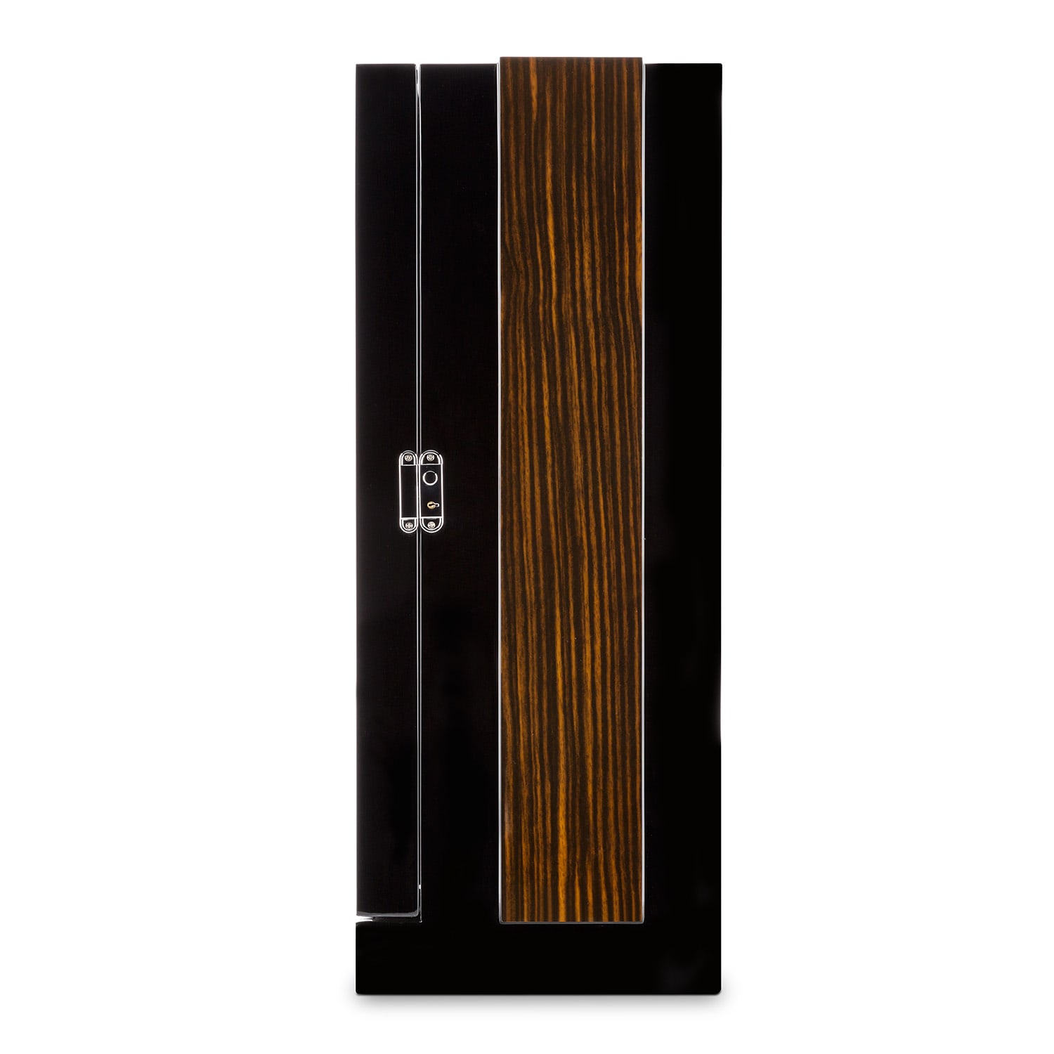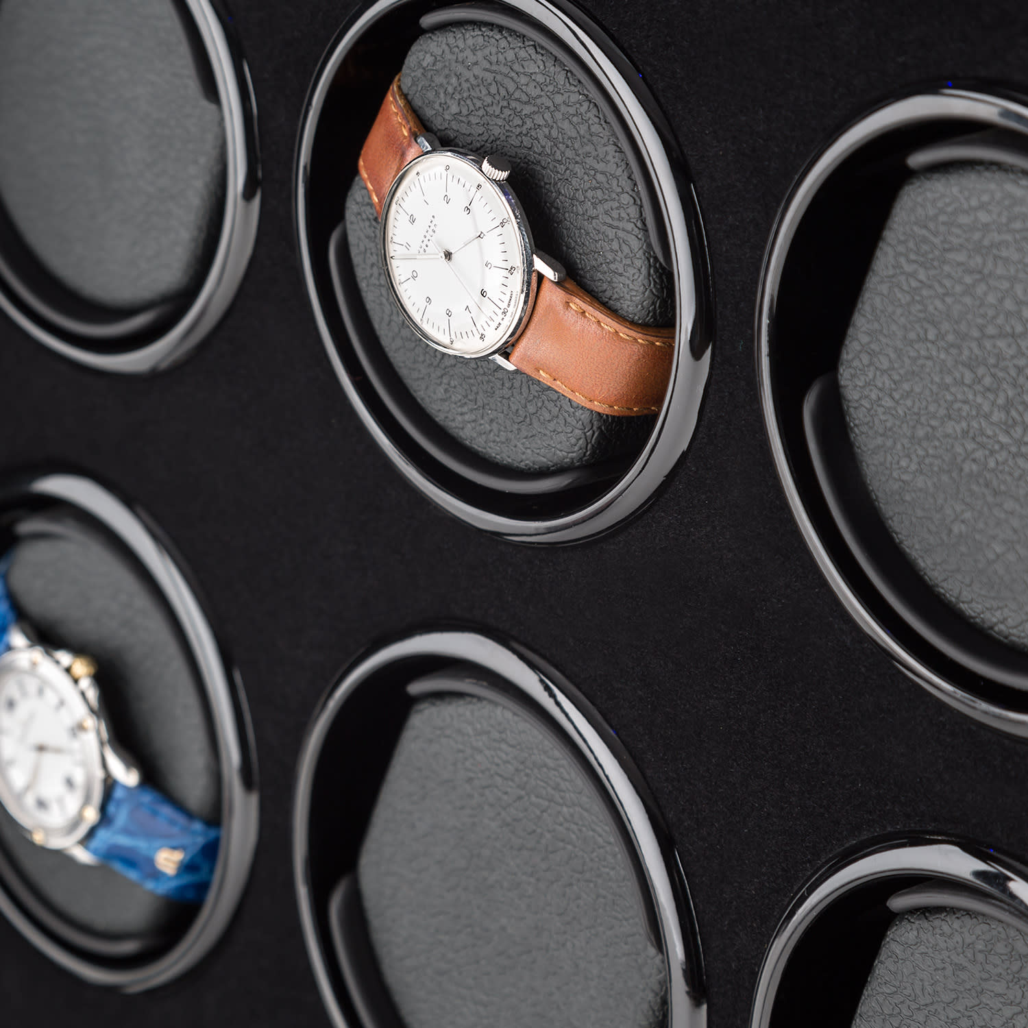 Milovníci hodiniek a zberatelia vedia: Hodinky s automatickým naťahovaním musia byť neustále udržiavané v pohybe, aby nezastali alebo dokonca aby olej vnútri nestuhol. To sa stane, keď vlastníte viac ako jedny takéto hodnotné hodinky alebo keď ich nemôžete určitú dobu nosiť. Tu pomôže pohyblivý stojan na hodinky Klarstein Klagenfurt watch winder, v ktorom hodinky neúnavne kmitajú a hodinový strojček ich drží v neustálom pohybe. Luxusná čierna vitrína pohyblivého stojana na hodinky Klarstein Klagenfurt má dvanásť držiakov na hodinky, každý s čiernym zamatovým vankúšom, a elegantne uvedie na scénu každé hodinky. Penový materiál zabezpečí, že aj hodinky s dlhým remienkom sa dajú pevne umiestniť. Čierny poťah vnútra so štruktúrovaným vzhľadom kompletizuje celkový elegantný dojem. Plastové dvierka chránia cenné chronometre pred prachom a špinou, zatiaľ čo zapínateľné, modré LED osvetlenie sa postará o dobrý pohľad do vnútra. Dva jednoducho zrozumiteľné, digitálne, dotykové displeje, každý so 6 tlačidlami, slúžia pre samostatné ovládanie dvanástich rotátorov. Pre každý držiak možno jednotlivo nastaviť otáčanie v smere otáčania hodinových ručičiek, proti smeru otáčania hodinových ručičiek alebo v striedajúcich sa smeroch otáčania ako aj želaný počet otáčok za deň až do 2200 otáčok. Pohyblivý stojan na hodinky Klarstein Klagenfurt má extrémne tichý motor, ktorého prevádzkový hluk je sotva vnímateľný aj z malej vzdialenosti. Preto je veľmi vhodný pre umiestnenie v spálni či pracovni. Vďaka svojej elegantnej, čiernej vitríne s ozdobným okrajom je pohyblivý stojan na hodinky Klagenfurt zvlášť vhodný aj pre prezentáciu kvalitných chronometrov v profesionálnej oblasti, napríklad hodinármi alebo v klenotníctvach. Modré vnútorné osvetlenie podporuje túto možnosť, integrovaný zámok dvierok zabráni zasa neželanému prístupu k vystaveným hodinkám.