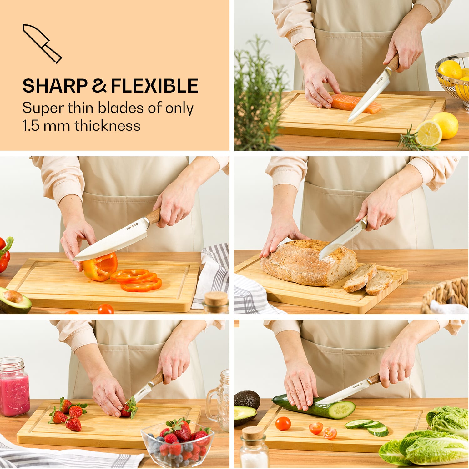 Ostré nože sú v kuchyni absolútnou nevyhnutnosťou: so sadou nožov Klarstein Komaki k vám domov prichádza 5 rôznych precíznych čepelí z nehrdzavejúcej kalenej ocele. A priamo si so sebou prinesú 3 dosky na krájanie. Sada nožov Komaki má však špeciálnu vlastnosť: tri dosky na krájanie sa dajú do seba zasunúť a vytvoriť blok nožov. Stredová doska má 5 otvorov, v ktorých sú bezpečne a prehľadne uložené čepele. To však nie je jediná zaujímavosť: dve dosky na krájanie spolu tvoria aj praktický držiak na kuchárske knihy, smartfóny alebo knihy s receptami. Akoby to nestačilo, veľká doska na krájanie má aj praktický integrovaný brúsič nožov. Tím snov vo vašej kuchyni: Klarstein Komaki sada nožov a vy!