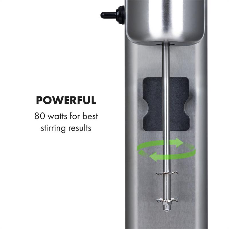 Miešané nápoje, netrasené: Mixér na nápoje Klarstein Kraftpaket Pro zmení mliečne a proteínové kokteily na krémovo lahodný zážitok – v profesionálnej kvalite. Ideálny do fitnes štúdií, mliečnych alebo kokteilových barov.Ako to máte radi. Mixér na proteínové kokteily Klarstein Kraftpaket Pro podporuje fitnes tréning a budovanie svalov zdravými proteínovými koktejlmi, a to v profesionálnej kvalite Klarstein! S výkonom 80 W sa ingrediencie v šejkri z ušľachtilej ocele miešajú dvomi voliteľnými rýchlosťami pri 15000 alebo 20000 otáčkach za minútu. Do 1-litrovej mixovacej nádoby sa zmestí až do 0,65 litra ingrediencií. Nádoba sa jednoducho zavesí na stojan zariadenia Kraftpaket Pro z ušľachtilej ocele. Dva miešacie kotúče zabezpečia premiešanie ingrediencií bez vytvorenia hrudiek. Po práci sa dajú všetky odnímateľné časti mixéra jednoducho umyť v umývačke riadu. O bezpečnosť pri práci sa starajú protišmykové prísavkové nožičky, ktoré držia mixér pevne na doske stola aj pri vysokých otáčkach.Profesionálny mixér na mliečne kokteily Klarstein Kraftpaket Pro vykúzli vo Vašej kuchyni tie najjemnejšie mliečne a stimulujúce proteínové kokteily z ingrediencií podľa Vášho výberu.