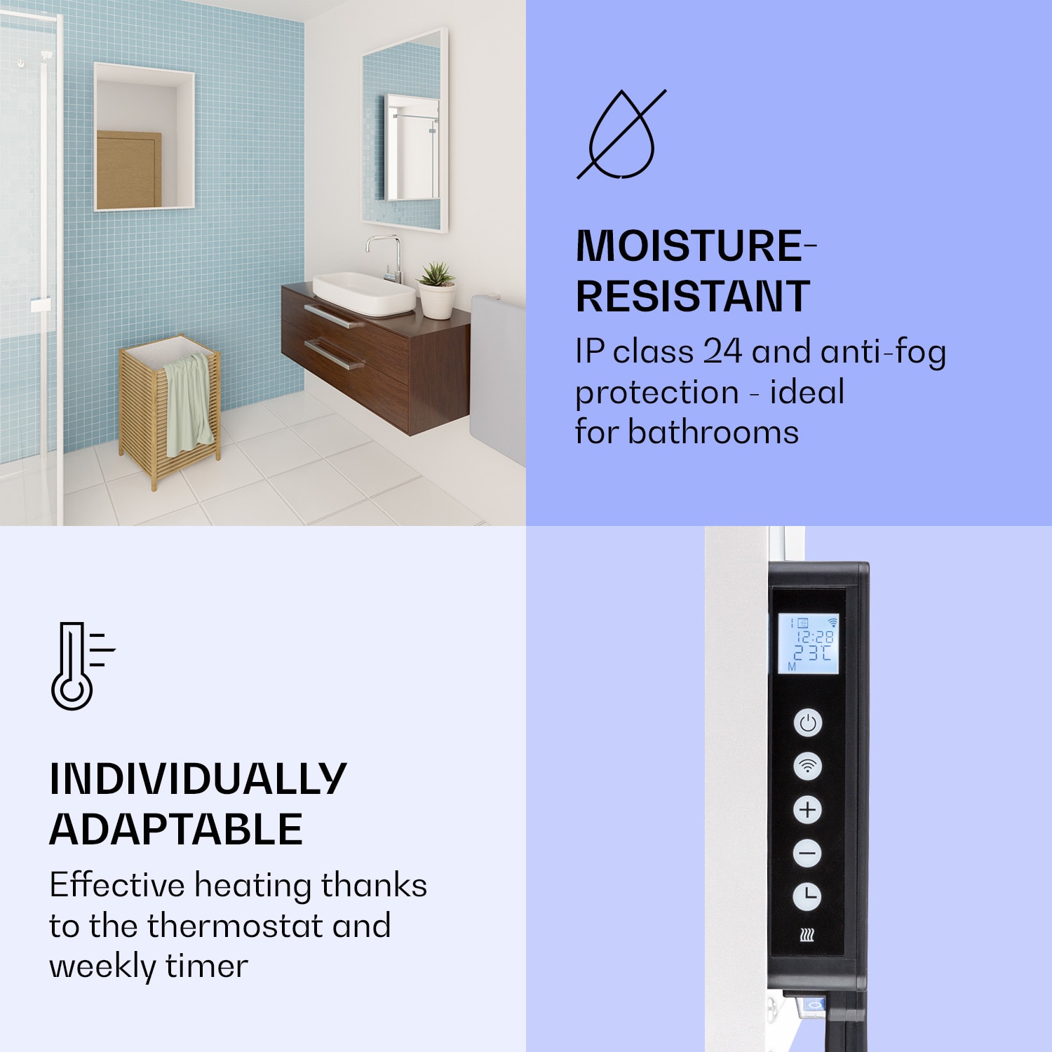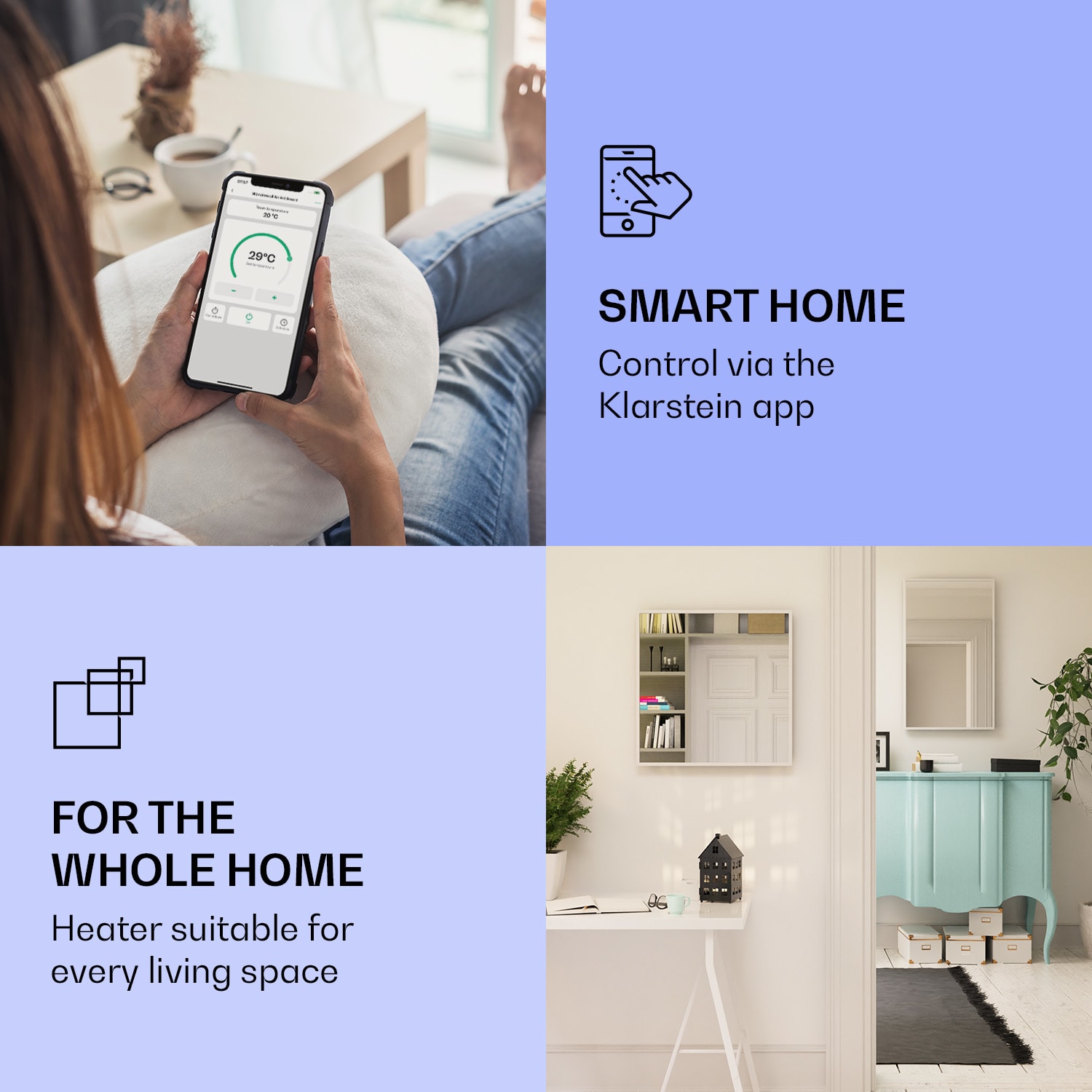 Dvojitý výkon pri rovnakej veľkosti, Klarstein La Palma ohrievače 2 v 1 šikovne kombinujú infračervený sálavý ohrievač s konvektorom a tým nielen rýchlo vytvárajú citeľné infračervené teplo v priestorovo úspornom dizajne, ale vytvárajú aj príjemne teplý vzduch v miestnosti prostredníctvom tepla stúpajúceho zo zadnej strany. V závislosti od veľkosti miestnosti si môžete vybrať ohrievač s výkonom 500, 750, 900 alebo 1000 W. Termostat, ktorý možno nastaviť v stupňoch, a týždenný časovač sa ovládajú veľmi inteligentne prostredníctvom aplikácie Klarstein alebo diaľkovým ovládaním. Konvektory sú vďaka ochrannej triede IP24 ideálne aj do kúpeľne, kde sú dvojnásobne užitočné vďaka zrkadlovým priečeliam s povrchovou úpravou proti zahmlievaniu. Verzia s výkonom 900 W je vhodná aj ako stojanové zariadenie, a tak môže poskytovať príjemné teplo napríklad v spálni ako stojanové zrkadlo.