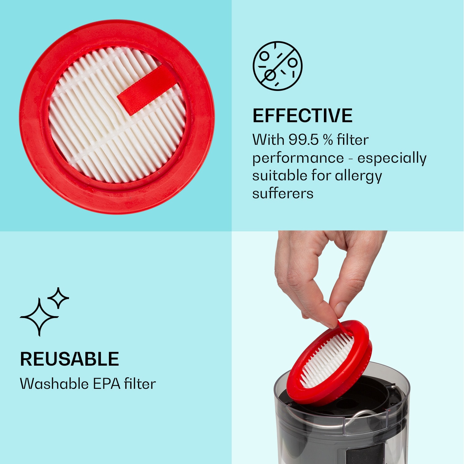 Náhradný filter EPA E12- nahrádza opotrebované a zanesené filtre vo vysávači Klarstein LARMA . Vďaka 99,5 % účinnosti filtra vás spoľahlivo zbaví jemného prachu, peľu, vajíčok roztočov a ich výlučkov. Vďaka tomu je obzvlášť vhodný pre alergikov. Aby sa zachoval dlhodobý čistiaci výkon vysávača, mali by ste silne opotrebované diely pravidelne vymieňať.