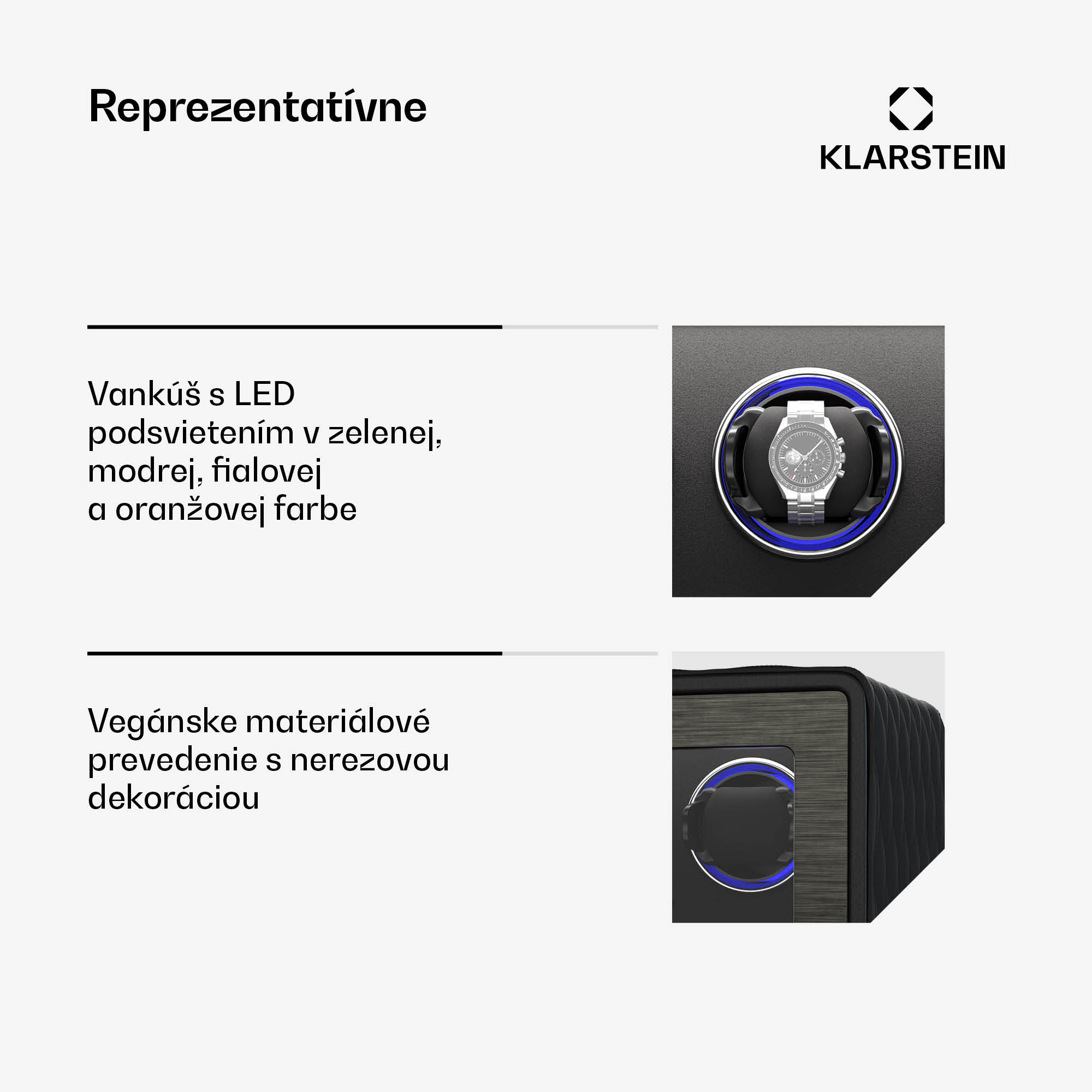 Naťahovač hodiniek   Klarstein  LuminousTime ponúka luxusné a tiché riešenie, vďaka ktorému budú vaše automatické hodinky vždy pripravené na použitie. Naťahovač hodiniek a stojan na hodinky  LuminousTime od spoločnosti  Klarstein  zaujme elegantným dizajnom z vegánskej kože a tvrdeného skla v kombinácii s ozdobami z nehrdzavejúcej ocele. Tichý japonský motor zaručuje nehlučnú prevádzku, ktorá je ideálna do spální a kancelárií. Vďaka flexibilným vankúšikom sa prispôsobí väčšine hodiniek a ovláda sa pomocou dotykového LCD panela alebo diaľkového ovládača. Vďaka 20 rôznym nastaveniam TPD a trom smerom otáčania môžete zabezpečiť dokonalú starostlivosť o svoje mechanické hodinky. Integrované svetlá RGB a biele LED diódy tiež štýlovo prezentujú vaše hodinky. Klarstein  LuminousTime by sa mal prevádzkovať v pravidelných cykloch. Trpezlivo počkajte, kým sa naťahovač hodiniek po niekoľkých minútach zastaví, pretože sa spúšťa automaticky každú hodinu.Zažite dokonalú starostlivosť o svoje hodinky a kúpte si  naťahovač hodiniek  Klarstein  LuminousTime už teraz!