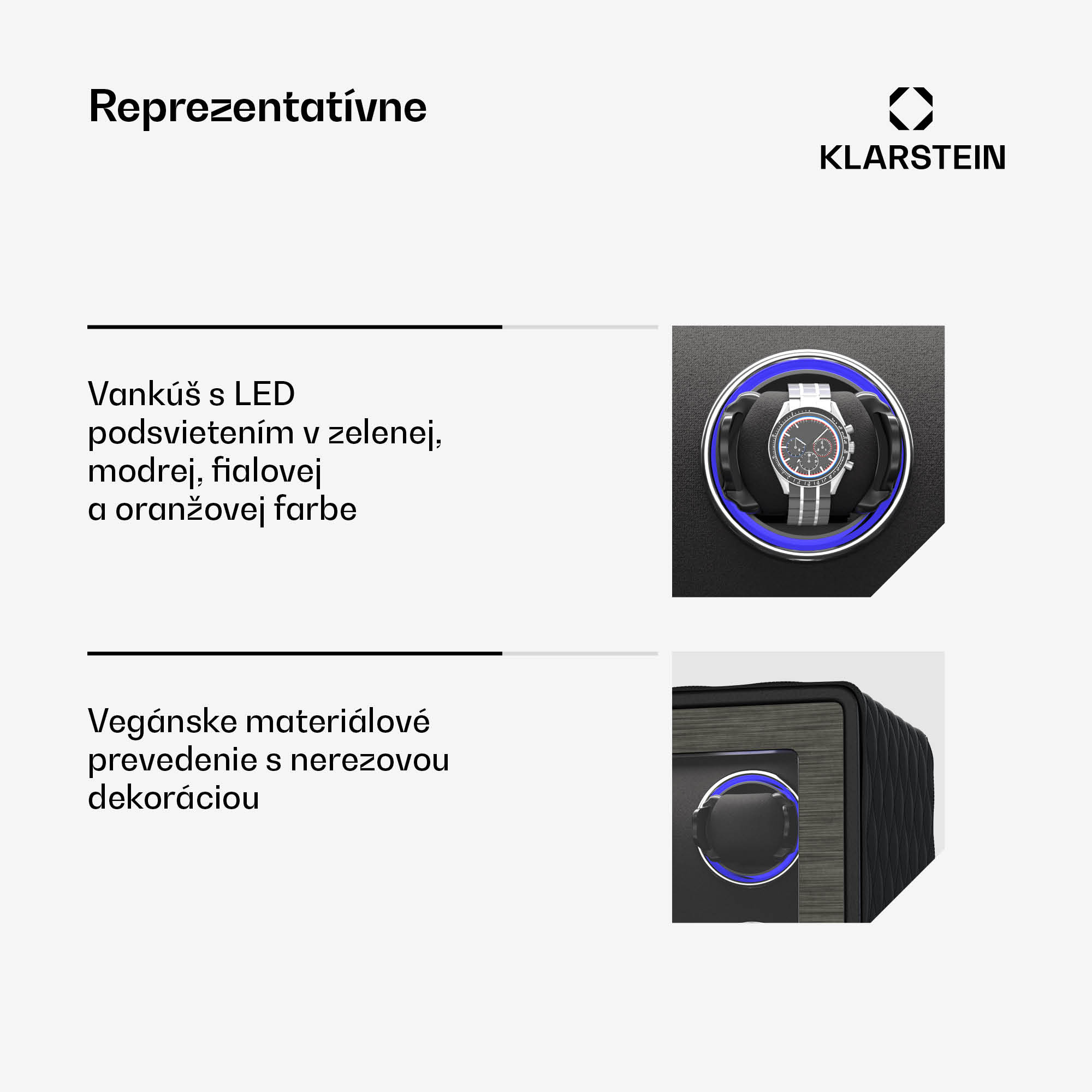 Naťahovač hodiniek   Klarstein  LuminousTime ponúka luxusné a tiché riešenie, vďaka ktorému budú vaše automatické hodinky vždy pripravené na použitie. Naťahovač hodiniek a stojan na hodinky LuminousTime od spoločnosti  Klarstein  zaujme elegantným dizajnom z vegánskej kože a tvrdeného skla v kombinácii s ozdobami z nehrdzavejúcej ocele. Tichý japonský motor zaručuje nehlučnú prevádzku, ktorá je ideálna do spální a kancelárií. Vďaka flexibilným vankúšikom sa prispôsobí väčšine hodiniek a ovláda sa pomocou dotykového LCD panela alebo diaľkového ovládača. Vďaka 20 rôznym nastaveniam TPD a trom smerom otáčania môžete zabezpečiť dokonalú starostlivosť o svoje mechanické hodinky. Integrované svetlá RGB a biele LED diódy tiež štýlovo prezentujú vaše hodinky. Klarstein  LuminousTime by sa mal prevádzkovať v pravidelných cykloch. Trpezlivo počkajte, kým sa naťahovač hodiniek po niekoľkých minútach zastaví, pretože sa spúšťa automaticky každú hodinu.Zažite dokonalú starostlivosť o svoje hodinky a kúpte si  naťahovač hodiniek  Klarstein  LuminousTime už teraz!
