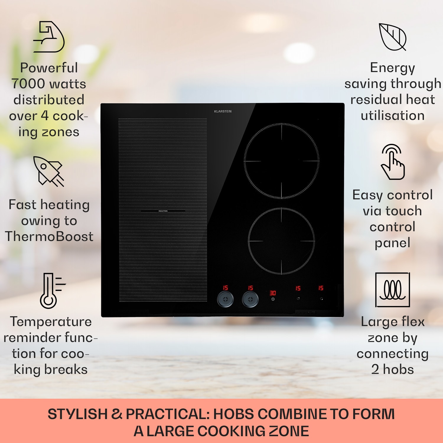 Jednoducho flexibilnejšie varenie: Indukčná varná doska Magnichef 4 od Klarstein umožňuje optimálne využitie priestoru s minimálnou spotrebou energie počas varenia. Spája technické inovácie s luxusným vzhľadom a vďaka sklokeramickému povrchu prináša kuchynskej linke nový lesk. Mimoriadne praktické: Dve z jednotlivých zón možno v prípade potreby spojiť do jednej flexi zóny s výkonom 2500 W, ktorá poskytuje ideálny priestor pre veľké panvice alebo hrnce. Okrem toho ponúka vstavaná varná doska vysokú úroveň bezpečnosti: ochranu proti prehriatiu, detekciu hrnca, ukazovateľ zvyškového tepla, funkciu udržiavania teploty, automatické vypnutie a detskú poistku. Obsluha je nenáročná a vykonáva sa kompletne pomocou dotykového ovládacieho panela a magnetického gombíka. Zlatý klinec: odnímateľný magnetický regulátor pre jednoduché čistenie a ako detská poistka