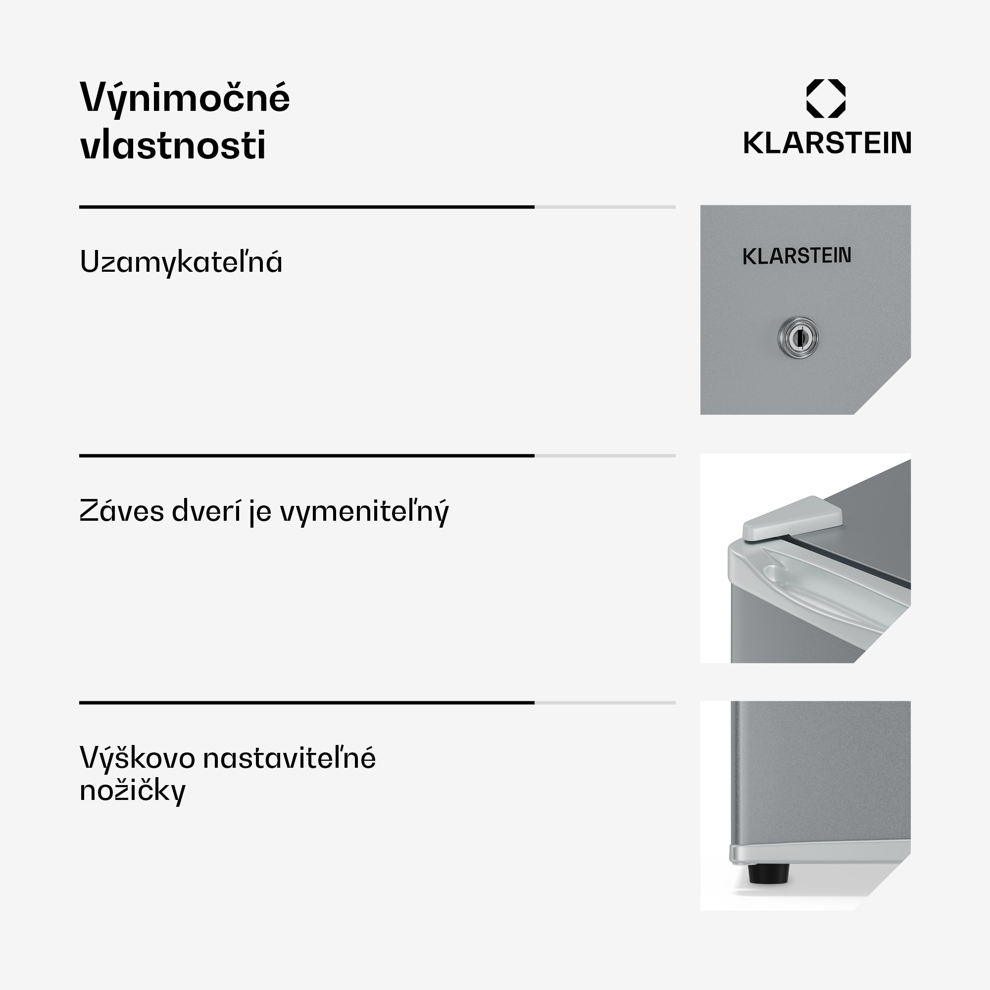 Chladnička Klarstein Matterhorn 28 vychladí nápoje na ideálnu teplotu a vďaka kompaktným rozmerom sa zmestí kamkoľvek. Svoju prácu vykonáva príjemne ticho, pretože disponuje najmodernejším chladiacim systémom: termoelektrické chladenie umožňuje dosiahnuť príjemne nízke teploty 3 až 18 °C bez väčšej námahy. Na dvoch úrovniach pojme nápoje alebo občerstvenie a do mimoriadne veľkej priehradky vo dverách sa bez problémov zmestia aj fľaše s objemom až 2 litre. A aby ste mali všetko bezpečne na svojom mieste, môžete v prípade potreby minibar uzamknúť.Expert na úsporné chladenie: mini chladnička Matterhorn 28 od Klarstein vám poskytne osviežujúco vychladené nápoje a občerstvenie.