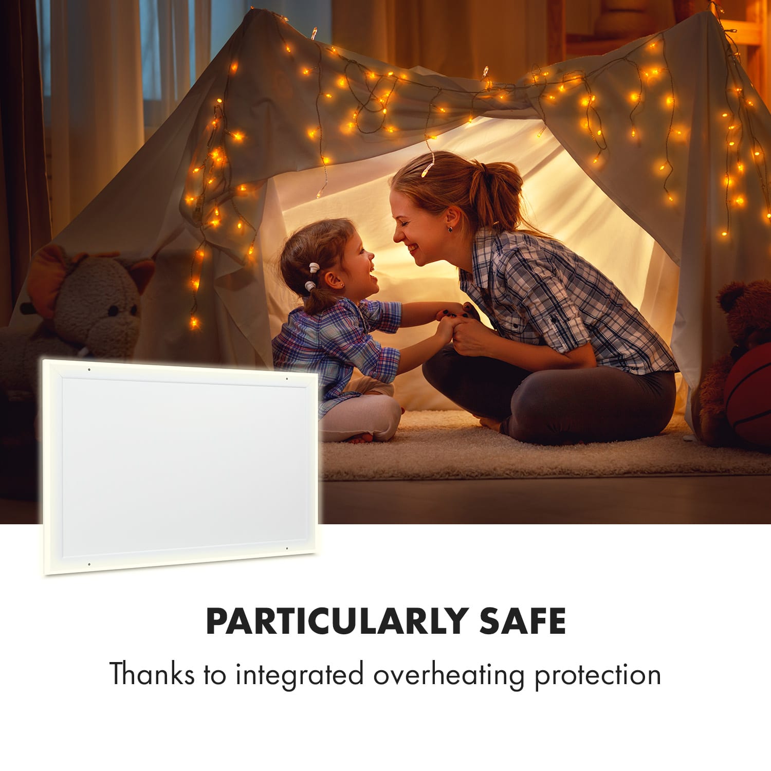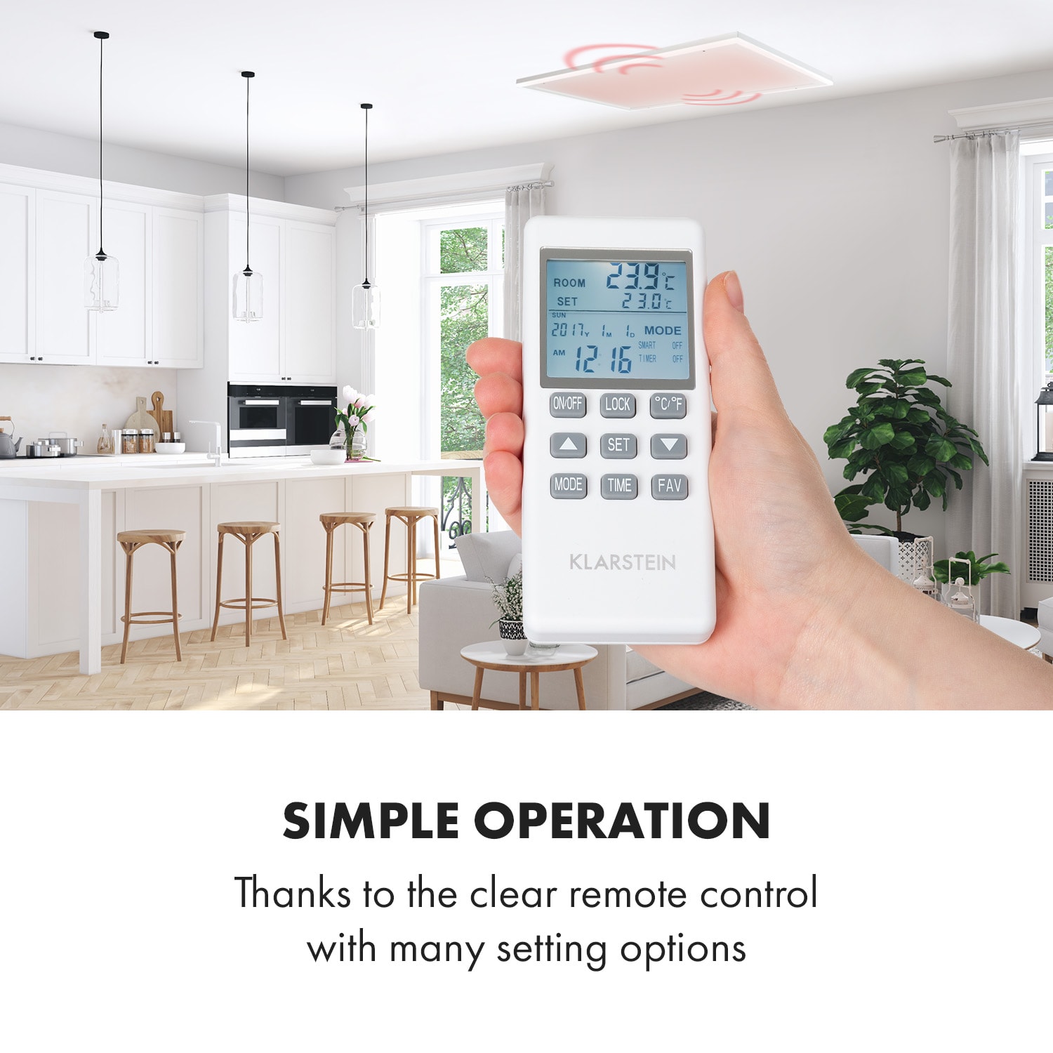 Akoby vašu izbu zohrievalo slnko: Infračervený ohrievač Klarstein Midnight Sun vytvára príjemné teplo vysoko efektívnym a priestorovo úsporným spôsobom a obohatí každú miestnosť o atmosférické dekoratívne LED osvetlenie. Stropný infračervený ohrievač Klarstein Midnight Sun predstavuje revolúciu vo vykurovaní pomocou modernej technológie. Veľmi plochý a nenápadný vyhrievací panel s hliníkovým krytom môžete namontovať priamo na strop. Tento Infrapanel s výkonom 800 W využíva princíp solárneho tepla s IR ComfortHeat: Namiesto pomalého ohrievania vzduchu vyžaruje príjemné infračervené lúče. Tie okamžite ohrievajú osoby a predmety v účinnej oblasti približne 16 m². Vďaka praktickým funkciám, ako je ochrana proti prehriatiu, OpenWindow Detection, , ktorá automaticky vypína alebo zapína vyhrievanie, a programovateľnému týždennému časovaču je toto revolučné kúrenie dokonalé. Atmosférické a príjemné teplo: Inovatívny stropný infračervený ohrievač Klarstein Midnight Sun rozžiari každú miestnosť a okamžite vás pohladí zdravým infračerveným teplom.
