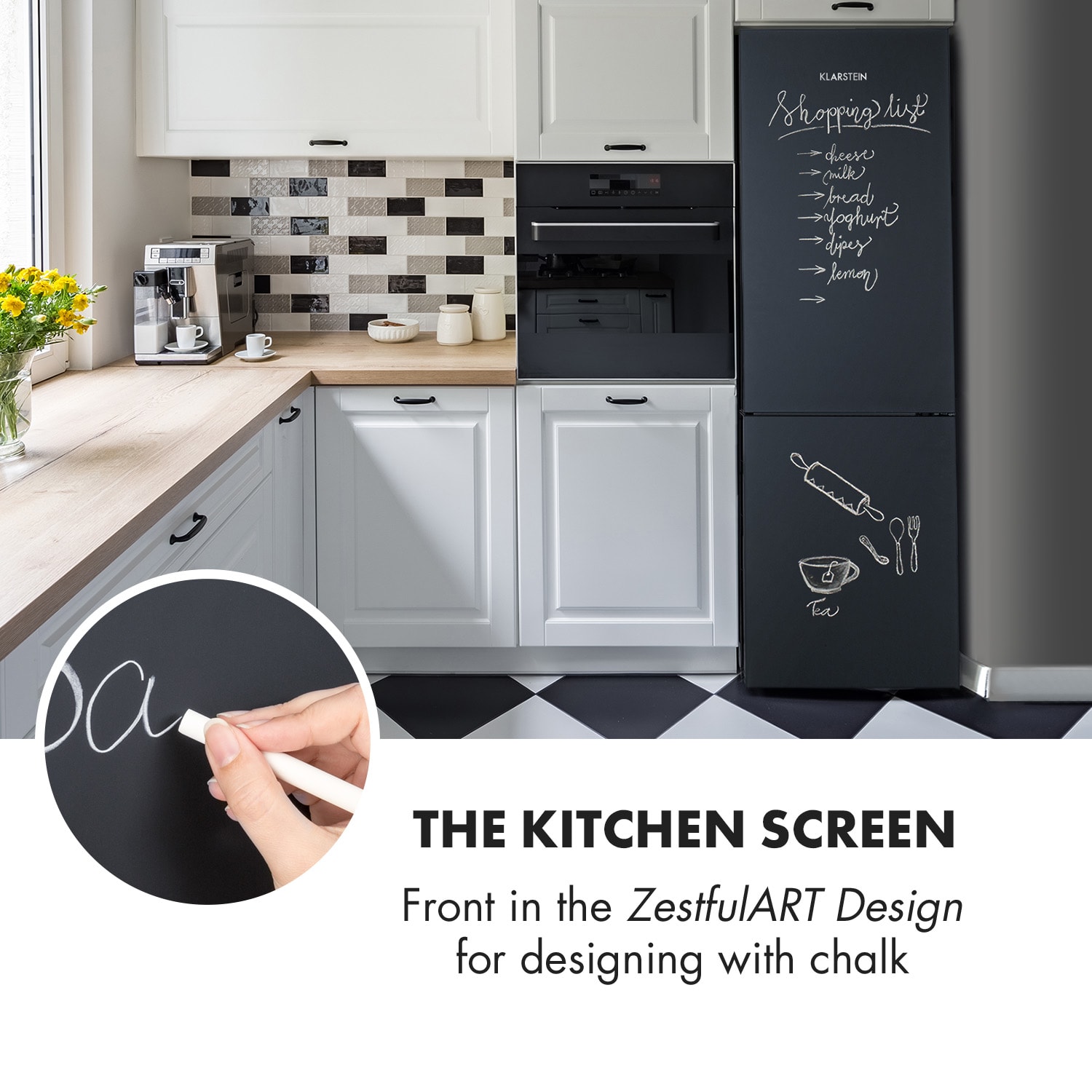Každý deň vytvorte iné umelecké dielo alebo ju použite ako praktickú nástenku na poznámky: kombinovaná chladnička s mrazničkou Klarstein Miro XL prináša do kuchyne viac než len chladnú eleganciu vďaka prednej strane, na ktorú sa dá písať kriedou. Jej priestranný interiér ponúka dostatok miesta na potraviny. So 4 sklenenými policami, 4 priehradkami vo dverách a extra chladnou priehradkou na zeleninu je triedenie obsahu jednoduché. Samostatná priehradka na ľad v spodnej časti je tiež mimoriadne užitočná. Chladiaca poznámková tabuľa uprostred kuchyne: kombinovaná chladnička s mrazničkou Miro XL od Klarstein udržiava potraviny kreatívne čerstvé a zmrazené!