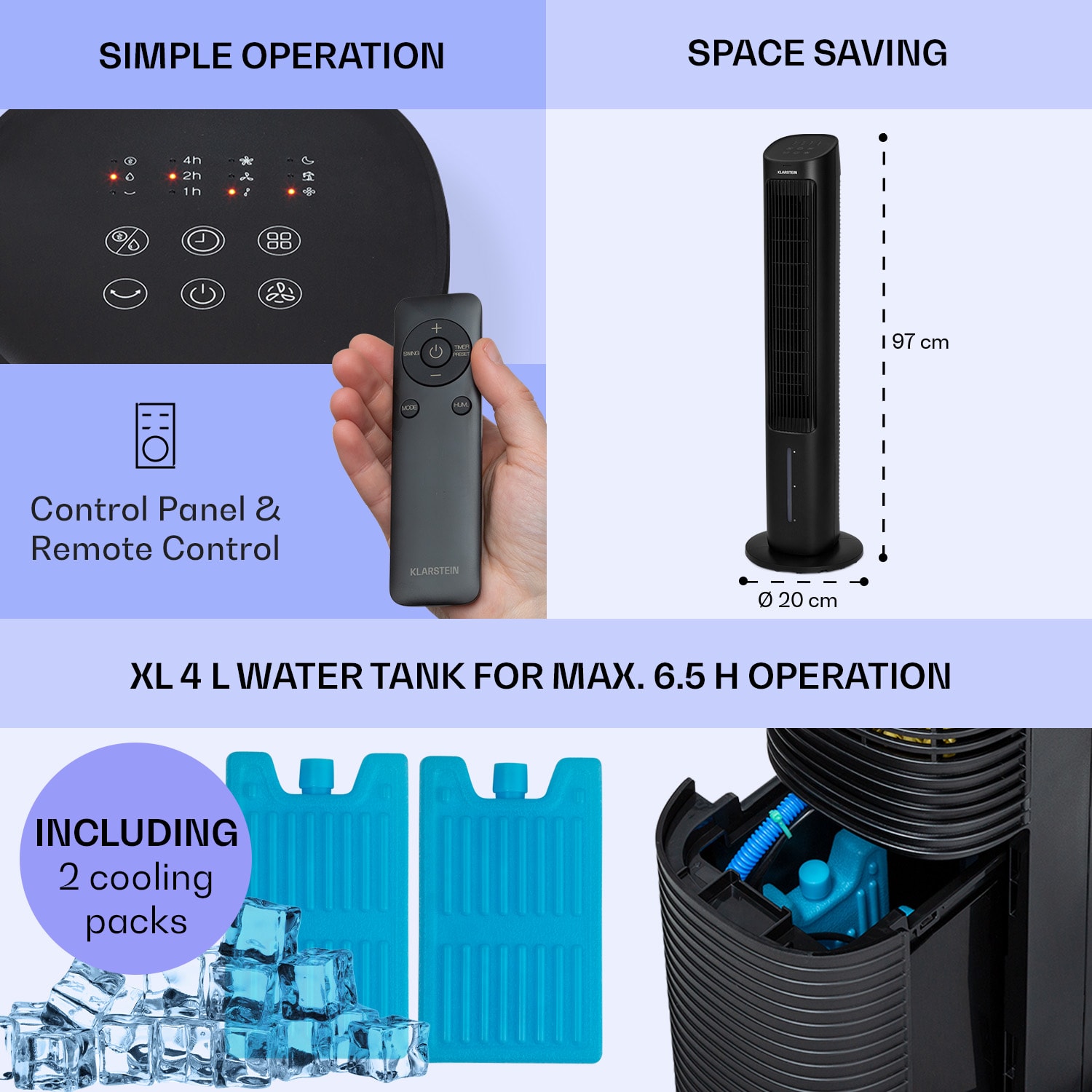 Chladivé osvieženie v horúcich dňoch: Ochladzovač vzduchu 5 v 1 Mistral od Klarstein vám spoľahlivo poskytne osviežujúci prúd vzduchu a naopak v chladných dňoch vás presvedčí aj svojimi praktickými funkciami zvlhčovača vzduchu a čističky vzduchu.Tri stupne intenzity vetra a tri prevádzkové režimy poskytujú rozmanité, na telo zamerané osvieženie ako ventilátor. Zapínateľná 80° oscilácia tiež rozprúdi čerstvý vzduch k viac ako jednej osobe. Ak použijete aj ochladzovač vzduchu, budete mať k dispozícii chladenie pri akejkoľvek činnosti. Dva vymeniteľné chladiace balíčky do nádrže na vodu môžu tento efekt ešte zvýšiť. Akoby to nestačilo, v zime poskytuje úľavu od suchého vzduchu ako zvlhčovač a odstraňuje čiastočky nečistôt a zápachu ako ionizátor. Obsluhuje sa prostredníctvom ovládacieho panela alebo diaľkového ovládaniaVýkonný, efektívny a ekologický: 5-v-1 ochladzovač vzduchu Mistral od Klarstein.