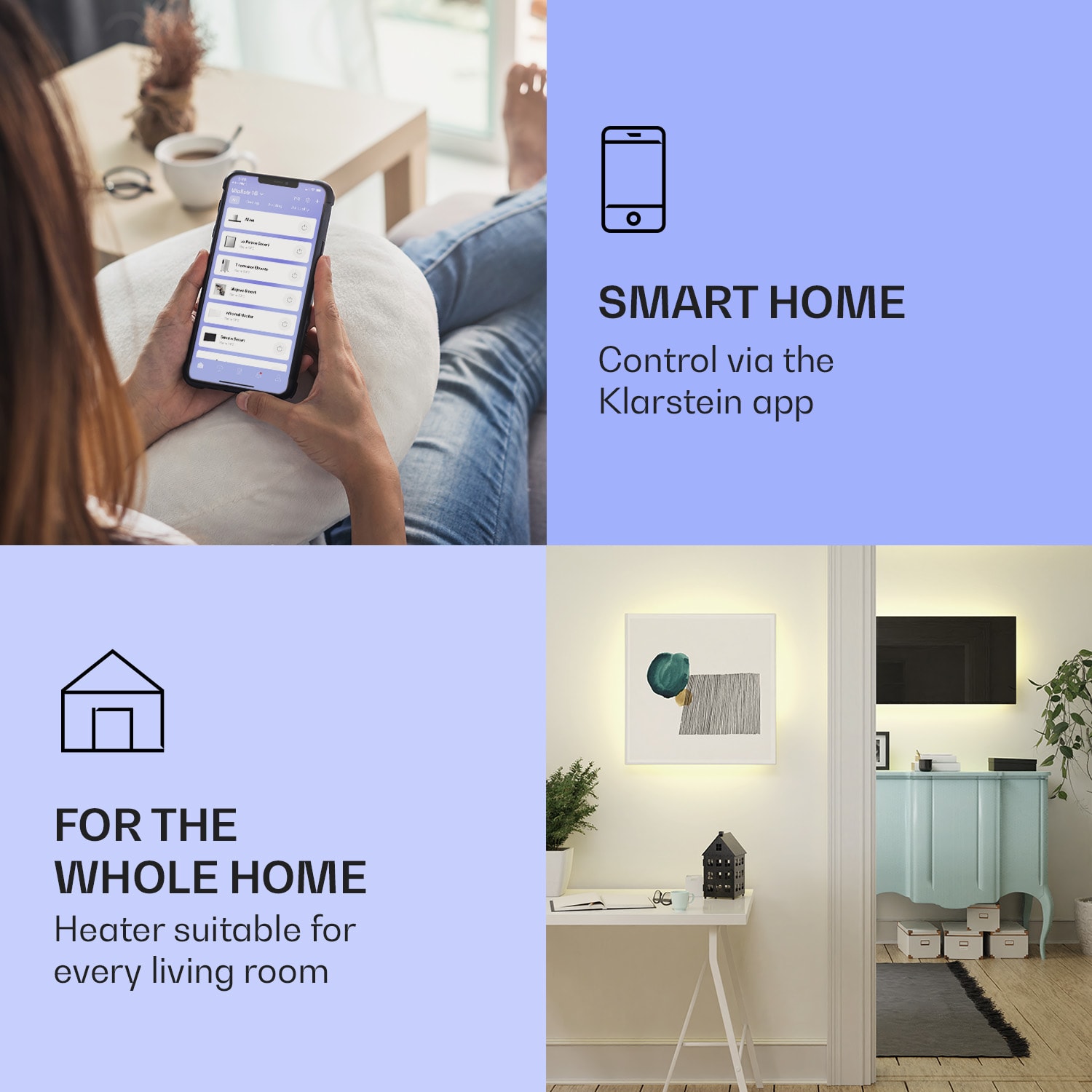 Dvojitý výkon pri rovnakej veľkosti, Klarstein Mojave ohrievače 2 v 1 šikovne kombinujú infračervený sálavý ohrievač s konvektorom a tým nielen rýchlo vytvárajú citeľné infračervené teplo v priestorovo úspornom dizajne, ale vytvárajú aj príjemne teplý vzduch v miestnosti prostredníctvom tepla stúpajúceho zo zadnej strany. V závislosti od veľkosti miestnosti si môžete vybrať ohrievač s výkonom 500, 750, alebo 1000 W. Termostat, ktorý možno nastaviť v stupňoch, a týždenný časovač sa ovládajú veľmi inteligentne prostredníctvom aplikácie Klarstein alebo diaľkovým ovládaním. Vďaka ochrannej triede IP44 sú konvektory ideálne aj do kúpeľne. Nezáleží na tom, kam zavesíte svoj nový vykurovací panel Klarstein Mojave Smart, so svojím farebným ambientným svetlom RGB vytvorí tú správnu atmosféru, nech ste kdekoľvek.