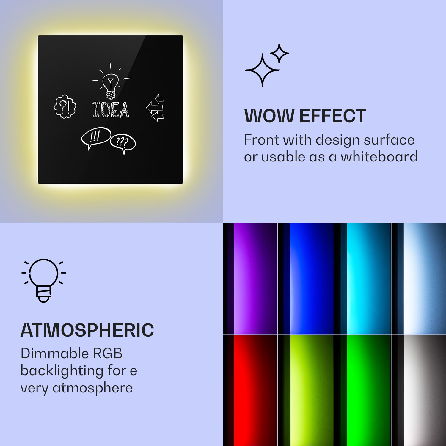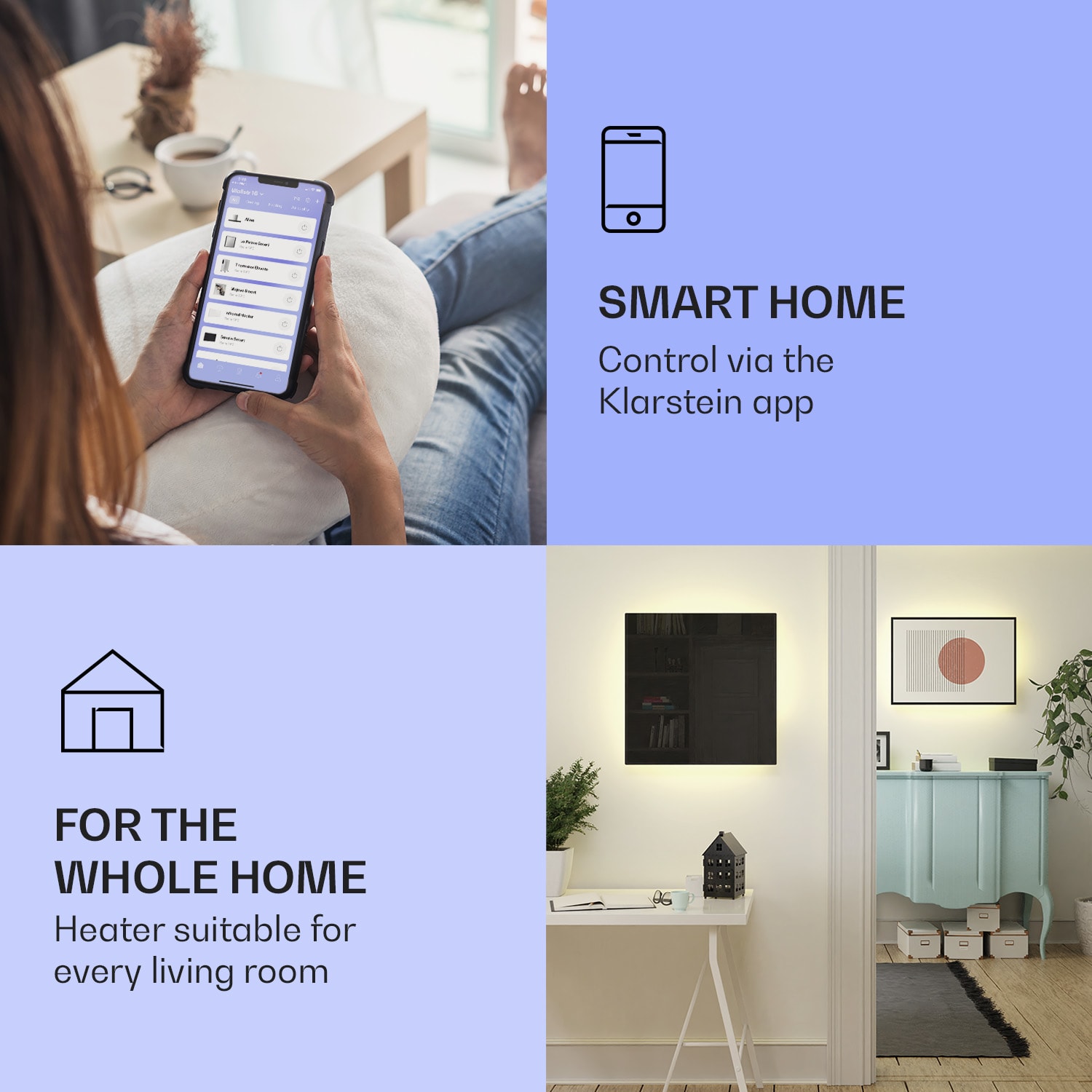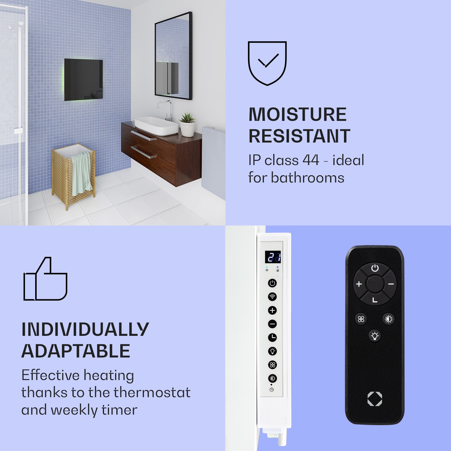 Dvojitý výkon pri rovnakej veľkosti, Klarstein Mojave ohrievače 2 v 1 šikovne kombinujú infračervený sálavý ohrievač s konvektorom a tým nielen rýchlo vytvárajú citeľné infračervené teplo v priestorovo úspornom dizajne, ale vytvárajú aj príjemne teplý vzduch v miestnosti prostredníctvom tepla stúpajúceho zo zadnej strany. V závislosti od veľkosti miestnosti si môžete vybrať ohrievač s výkonom 500, 750, alebo 1000 W. Termostat, ktorý možno nastaviť v stupňoch, a týždenný časovač sa ovládajú veľmi inteligentne prostredníctvom aplikácie Klarstein alebo diaľkovým ovládaním. Vďaka ochrannej triede IP44 sú konvektory ideálne aj do kúpeľne. Nezáleží na tom, kam zavesíte svoj nový vykurovací panel Klarstein Mojave Smart, so svojím farebným ambientným svetlom RGB vytvorí tú správnu atmosféru, nech ste kdekoľvek.