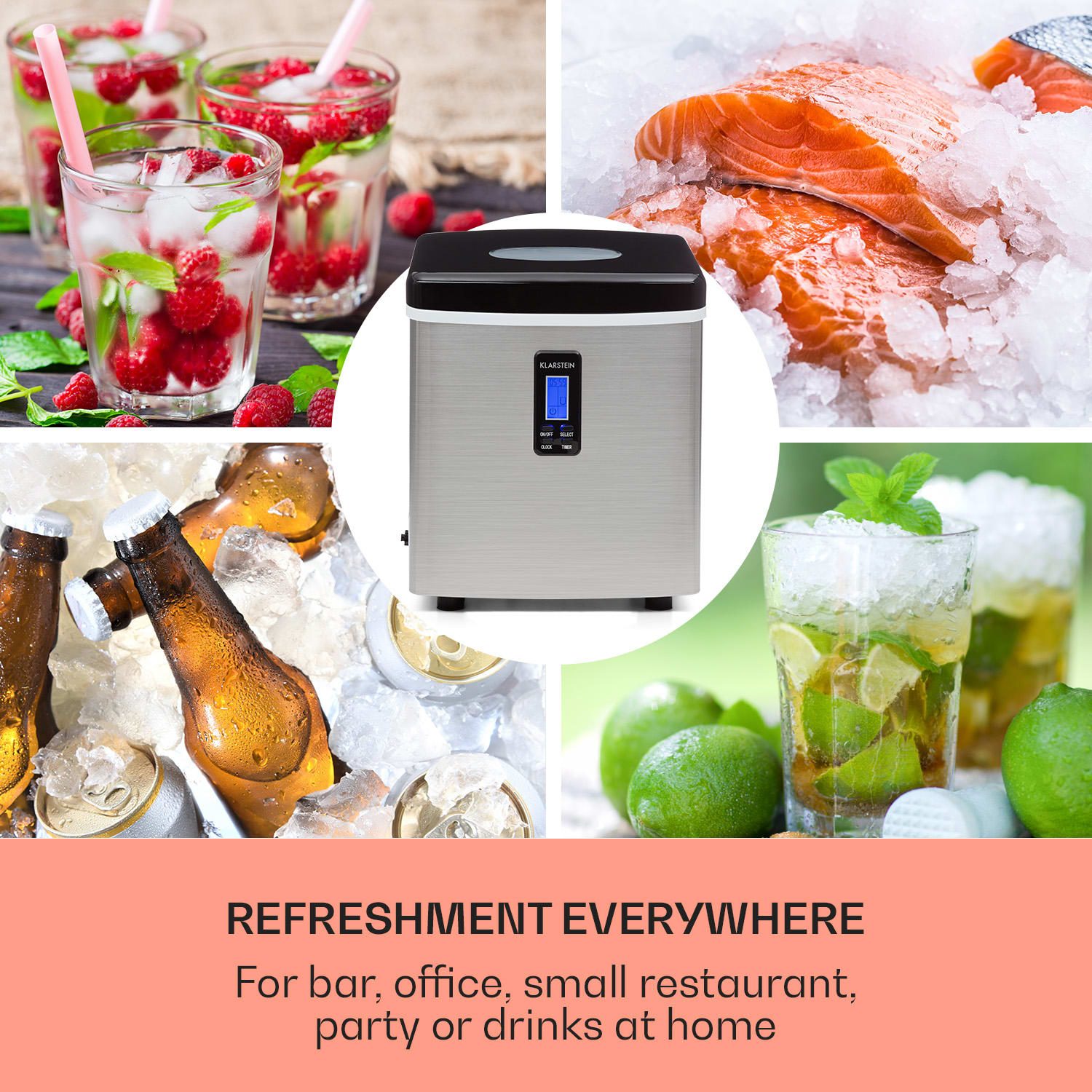 Klarstein Mr. Black-Frost je stroj na výrobu ľadu, ktorý Vám pri organizovaní menších a stredne veľkých podujatí pomôže spoľahlivo pokryť spotrebu ľadu.Toto zariadenie prispôsobené aj na používanie v menších kuchyniach totiž dokáže v priebehu 24 hodín vyprodukovať približne 15 kilogramov ľadových kociek. Jeho 150-wattový motor pritom pracuje veľmi ticho a svojím chodom neruší rozhovory hostí, ktorí sa chcú baviť.Čo sa týka obsluhy, je výrobník ľadu Mr. Black-Frost vďaka ľahko pochopiteľnému 4-tlačidlovému konceptu obsluhy veľmi intuitívny. Jeho ovládací panel umožňuje okrem iného nastavenie veľkosti ľadu (3 rôzne veľkosti). Množstvo vyrobeného ľadu je možné kontrolovať cez praktické okienko umiestnené na vrchnej strane zariadenia.Toto zariadenie na výrobu ľadu z dielne značky Klarstein bolo podrobné testu TÜV. Výsledky potvrdili, že ním vyrobené kocky ľadu a jeho vnútorné materiály majú neutrálnu chuť a sú bez zápachu.