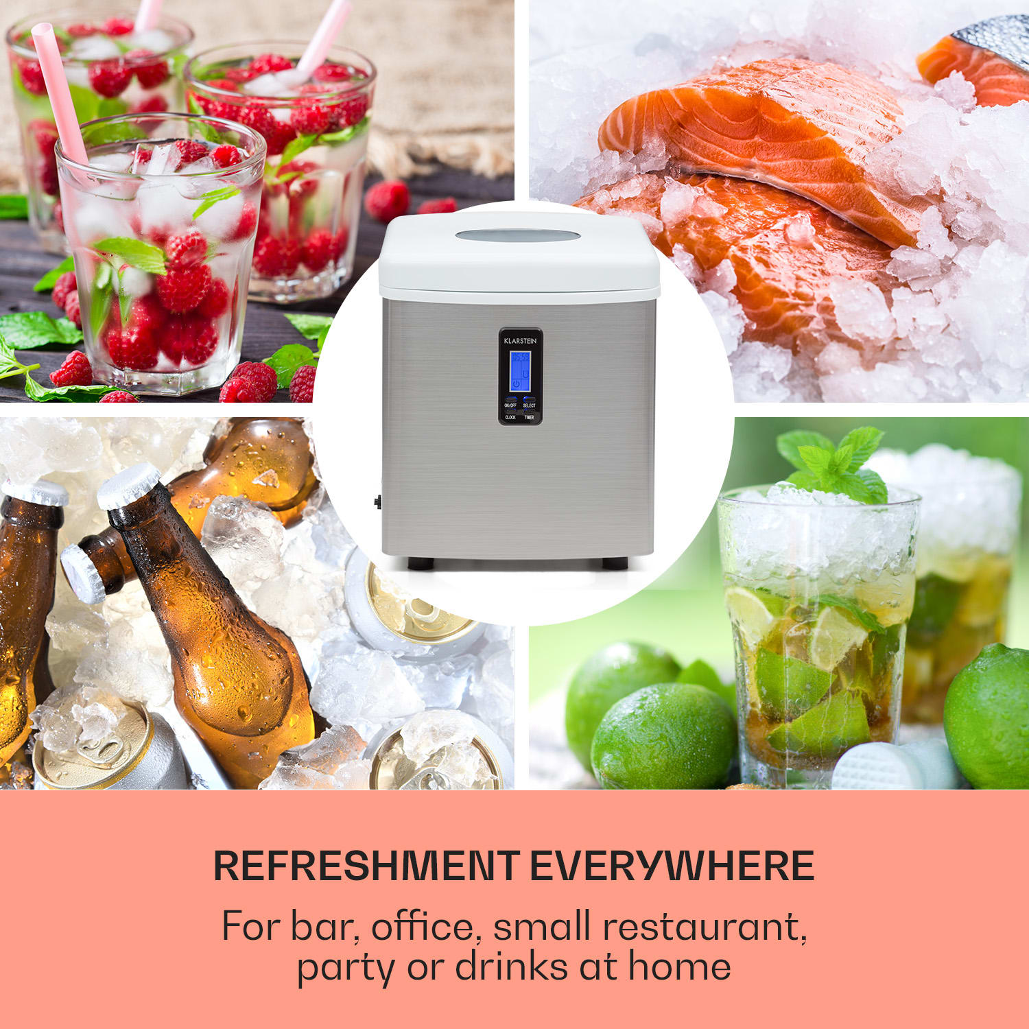 Klarstein Mr. Black-Frost je stroj na výrobu ľadu, ktorý Vám pri organizovaní menších a stredne veľkých podujatí pomôže spoľahlivo pokryť spotrebu ľadu.Toto zariadenie prispôsobené aj na používanie v menších kuchyniach totiž dokáže v priebehu 24 hodín vyprodukovať približne 15 kilogramov ľadových kociek. Jeho 150-wattový motor pritom pracuje veľmi ticho a svojím chodom neruší rozhovory hostí, ktorí sa chcú baviť.Čo sa týka obsluhy, je výrobník ľadu Mr. Black-Frost vďaka ľahko pochopiteľnému 4-tlačidlovému konceptu obsluhy veľmi intuitívny. Jeho ovládací panel umožňuje okrem iného nastavenie veľkosti ľadu (3 rôzne veľkosti). Množstvo vyrobeného ľadu je možné kontrolovať cez praktické okienko umiestnené na vrchnej strane zariadenia.Toto zariadenie na výrobu ľadu z dielne značky Klarstein bolo podrobné testu TÜV. Výsledky potvrdili, že ním vyrobené kocky ľadu a jeho vnútorné materiály majú neutrálnu chuť a sú bez zápachu.
