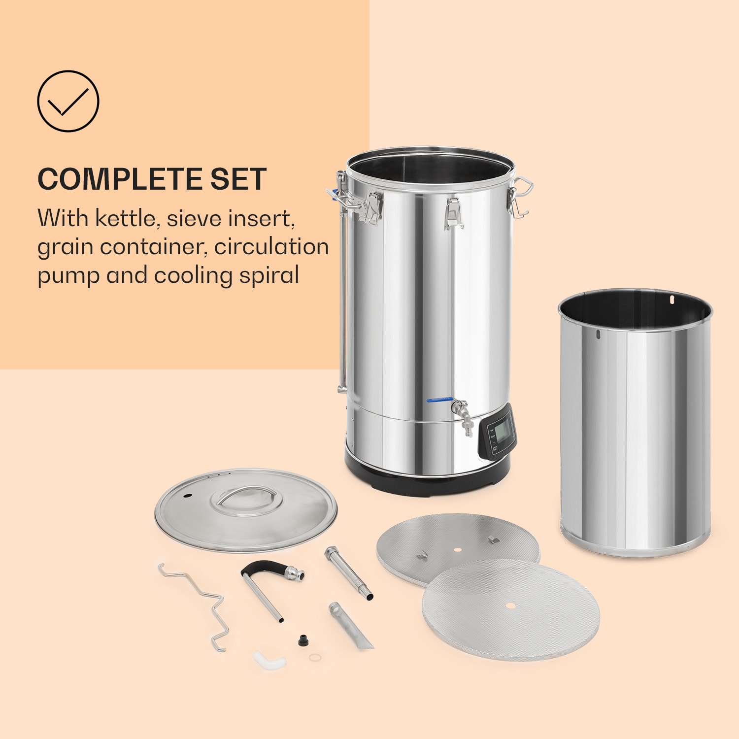 Či už ide o svetlé alebo tmavé, vrchne alebo spodne kvasené, pšeničné alebo plzenské pivo, Klarstein Mundschenk 3XL rmutovací kotol je kompletný balík na varenie piva – poskytuje domácemu pivovaru tú správnu originálnu mladinu. Na prehľadnom LCD displeji s ovládacími tlačidlami môžete presne nastaviť teplotu, čas varenia a výkon, alebo môžete celý proces prenechať na automatické ovládanie MemoryBrew-. Čerstvé pivo z vlastného domáceho pivovaru? Nič nemôže byť jednoduchšie: s kotlom na varenie Klarstein Mundschenk 3XL Upozornenie: V Nemecku sa varenie piva musí nahlásiť príslušnému hlavnému colnému úradu.