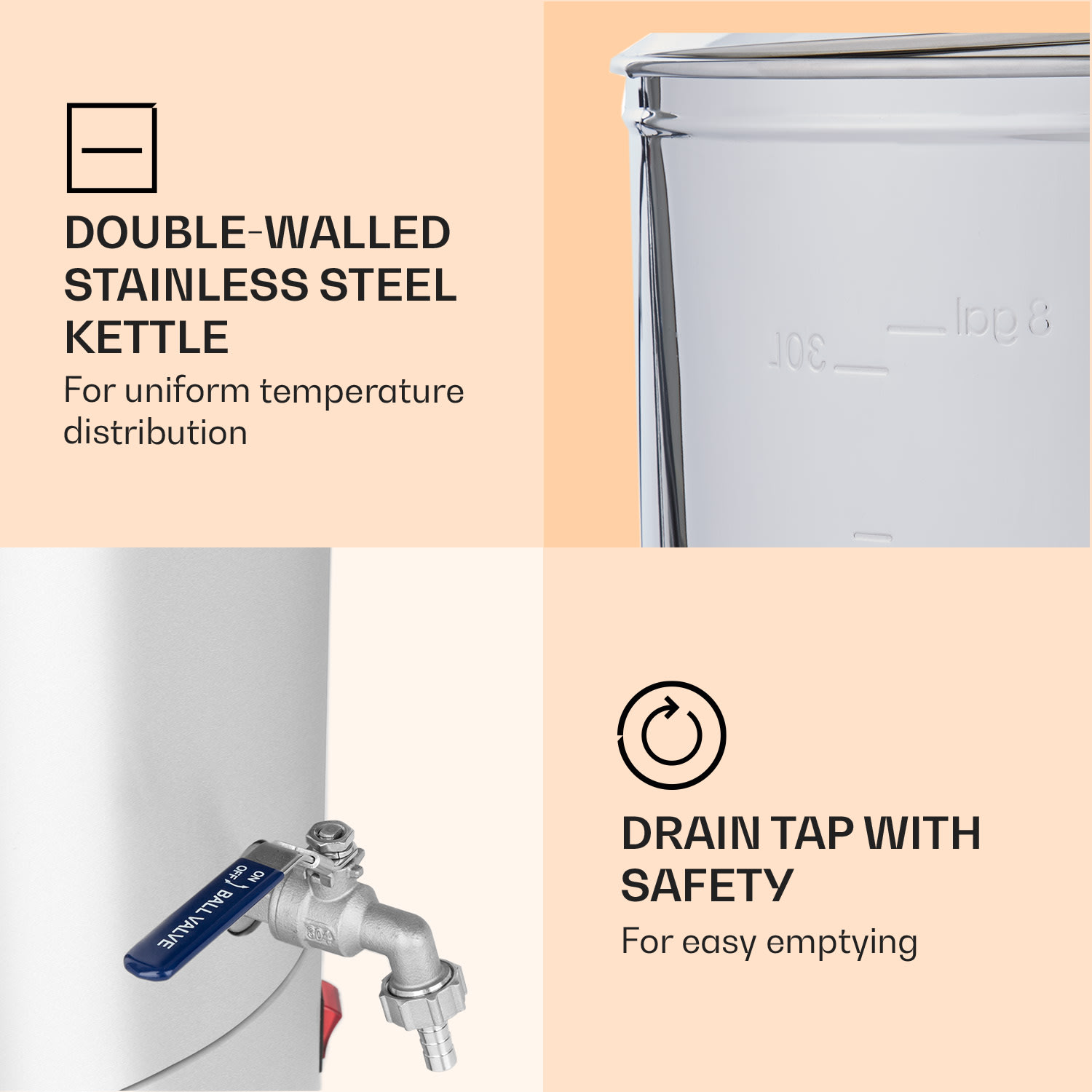 Či už ide o svetlé alebo tmavé, vrchne alebo spodne kvasené, pšeničné alebo plzenské pivo, Klarstein Mundschenk rmutovací kotol je kompletný balík na varenie piva – poskytuje domácemu pivovaru tú správnu originálnu mladinu. Na prehľadnom LCD displeji s ovládacími tlačidlami môžete presne nastaviť teplotu, čas varenia a výkon, alebo môžete celý proces prenechať na automatické ovládanie MemoryBrew-. Čerstvé pivo z vlastného domáceho pivovaru? Nie je nič jednoduchšie: s kotlom na varenie Klarstein Mundschenk Upozornenie: V Nemecku sa varenie piva musí nahlásiť príslušnému hlavnému colnému úradu.