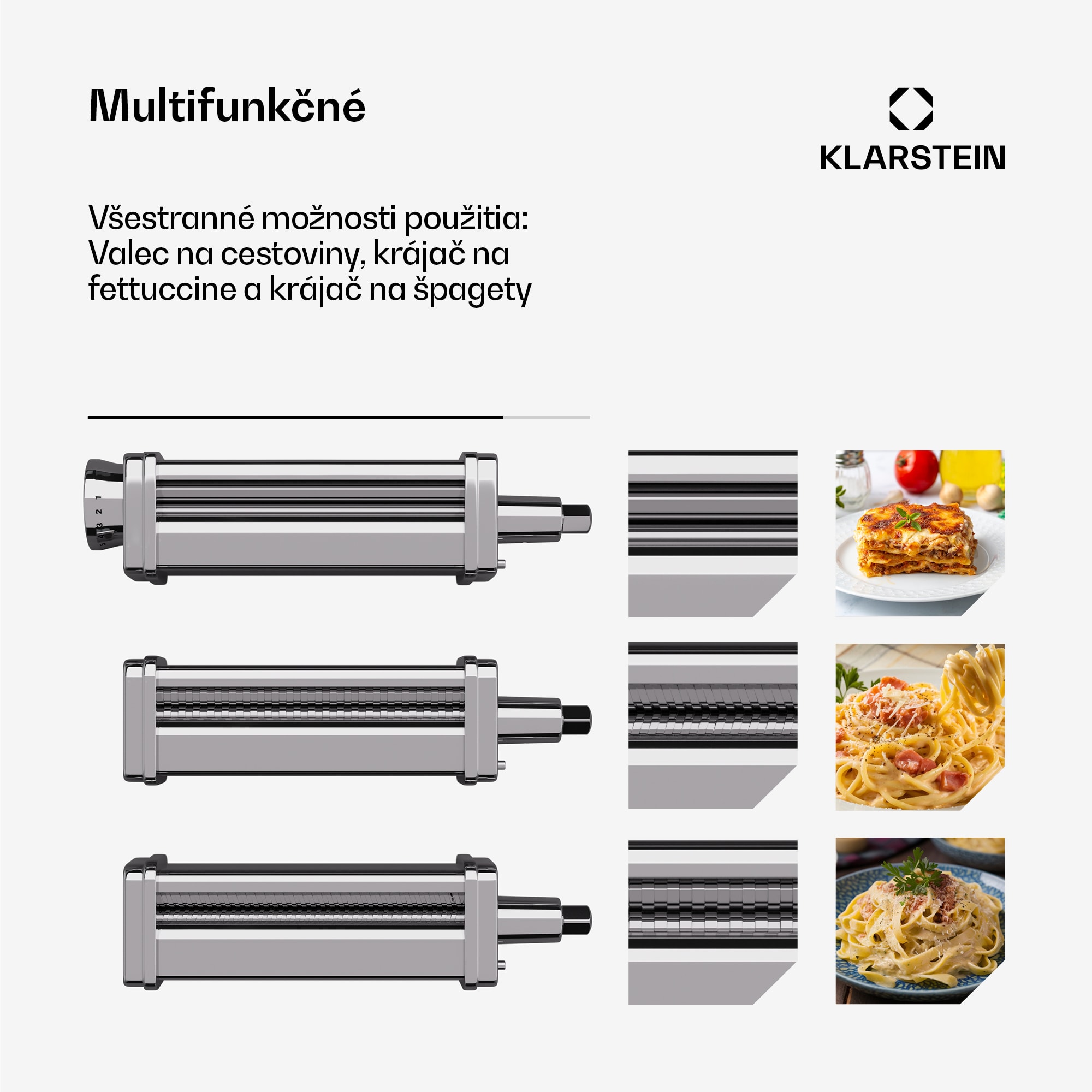 Nástavec na cestoviny Klarstein premení váš kuchynský robot Klarstein Chiara na všestranný výrobník cestovín a prinesie do vašej kuchyne radosť.Nástavec na cestoviny Klarstein Chiara je skutočne všestranný. Vďaka svojim trom funkciám – valček na cestoviny, krájač na fettuccine a krájač na špagety – otvára svet chutných variácií cestovín. Osem nastaviteľných hrúbok umožňuje prispôsobiť plátky cesta presne podľa vašich preferencií a vytvoriť tradičné cestoviny, špagety, fettuccine, lasagne a ďalšie. Ak máte radi cestoviny a vlastníte kuchynský robot Klarstein Chiara , tento nadstavec je presne to, čo potrebujete na rozšírenie svojich kuchárskych zručností.Rozšírte svoj kuchynský robot Klarstein Chiara o nadstavec na cestoviny a vychutnajte si domáce cestoviny pripravené do dokonalosti!