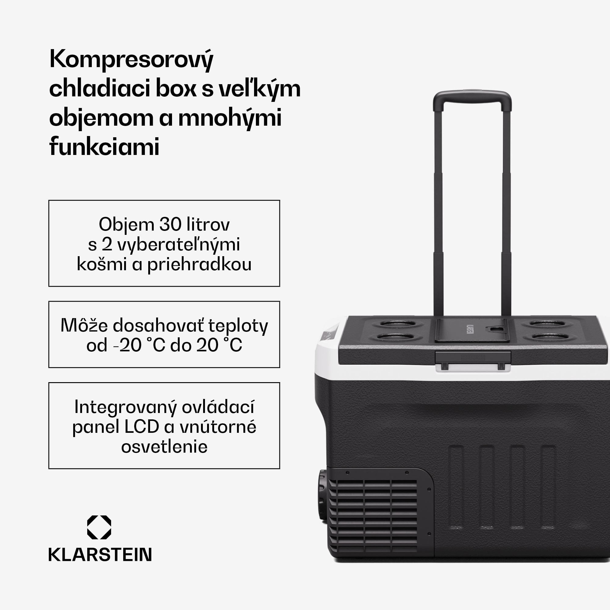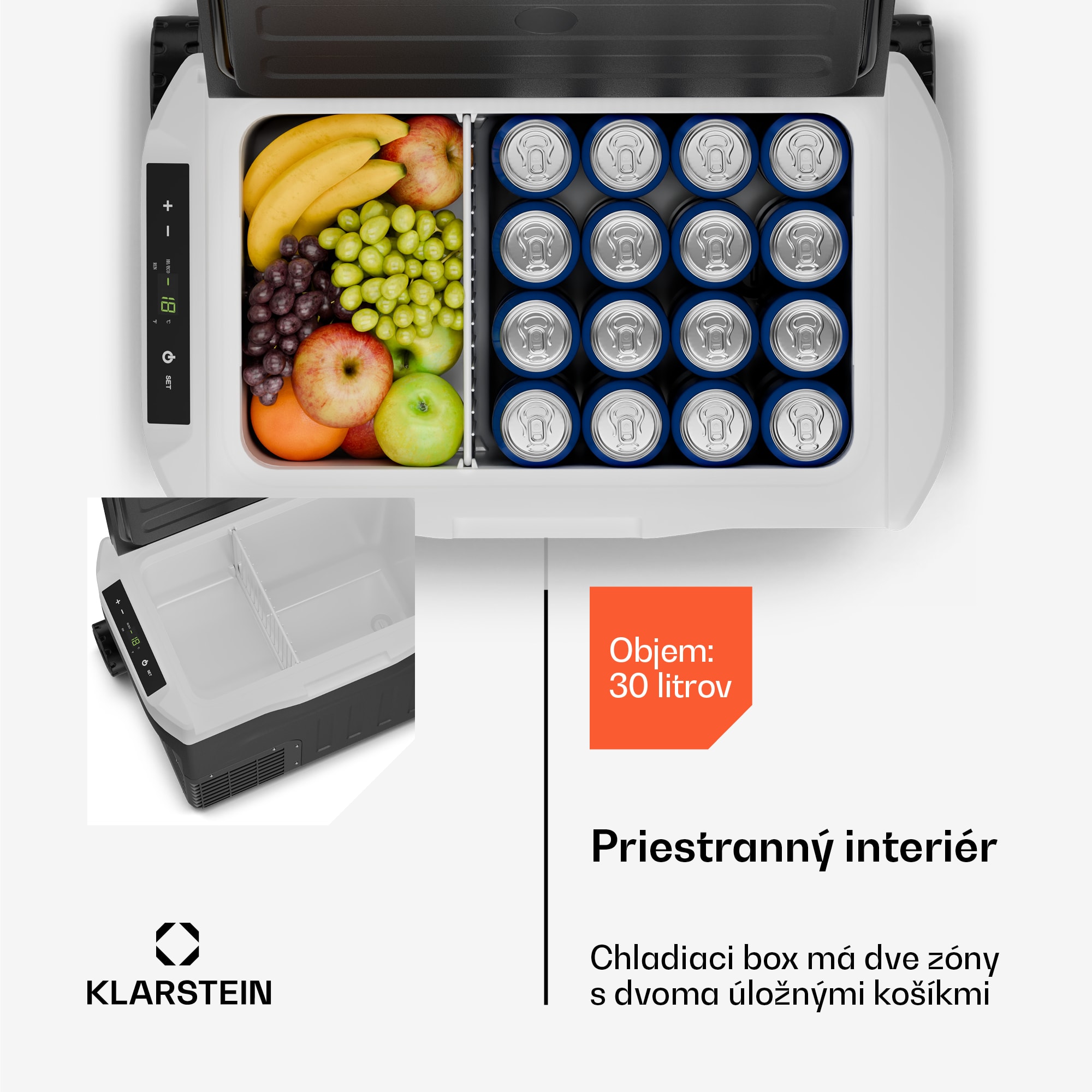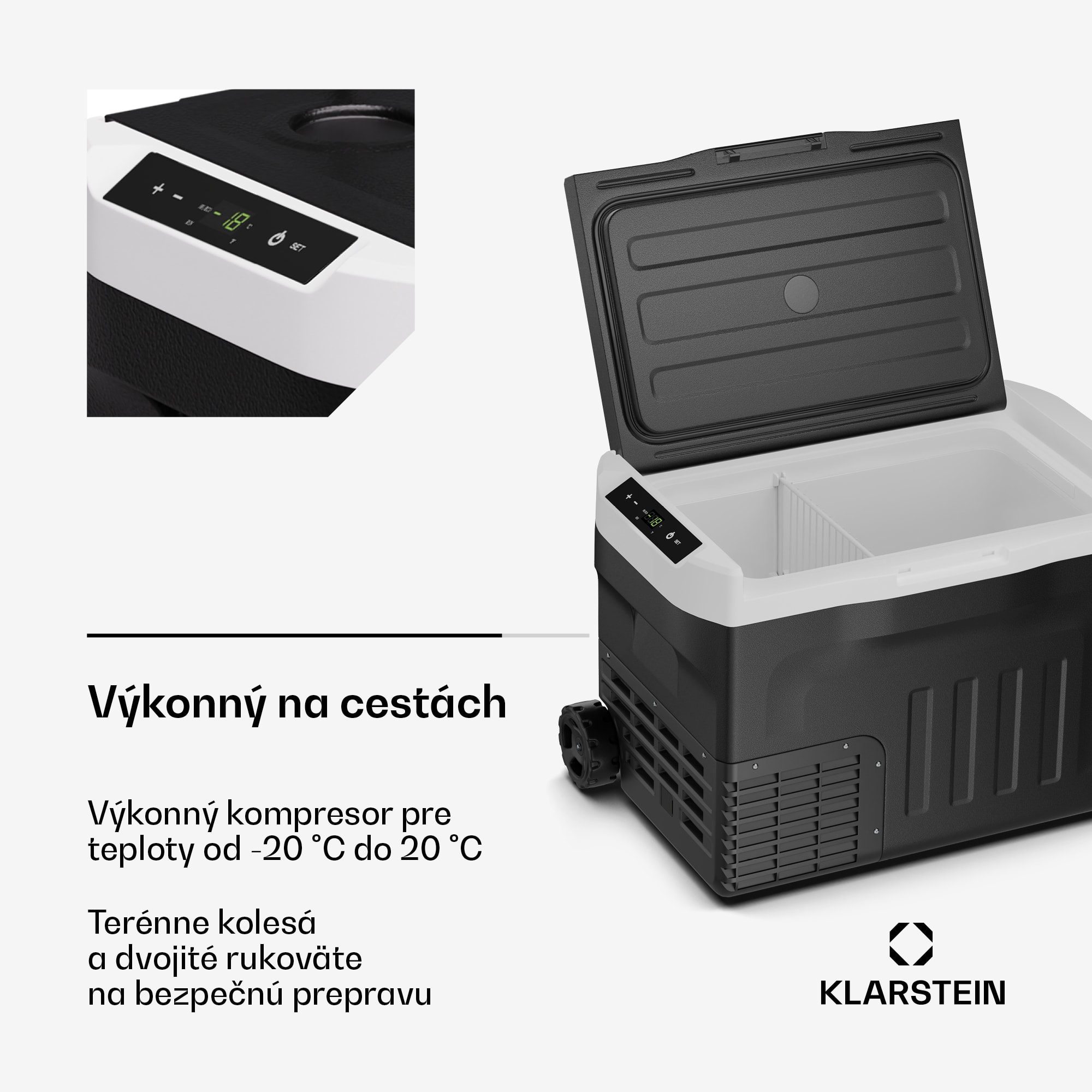 Kompresorový chladiaci box Klarstein PolarForce 30L je ideálnym spoločníkom na všetky vaše dobrodružstvá – či už ide o kempovanie, výlety, plavby loďou alebo dlhé cesty autom. Tento prenosný chladiaci box s veľkorysým objemom 30 litrov ponúka dostatok priestoru na uskladnenie rôznych potravín a nápojov. Vďaka výkonnej kompresorovej technológii môže chladiaci box dosiahnuť teplotu od -20 °C do 20 °C, takže vaše zásoby zostanú vždy optimálne chladené alebo zmrazené.Integrovaný ovládací LCD panel umožňuje jednoduchú a presnú reguláciu teploty, zatiaľ čo dva vyberateľné koše a priehradka uľahčujú organizáciu a prístup k potravinám. Kompresorový chladiaci box Klarstein PolarForce 30L je vybavený robustnými terénnymi kolesami a dvojitými rukoväťami, vďaka čomu sa ľahko prepravuje aj v náročnom teréne. Má tiež trojstupňové monitorovanie batérie, ktoré chráni batériu vozidla pred preťažením a vybitím.Či už v aute, na lodi alebo doma – vďaka svojej všestrannosti a výkonu je kompresorový chladiaci box Klarstein PolarForce 30L ideálnym riešením pre každého, kto sa na cestách nechce zaobísť bez čerstvých potravín.Poznámka: Pred prvým použitím nechajte chladiaci box 24 hodín vo zvislej polohe.