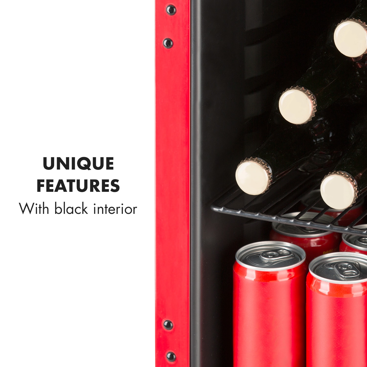 Zo štýlovej chladničky na nápoje Klarstein PopLife v retro vzhľade päťdesiatych rokov chutia čerstvo vychladené pochúťky obzvlášť výborne. Či už nápoje, alebo občerstvenie: štýlovo kompaktná chladnička PopLife má vo svojom 48-litrovom interiéri vždy nejakú drobnosť na zahryznutie. Vďaka svojej triede energetickej účinnosti E pracuje mimoriadne šetrne k životnému prostrediu. Pomocou veľkého regulátora na zadnej strane sa dá teplota nastaviť individuálne na hodnotu medzi 0 a 10 stupňami. Dvere s dvojitým sklom nielen dobre vyzerajú, ale tiež poskytujú rýchly prehľad o obsahu chladničky na nápoje. Interiér má štýlovú čiernu farbu, čo umocňuje luxusný efekt zariadenia. Ohnivá farba a zaoblené tvary vyžarujú nadčasový retro šarm a z chladničky robia v akejkoľvek miestnosti dekoratívny doplnok domácnosti. Kompaktná, praktická, s dokonalými tvarmi: retro chladnička PopLife od spoločnosti Klarstein. Táto chladnička na nápoje je ideálnym riešením pre každého, kto hľadá štýlový a funkčný doplnok do domácnosti.