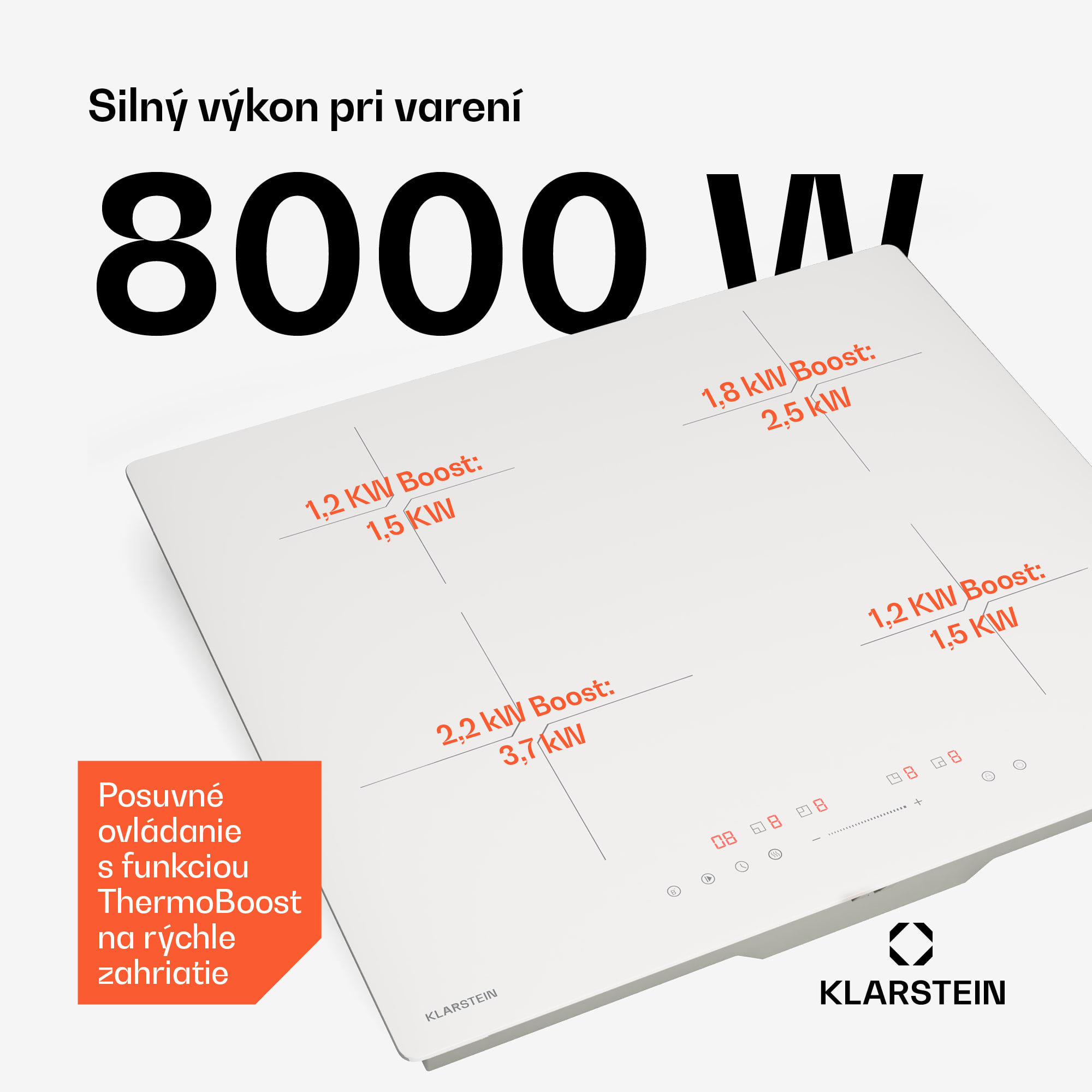 Indukčná varná doska Klarstein PowerGlide – vysoký výkon pre vašu kuchyňu.So 4 indukčnými zónami s funkciou boost, výkonom 6400 W a 8000 W pri Power Boost a 9 úrovňami ohrevu budú vaše pokrmy hotové za okamih.Precízne varenie a dodatočná bezpečnosť vďaka digitálnemu časovaču, ukazovateľu zvyškového tepla, automatickému vypnutiu po 90 minútach a detskej poistke – to všetko sa ovláda pomocou moderného ovládania posuvníkom.Indukčná varná doska Klarstein PowerGlide s tenkým 60 cm dizajnom spĺňa prvotriednu funkčnosť a umožňuje efektívne a bezpečné varenie.Upozornenie: Farba produktu sa môže mierne líšiť od zobrazenia na fotografii.