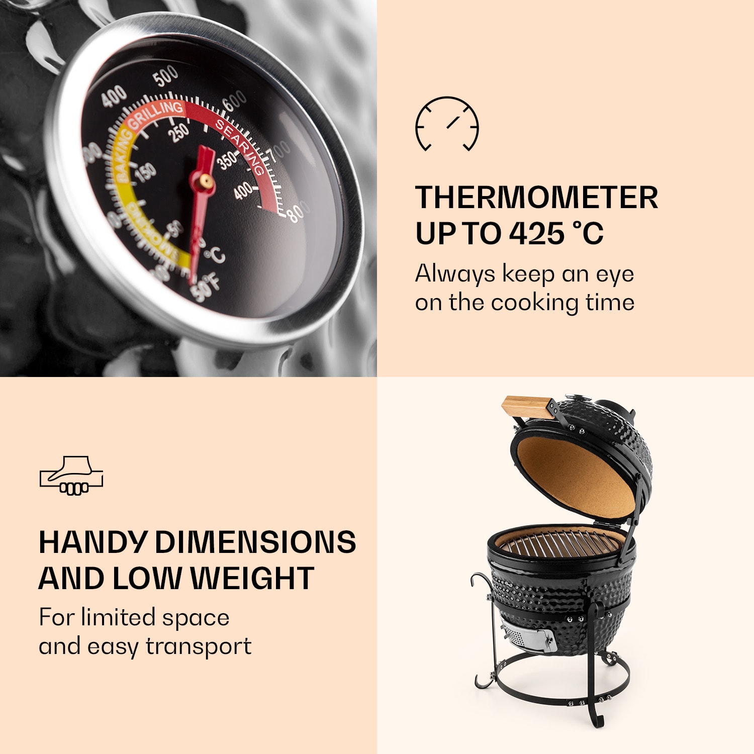 Objavte kamado, keramický barbecue zázrak z USA. Kamado grily, inšpirované japonskou rúrou na ryžu, nadchli v 60. rokoch gril majstrov na celkom svete. Klarstein prináša s kamado grilom Princesize výhody a tajomstvá oválneho keramického grilu k Vám domov. Keď ho raz vyskúšate, už sa ho nikdy nevzdáte! Pretože keramický gril je vybavený výhodami, s ktorými tradičné grily súperiť nedokážu. 2 cm hrubá keramická stena má mimoriadnu schopnosť udržiavania vysokej teploty. Prijíma teplo, rovnomerne ho rozdeľuje a odovzdáva ho po celom vnútri. Vďaka vzduchotesnému veku dosahuje keramický gril s extrémne malým množstvom paliva – až o 50% menej uhlia ako tradičné grily – teploty v rozmedzí od 50 °C do 425 °C. K tomu oválny tvar vytvára tepelný podtlak ako pri normálnej rúre, ktorý sa dá ovládať prostredníctvom posúvacieho vetráka na spodnej strane zariadenia. Veľmi jednoducho možno teda regulovať teplotu vo vnútri a používať zariadenie Princesize nielen ako klasický gril s roštom na grilovanie, ale aj na pomalé pečenie počas dlhých hodín (slowcooking) alebo na údenie. Farebný teplomer na veku zobrazuje vnútornú teplou a uľahčuje reguláciu teploty. Materiál a forma keramického grilu Princesize od spoločnosti Klarstein udržiavajú vlhkosť vo vnútri, takže grilované jedlo nevyschne a ostane vyslovene šťavnaté. Prekvapte Vašich blízkych dokonalými rebierkami alebo steakmi a bravčovým mäsom v novom horizonte grilovania. Samozrejme môžete pri odklopenom veku piecť na ploche 615 cm². Aj čistenie grilu je veľmi jednoduché. Gril sa jednoducho po použití rozohreje na 350 °C, čím sa vo vnútri vypália sadze, tuk i zvyšky jedál. Kamado záhradný gril Princesize od spoločnosti Klarstein je vhodný predovšetkým pre gril majstrov so stiesnenými priestorovými podmienkami alebo pre tých, ktorý svoj gril radi berú na výlety. Na menšie vzdialenosti sa ľahko prenesie a zmestí sa do kufra auta alebo do ručného vozíka. V cieli sa jednoducho rozloží stabilný stojan z ušľachtilej ocele a na neho sa umiestni kupola grilu. Opticky gril Princesize púta pozornosť na každej záhradnej párty: Glazúrovaná, čierna keramika, a stojan z ušľachtilej ocele v liatinovom dizajne garantujú pohľady všetkých hostí nielen na jedlo z keramického grilu od spoločnosti Klarstein. Dostupné farby: čierna glazúra, červená glazúra (produkt 10029124)