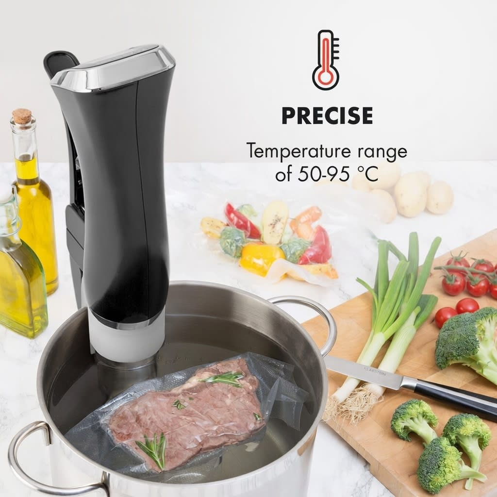 Uvedomelo žiť znamená uvedomelo variť i uvedomelo jesť. Klarstein Quickstick je precízne zariadenie navrhnuté podľa tejto filozofie.Pomocou špeciálneho procesu varenia, ktorý zachováva vitamíny a minerály, šetrne ohrieva až 20 litrov v teplotnom rozsahu od 50 do 95 °C. Vďaka výkonu 1300 W sa obsah ohrieva mimoriadne rýchlo a výkonné obehové čerpadlo zabezpečuje konštantnú teplotu vody. Vďaka tomu je ideálny na varenie pri nízkych teplotách, ohrievanie a udržiavanie tepla. Ovládanie pomocou dotykového displeja LCD je hračka. Zdravo a bezpečne: inteligentné automatické vypínanie zabraňuje pripáleniu a pretečeniu.