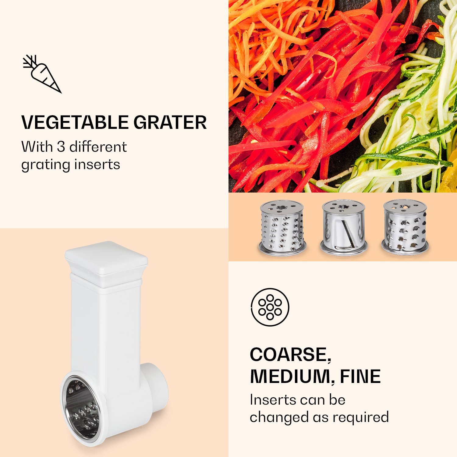 Premeňte svoj kuchynský robot Renata na praktické strúhadlo na zeleninu a vráťte ručné krájanie zeleniny do minulosti. Vylepšite svoje šaláty a jedlá jemnými plátkami uhoriek, čerstvo nastrúhaným kalerábom, najjemnejšími pásikmi mrkvy a mnohými ďalšími, ktoré vám dodajú dôležité vitamíny a živiny. Nadstavec na strúhanie šalátu Renata od spoločnosti Klarstein je nevyhnutným príslušenstvom pre váš kuchynský robot Renata. Jednoducho nasaďte kompletnú hlavu na prednú časť kuchynského robota, vložte čerstvé prísady do plniacej trubice a zatlačte ich pomocou pechovača. Všetko ostatné sa deje samo, pretože príslušné ostré strúhacie nadstavce spoľahlivo krájajú, strúhajú a sekajú zeleninu a ovocie na úplne na najjemnejšie kúsky. Tri nadstavce môžete ľubovoľne meniť na jemné, stredne hrubé a hrubé strúhanie. V záujme dobrej hygieny potravín môžete jednotlivé plastové a nerezové časti čistiť samostatne.Na tenké plátky reďkovky alebo najjemnejší mrkvový šalát: S praktickým nadstavcom na strúhanie šalátu od Klarstein sa z vášho kuchynského robota Renata stane sofistikované kuchynské strúhadlo – takže sa vám každodenné krájanie zeleniny podarí bez problémov!