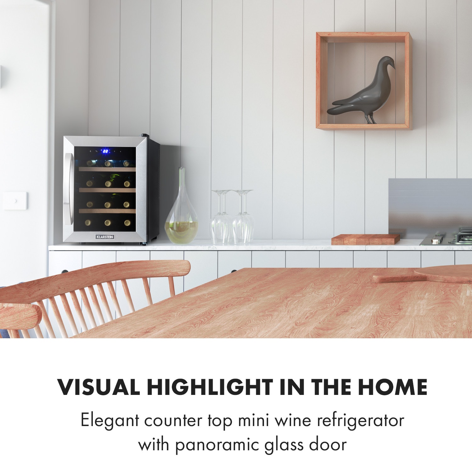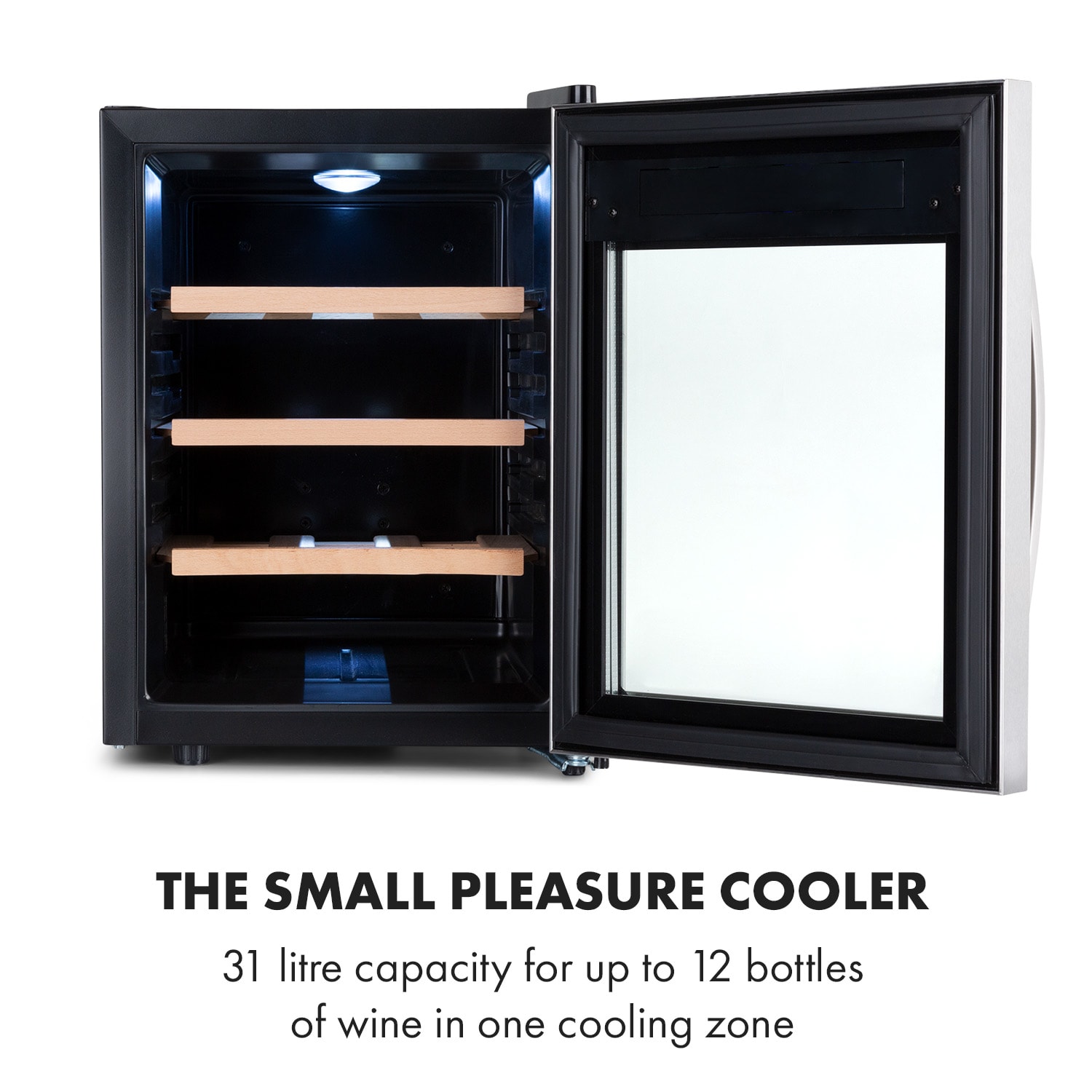 Vynikajúce vína chutia mimoriadne dobre zo štýlovej vinotéky Klarstein Reserva 12 Uno, pretože sú vždy vychladené na tú správnu teplotu pre okamžitý pôžitok.Či už jemné červené víno, šumivé biele alebo svieže ružové: do štýlovej vinotéky Reserva 12 Uno sa zmestí v jednej 31 litrovej chladiacej zóne až do 12 fliaš vína. Všetky fľaše sú prehľadne uložené na štyroch skladovacích úrovniach s tromi výsuvnými drevenými policami. Pomocou dotykového ovládacieho panela a LCD displeja vo vonkajšej strane dvier sa dá teplota nastaviť individuálne a pohodlne na hodnotu medzi 11 a 18 °C. Zapínateľné jasné biele LED svetlo vo vnútri poskytuje potrebný prehľad a dokonalo uvádza obsah vinotéky na scénu.Dvere s dvojitým sklom a rámom z ušľachtilej ocele nielen dobre vyzerajú, ale tiež poskytujú kedykoľvek rýchly prehľad o obsahu chladničky na nápoje Klarstein Reserva 12 Uno. Interiér má štýlovú čiernu farbu, čo umocňuje luxusný efekt zariadenia. Kombinácia skla, ušľachtilej ocele a svetla robí z vinotéky dekoratívny doplnok každej miestnosti. Vďaka svojim kompaktným rozmerom je okrem toho mini vinotéka Reserva 12 Uno ideálna aj na pracovnú dosku do malých priestorov. Vďaka sotva počuteľnému prevádzkovému hluku s hodnotou iba 26 dB sa dá bez problémov umiestniť aj v spálňach alebo hosťovských izbách.Praktická, s krásnym tvarom a výrazná: vinotéka Reserva 12 Uno od spoločnosti Klarstein.