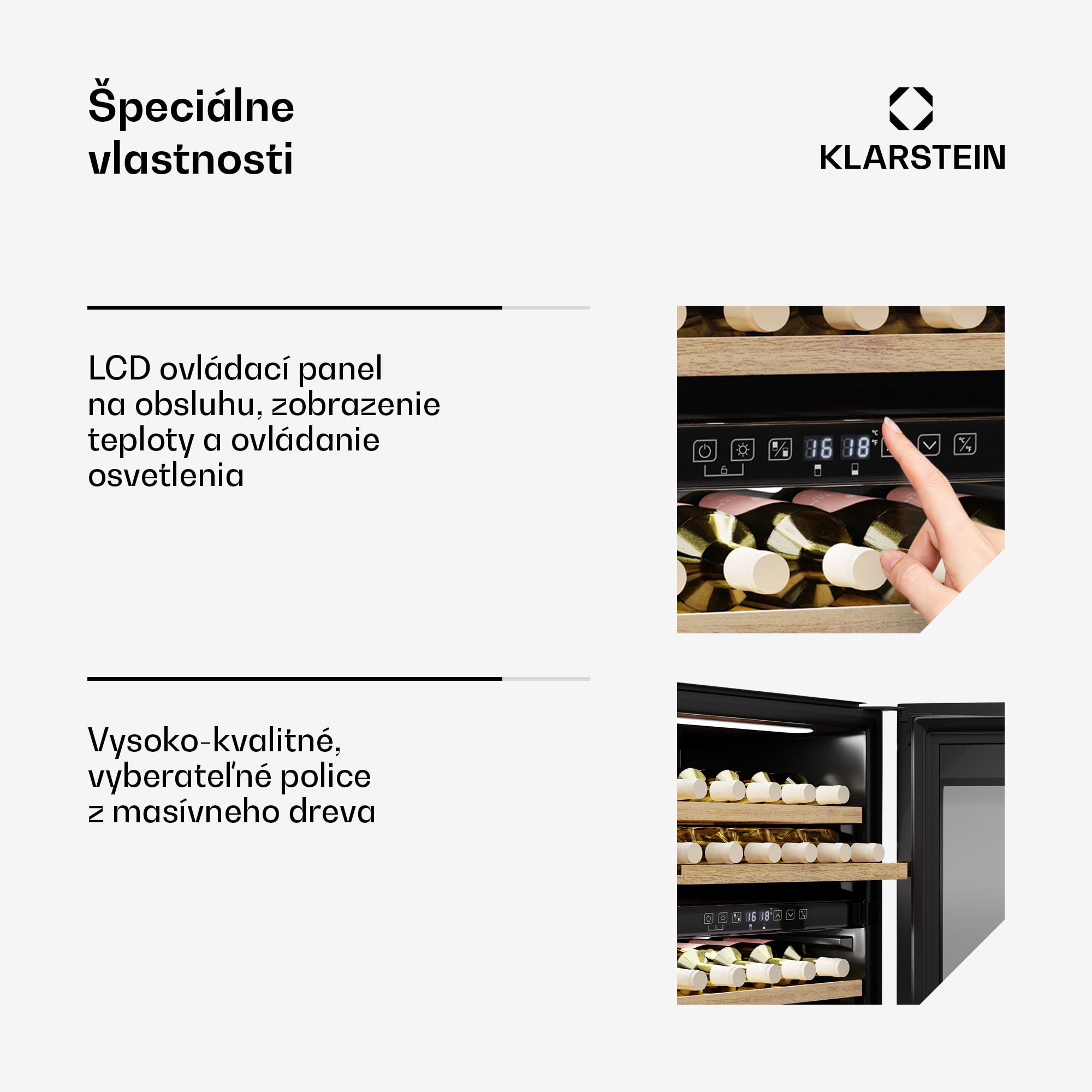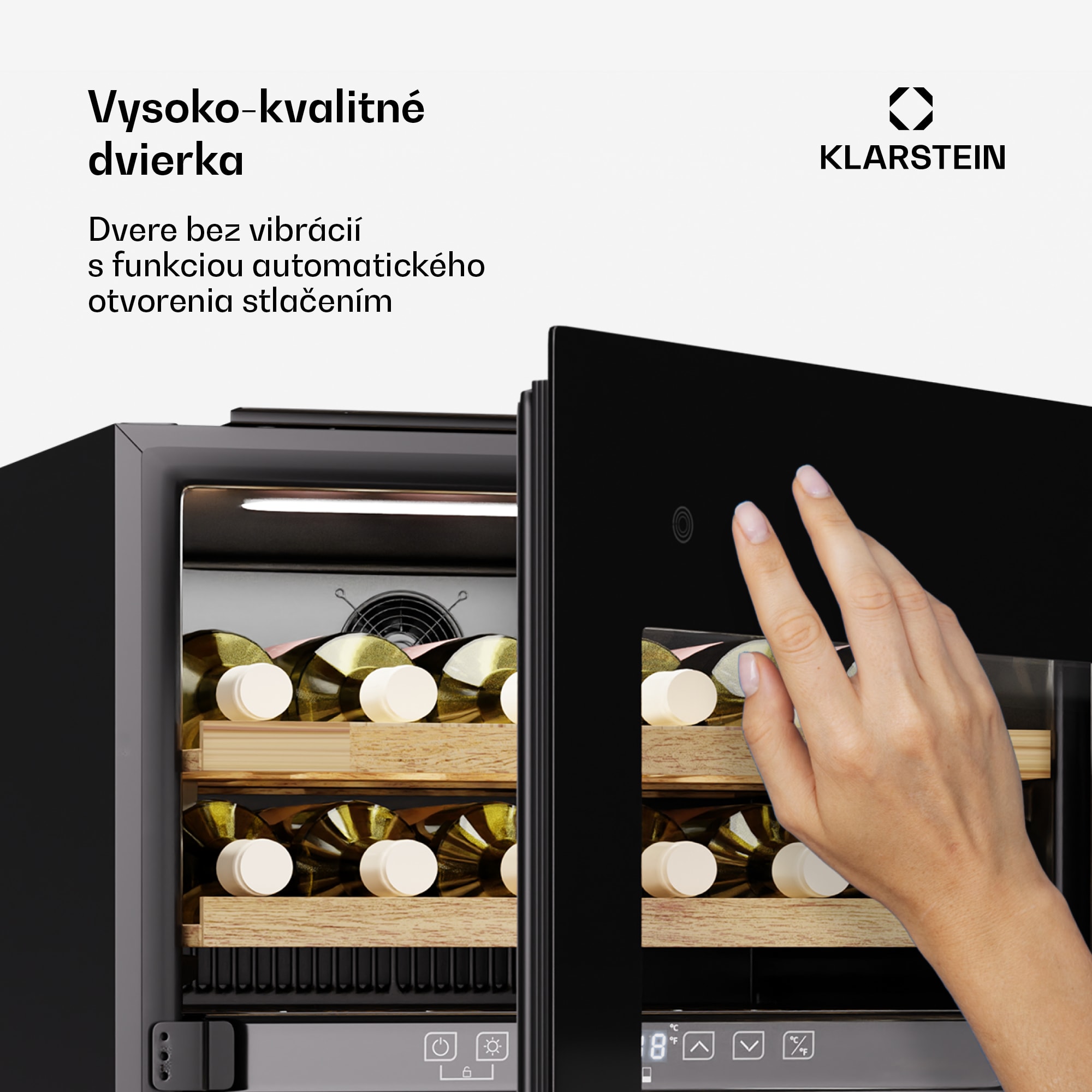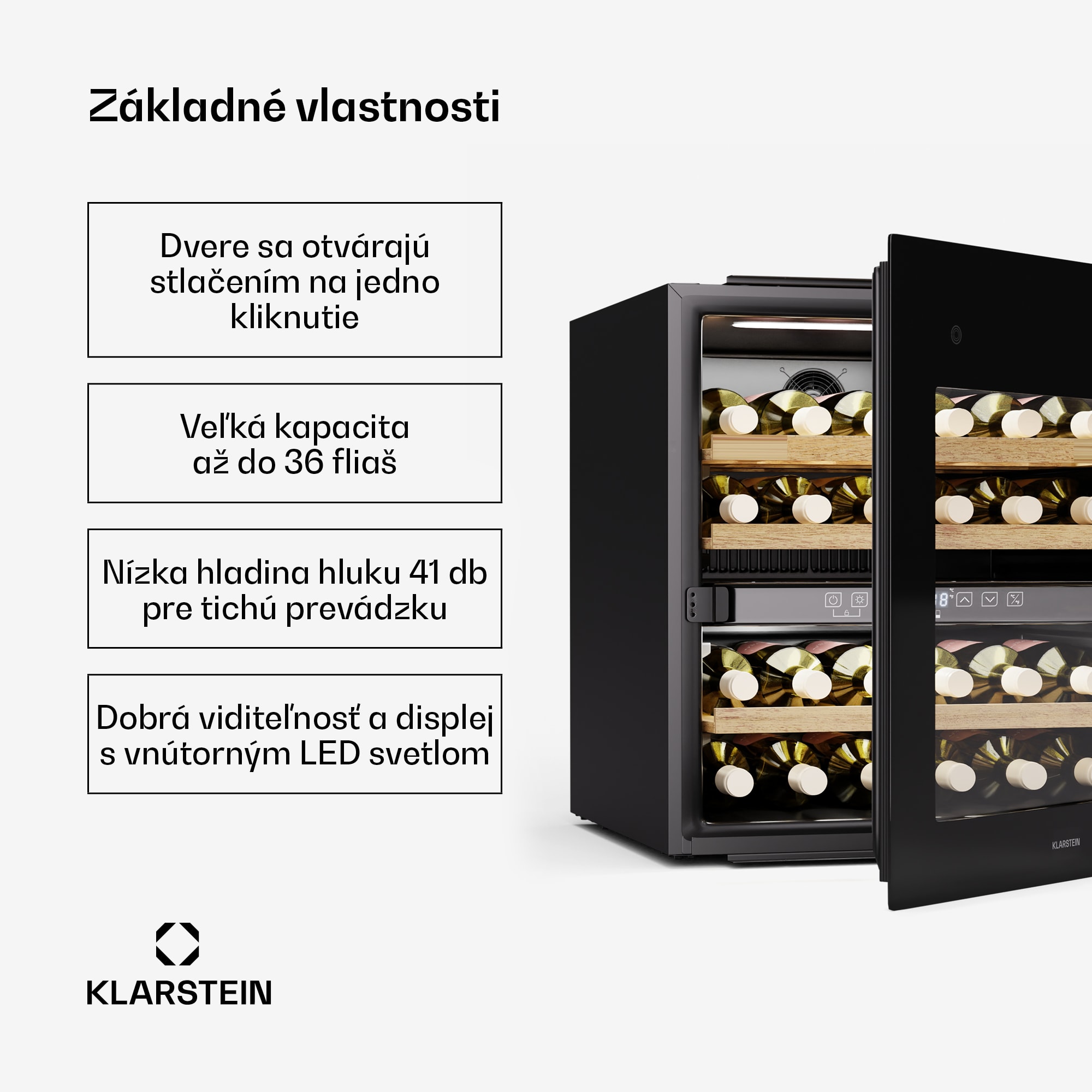 Vinotéka Klarstein Rhone 36 Duo ponúka dokonalú kombináciu štýlového dizajnu a vysokej funkčnosti. Bez problémov sa začlení do vašej kuchyne a poskytuje ideálne úložné priestory pre vaše vína. Táto dvojzónová vinotéka zaujme množstvom funkcií, ktoré potešia milovníkov vína.S kapacitou až 36 fliaš a objemom 85 litrov ponúka dostatok priestoru pre vašu zbierku vín. Ovládanie pomocou LED displeja umožňuje jednoduché nastavenie teploty, zatiaľ čo kvalitné vnútorné LED osvetlenie zabezpečuje optimálnu prezentáciu. Vďaka dômyselnému systému push-to-open s ochranou proti UV žiareniu možno dvere otvoriť jediným kliknutím, zatiaľ čo sklo spoľahlivo chráni vína pred UV žiarením. Odnímateľné police z masívneho dreva ponúkajú nielen atraktívny vzhľad, ale zabezpečujú aj skladovanie bez vibrácií. Chladnička tiež pracuje pri nízkej hlučnosti iba 41 dB, takže ju takmer nepočuť.Uistite sa, že je chladnička na víno správne nainštalovaná a pravidelne čistená, aby sa zabezpečil jej optimálny výkon.Vychutnajte si dokonale vychladené a štýlovo prezentované vína. Objednajte si chladničku na víno Klarstein Rhone 36 Duo už teraz a ochutnajte rozdiel!